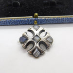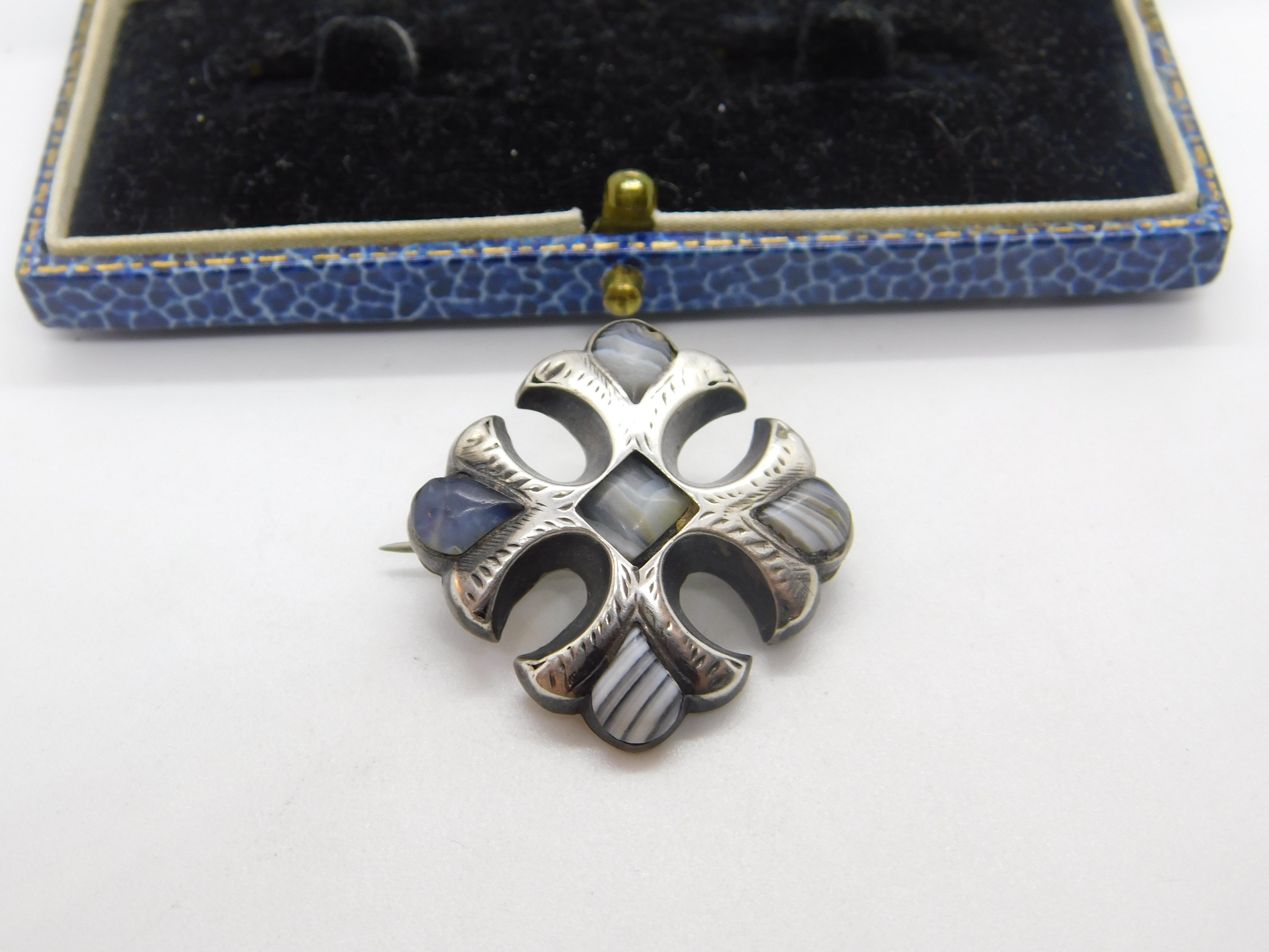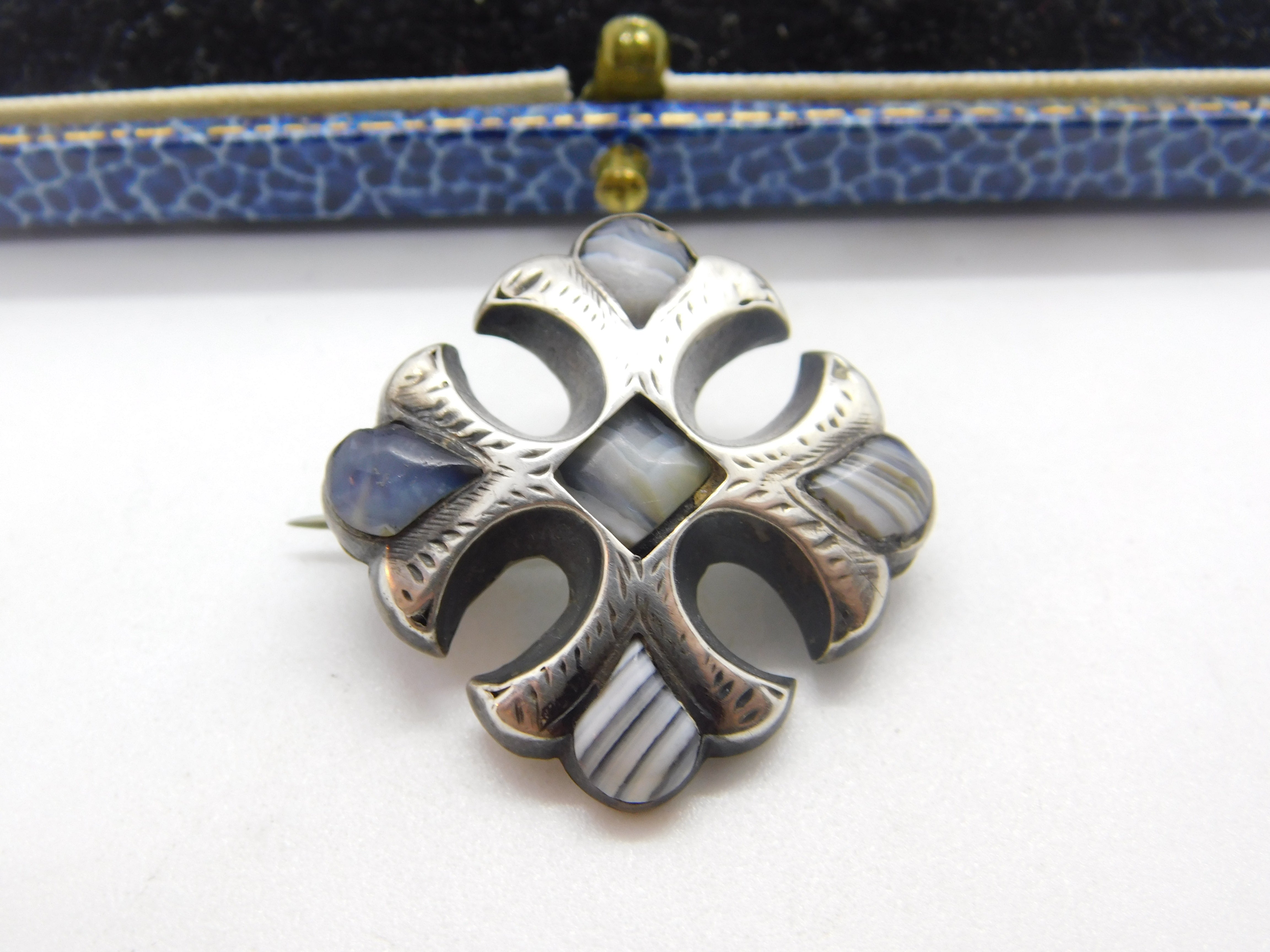 Scottish Victorian Sterling Silver & Montrose Agate Celtic Cross Brooch Antique c1860