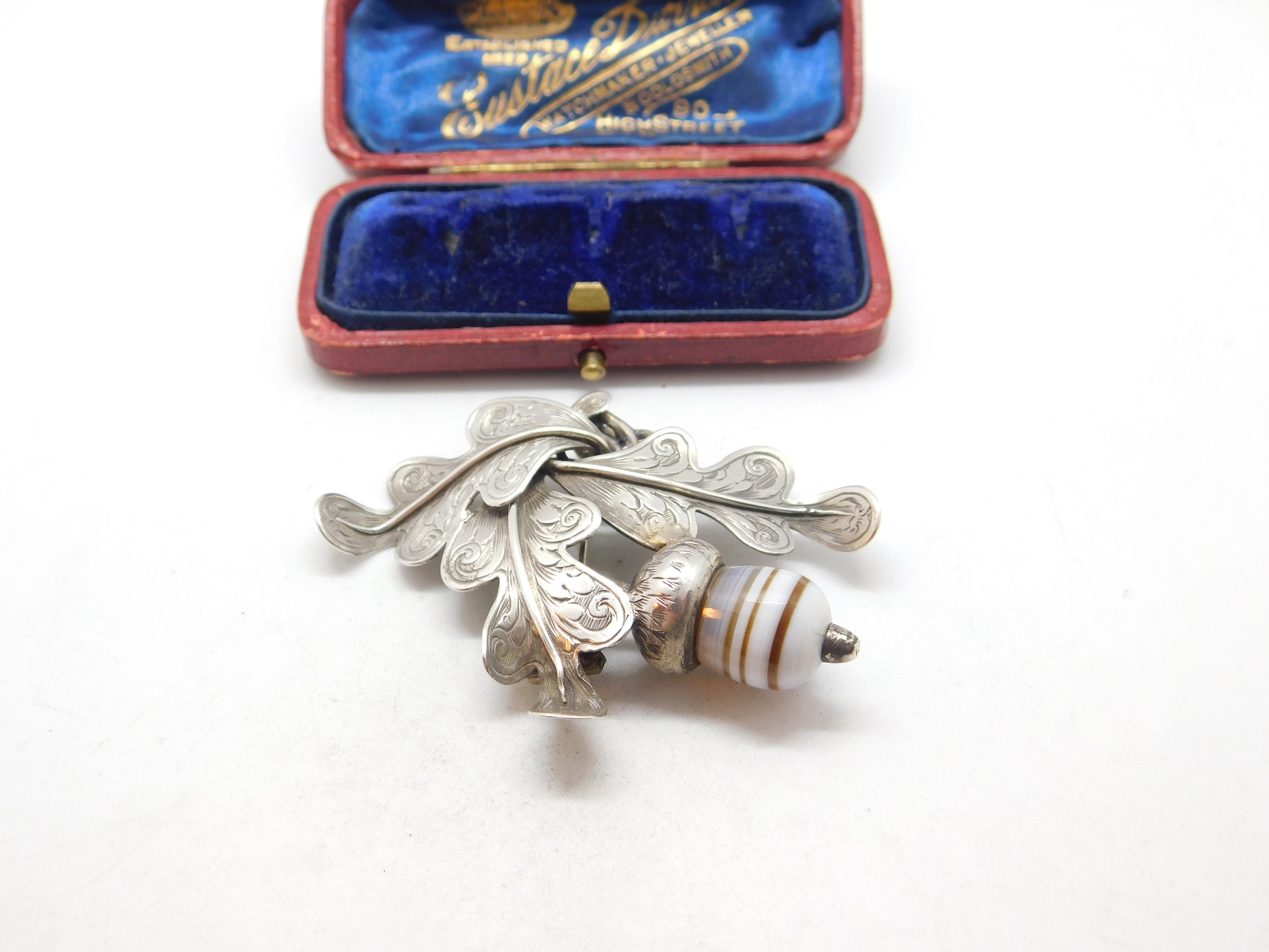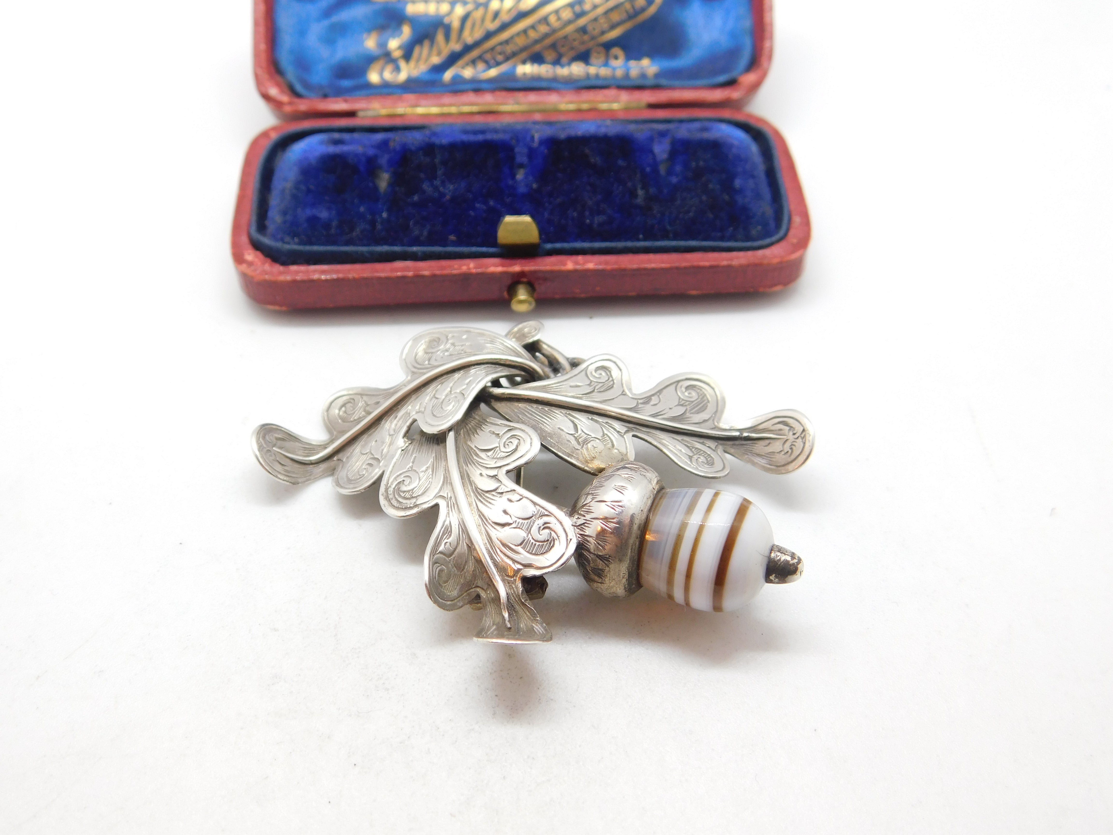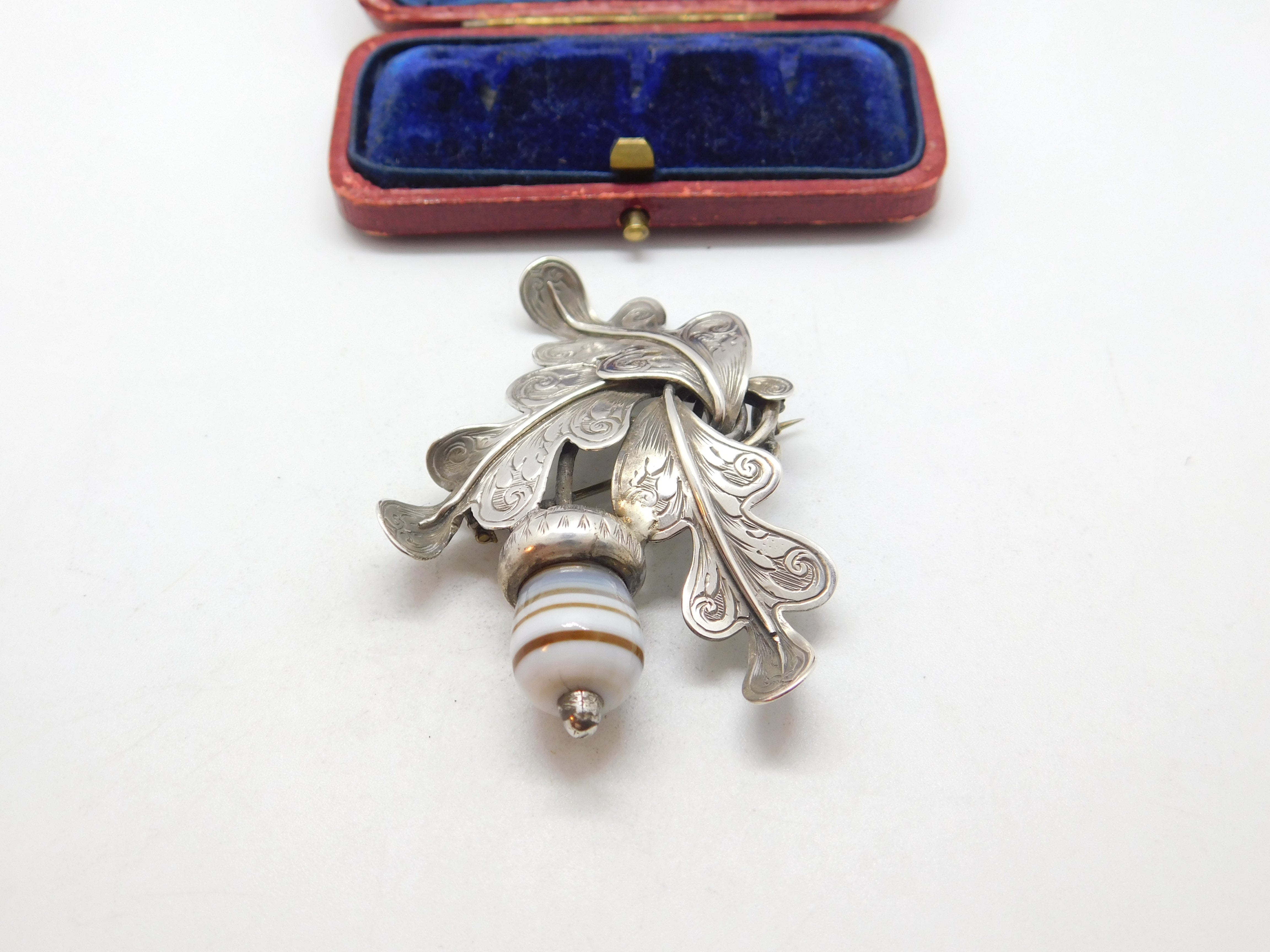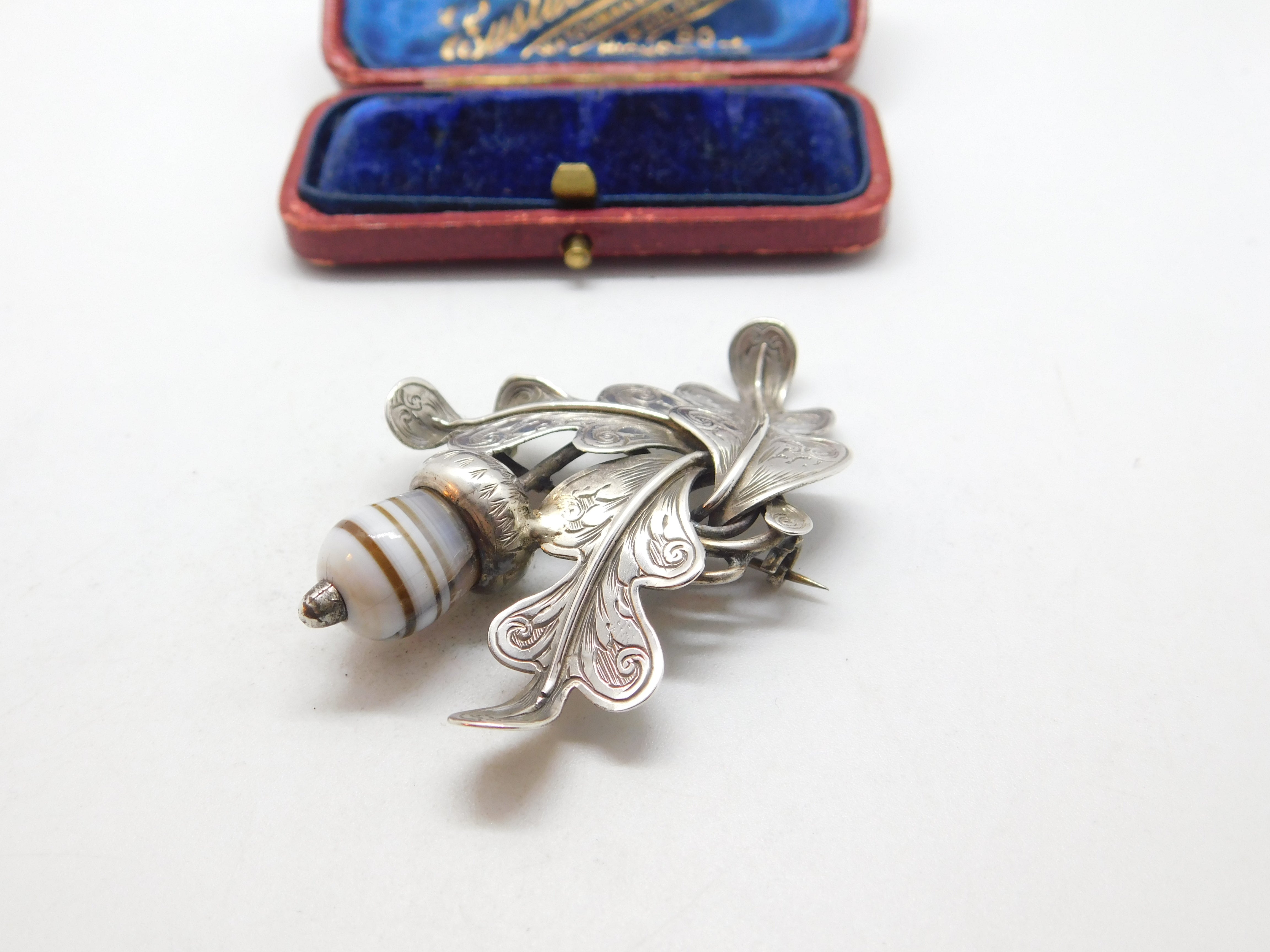 Details: A fantastic and wonderfully designed antique Victorian Scottish sterling silver brooch in the form of an oak leaf with carved banded agate in the form of an acorn c1860 - the silver has been XRF tested. A charming example of Scottish jewellery. This is a wonderful item that would make a perfect gift or addition to any collection. The BOX pictured is for PRESENTATION ONLY and is NOT included in the listings but used to frame the pictures unless specifically stated otherwise.