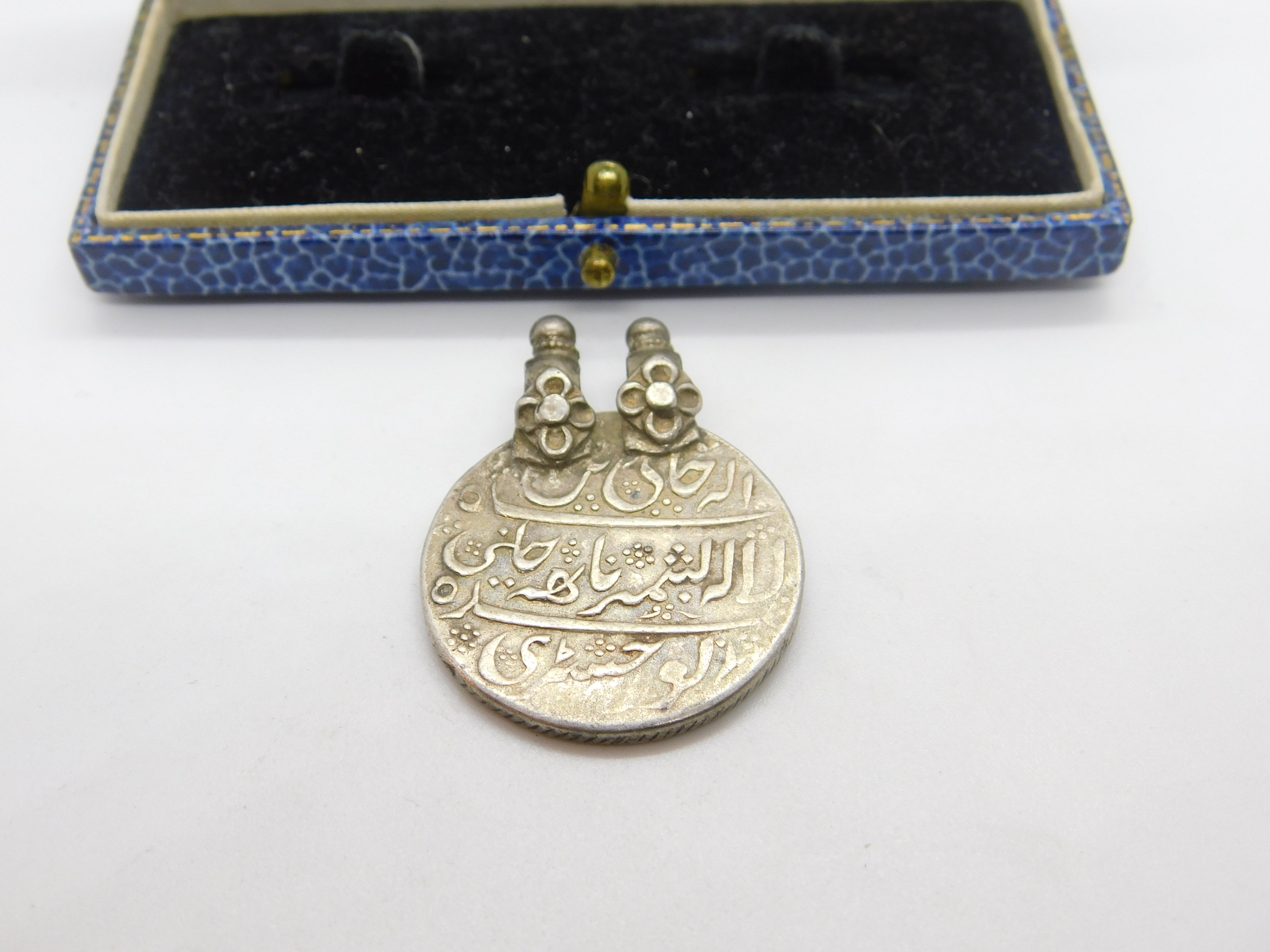 Details: A fantastic and wonderfully designed antique Georgian sterling silver Indian East India Company Bengal one rupee coin dated 1788 crafted into a fob or pendant. This is a wonderful item that would make a perfect gift or addition to any collection. The BOX pictured is for PRESENTATION ONLY and is NOT included in the listings but used to frame the pictures unless specifically stated otherwise.