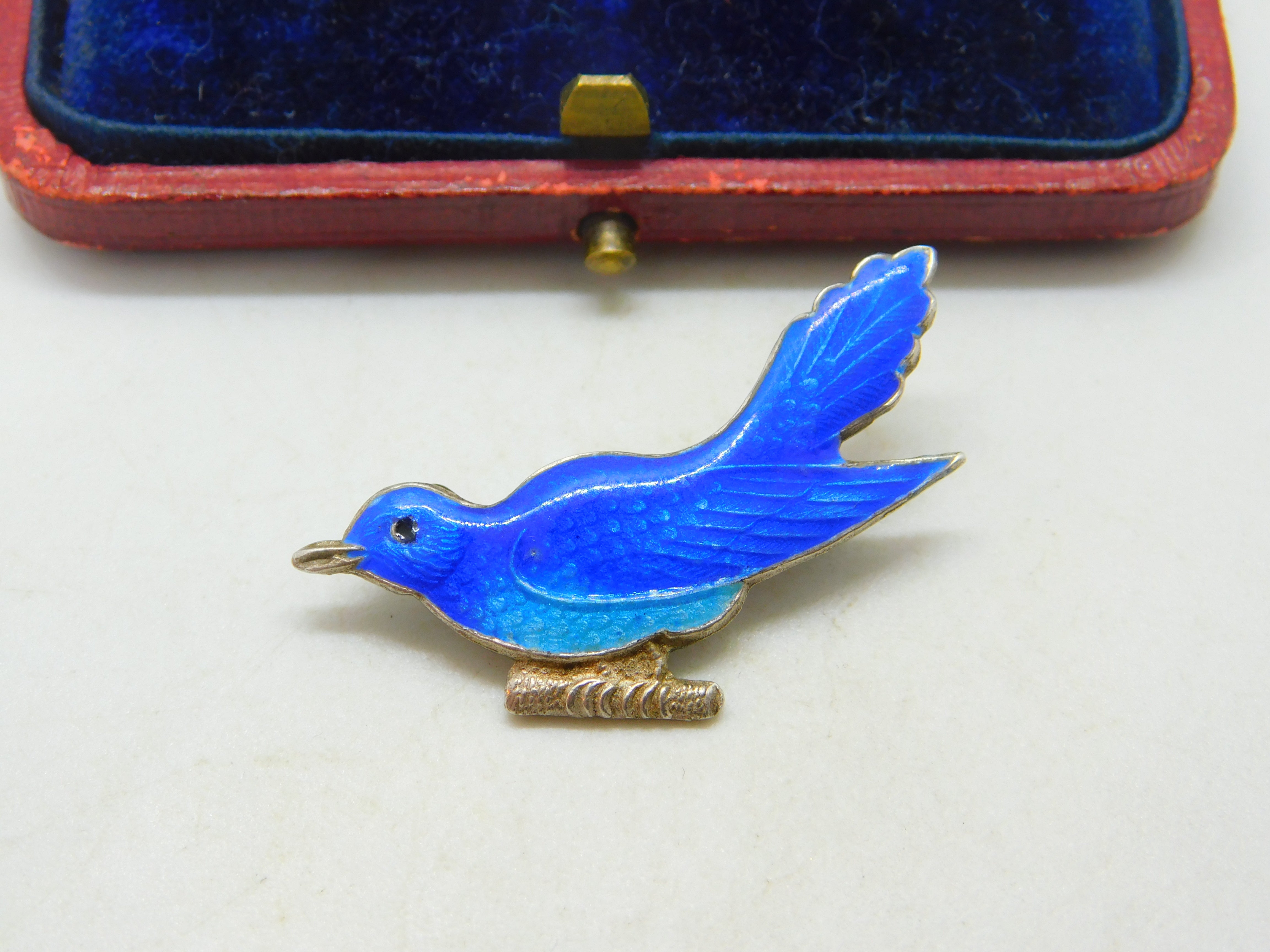 Sterling Silver & Blue Enamel Swallow Sweetheart Brooch Antique c1920 Art Deco