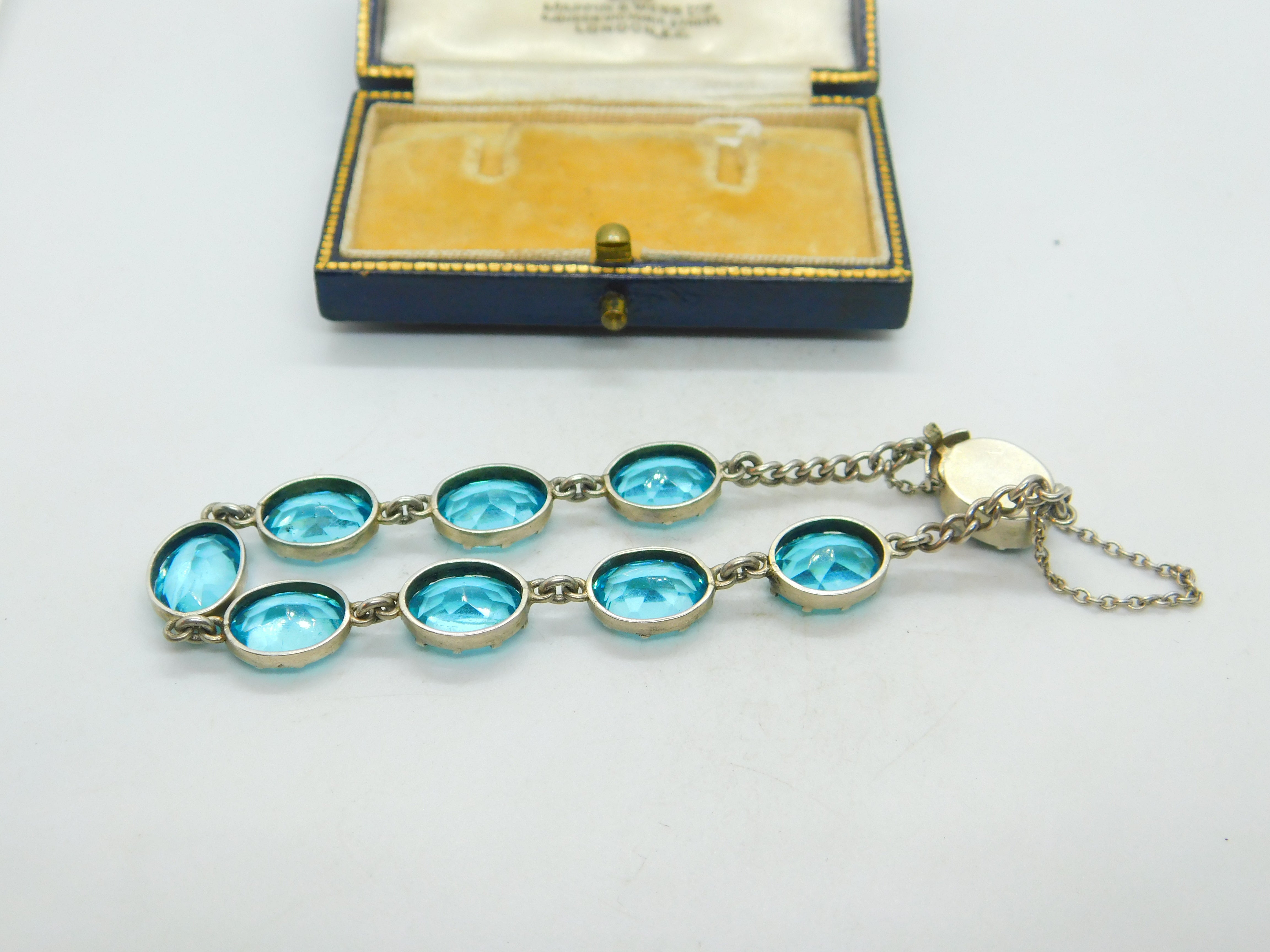 Details: A fantastic and wonderfully designed antique art deco sterling silver & faceted blue zircon bracelet with lovely design c1920.Blue zircon, a dazzling gemstone, captivates with its vibrant blue hues ranging from teal to sky blue. Mined in Cambodia, Sri Lanka, and Myanmar, it's a popular choice for jewelry. Revered for its brilliance and exceptional clarity, blue zircon symbolizes spiritual growth and promotes positive energy, making it a cherished gem. This is a wonderful item that would make a perfect gift or addition to any collection. The BOX pictured is for PRESENTATION ONLY and is NOT included in the listings but used to frame the pictures unless specifically stated otherwise.