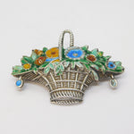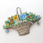 Sterling Silver Floral Enamel Cornucopia Basket Brooch Pin Antique c1940