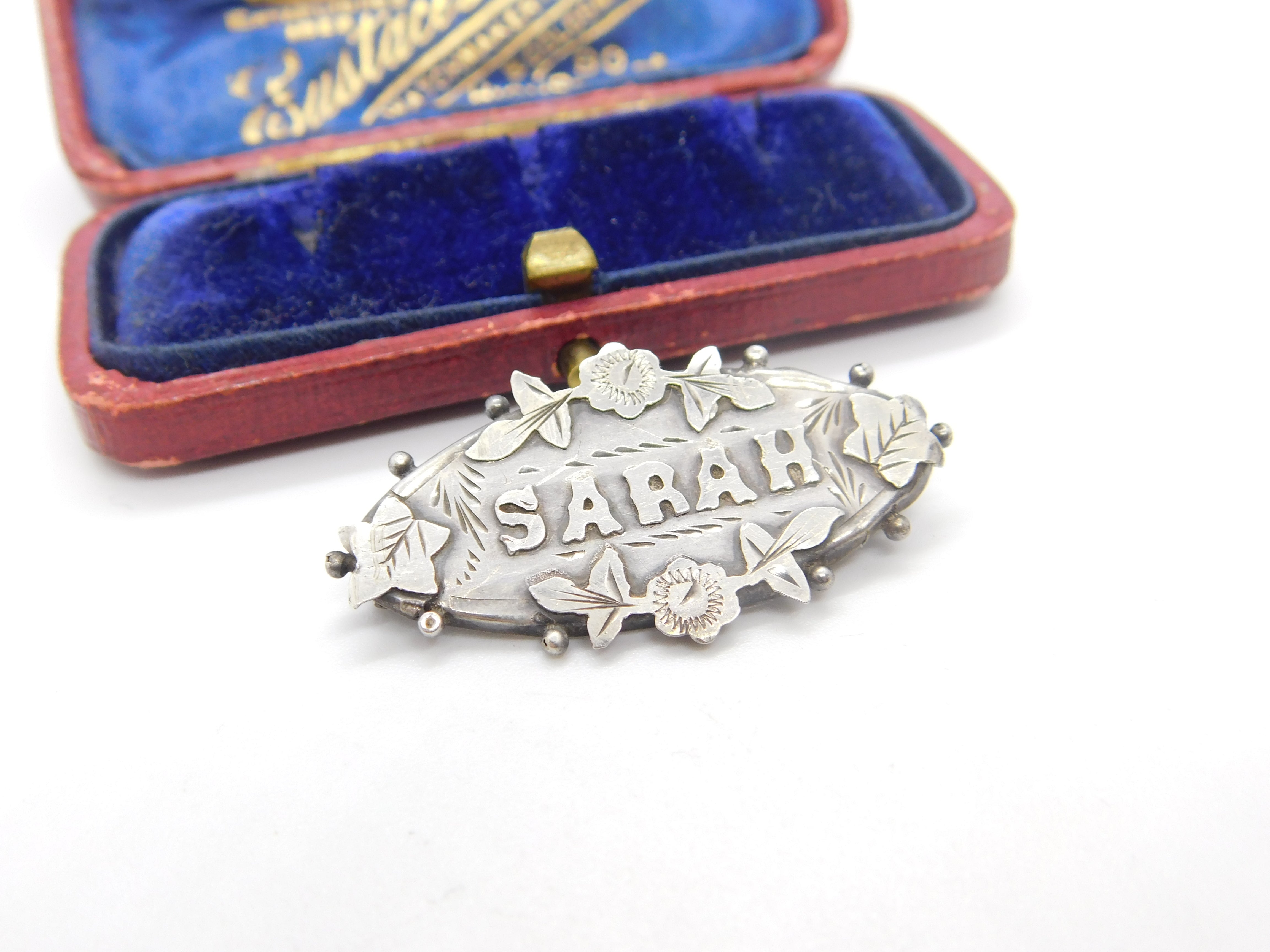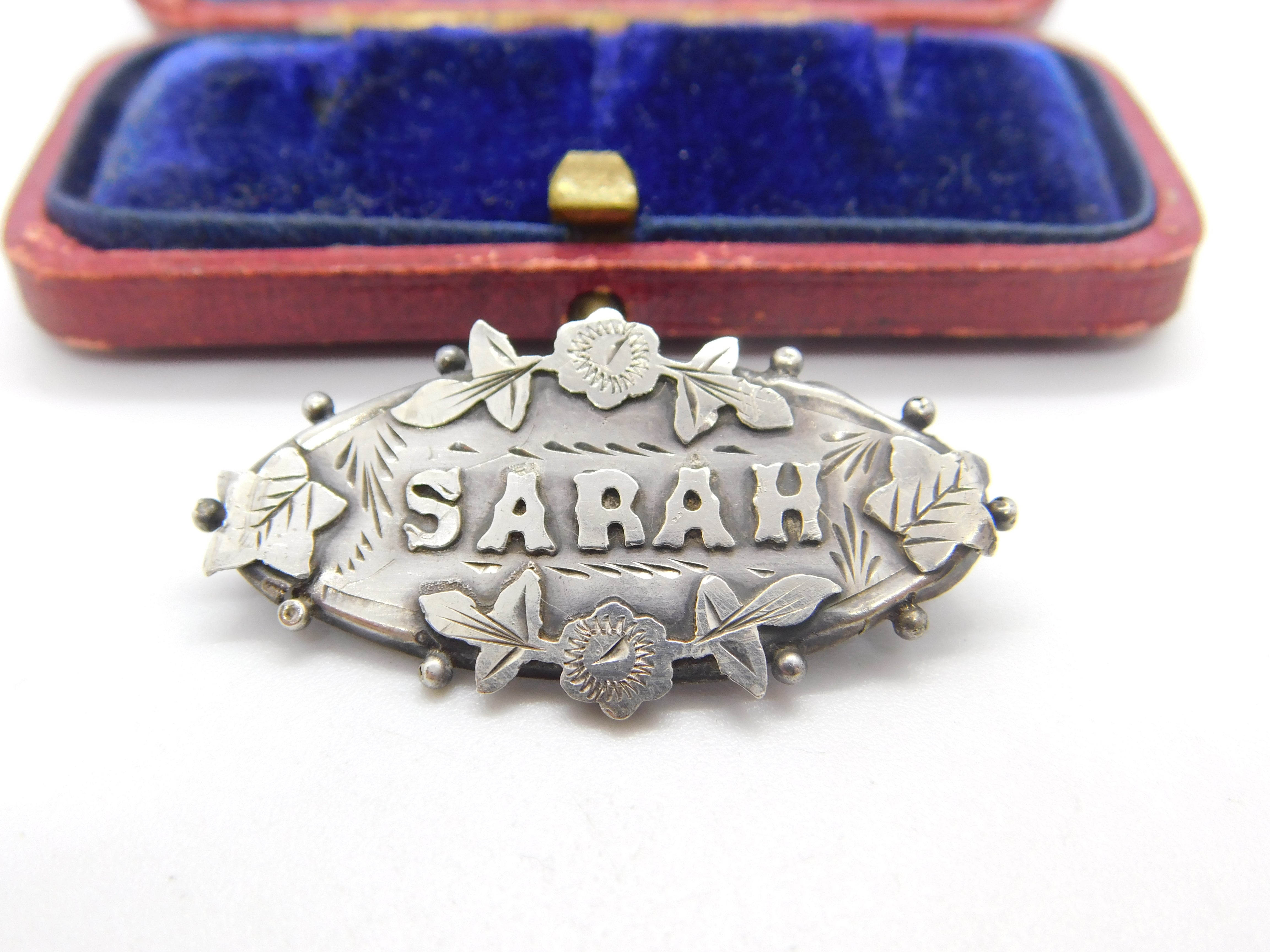 Details: A fantastic and wonderfully designed antique art deco sterling silver floral Sarah name or christening brooch with lovely detail hallmarked Birmingham 1913. This is a wonderful item that would make a perfect gift or addition to any collection. The BOX pictured is for PRESENTATION ONLY and is NOT included in the listings but used to frame the pictures unless specifically stated otherwise.