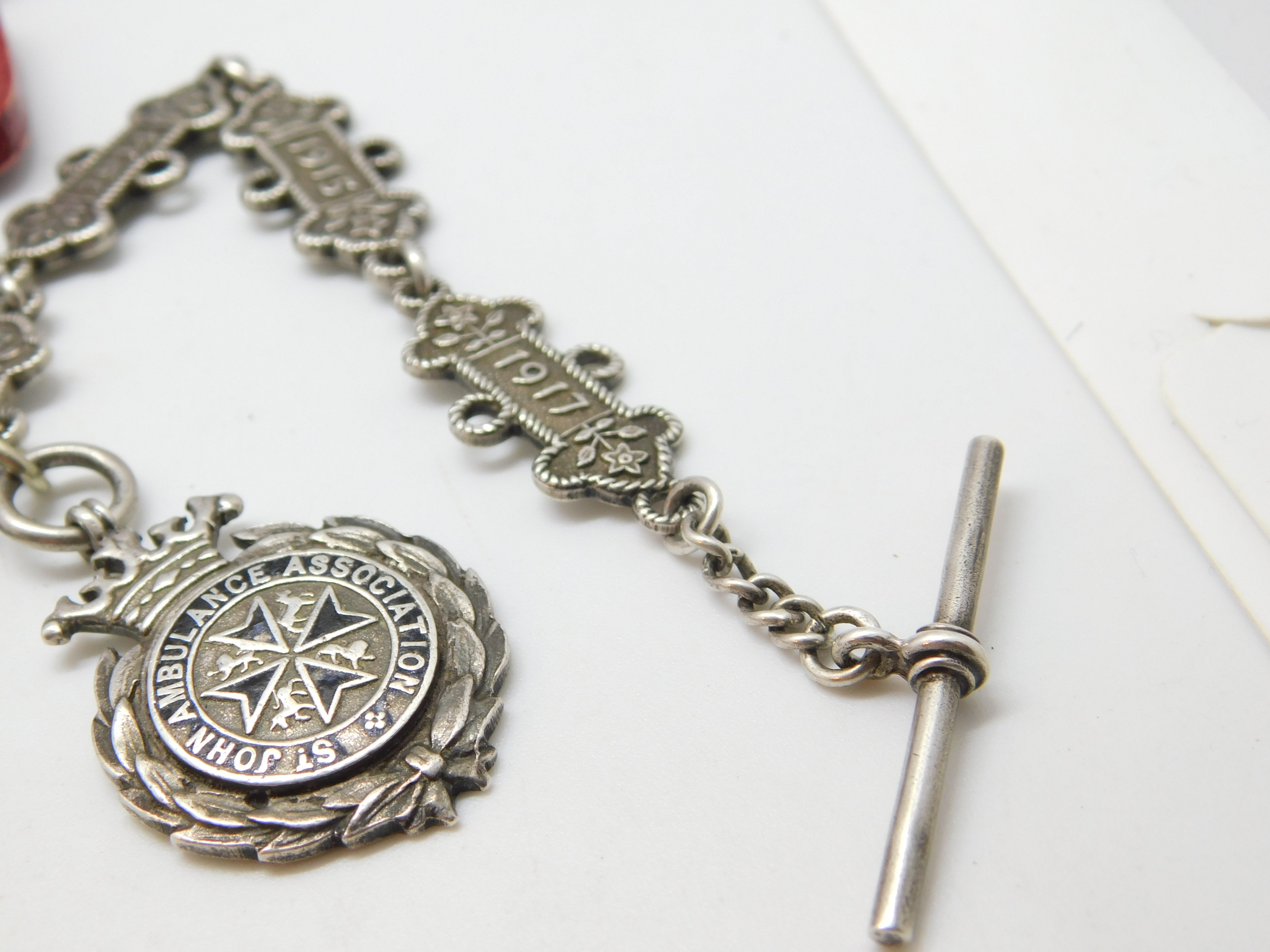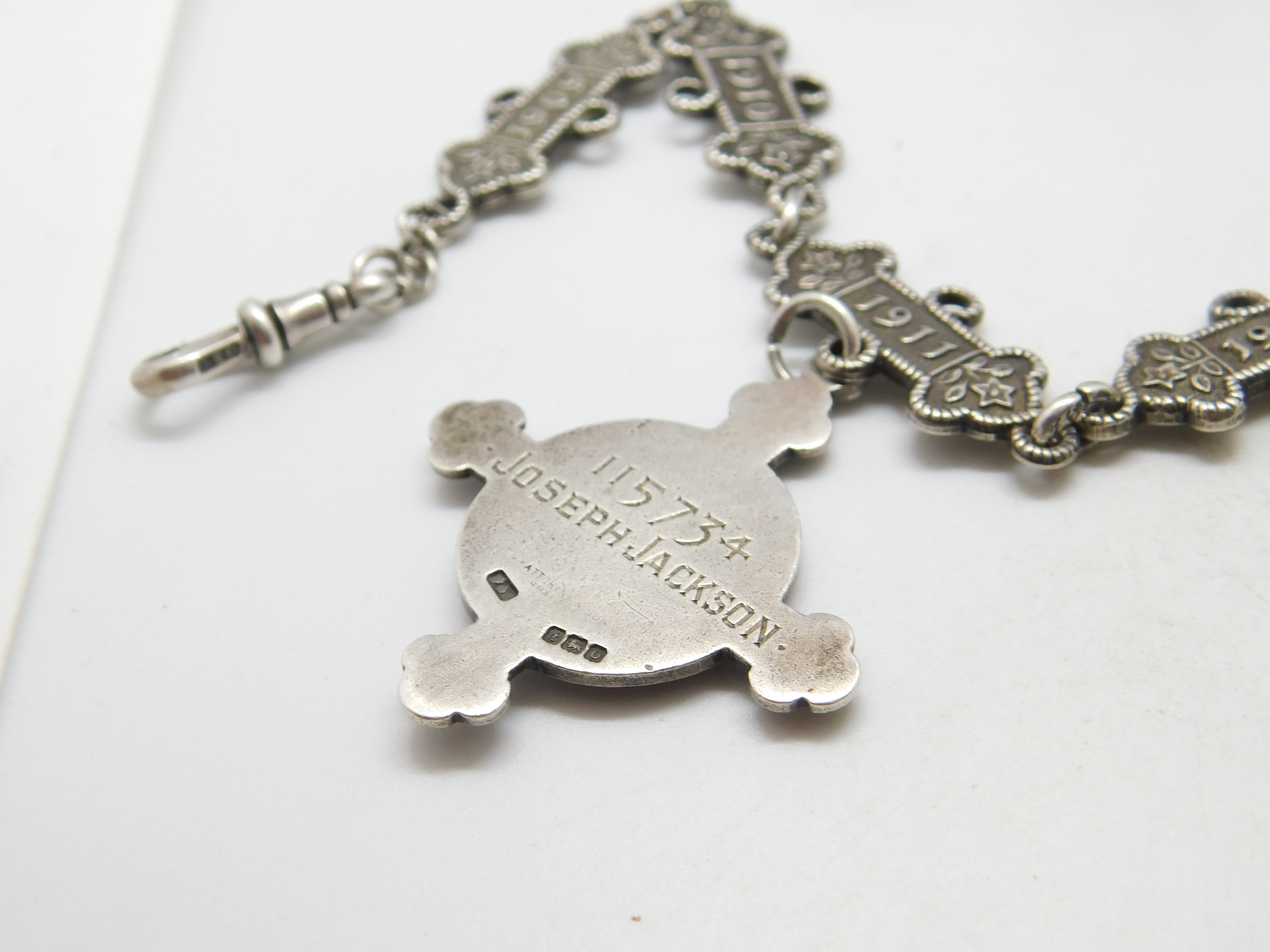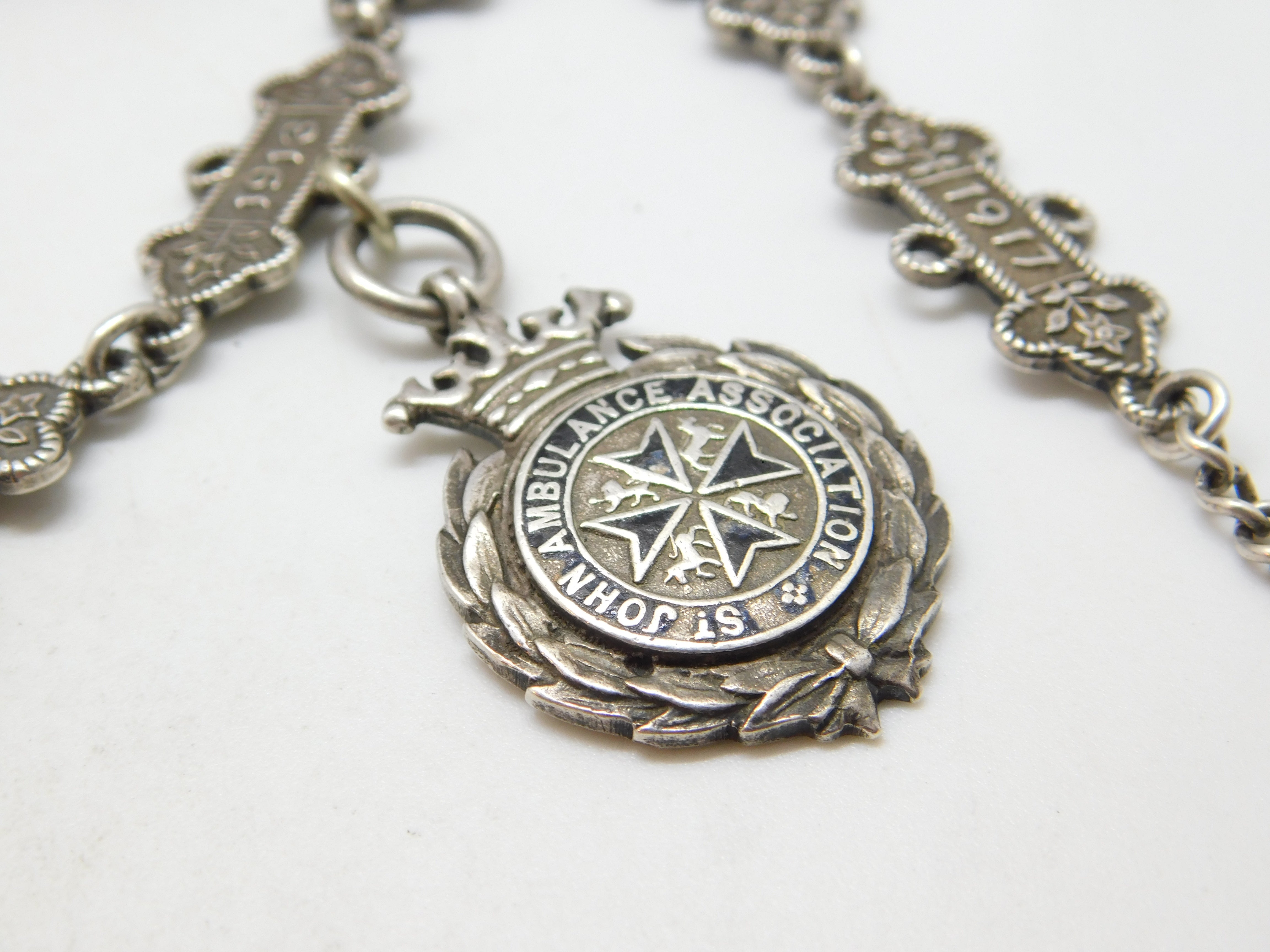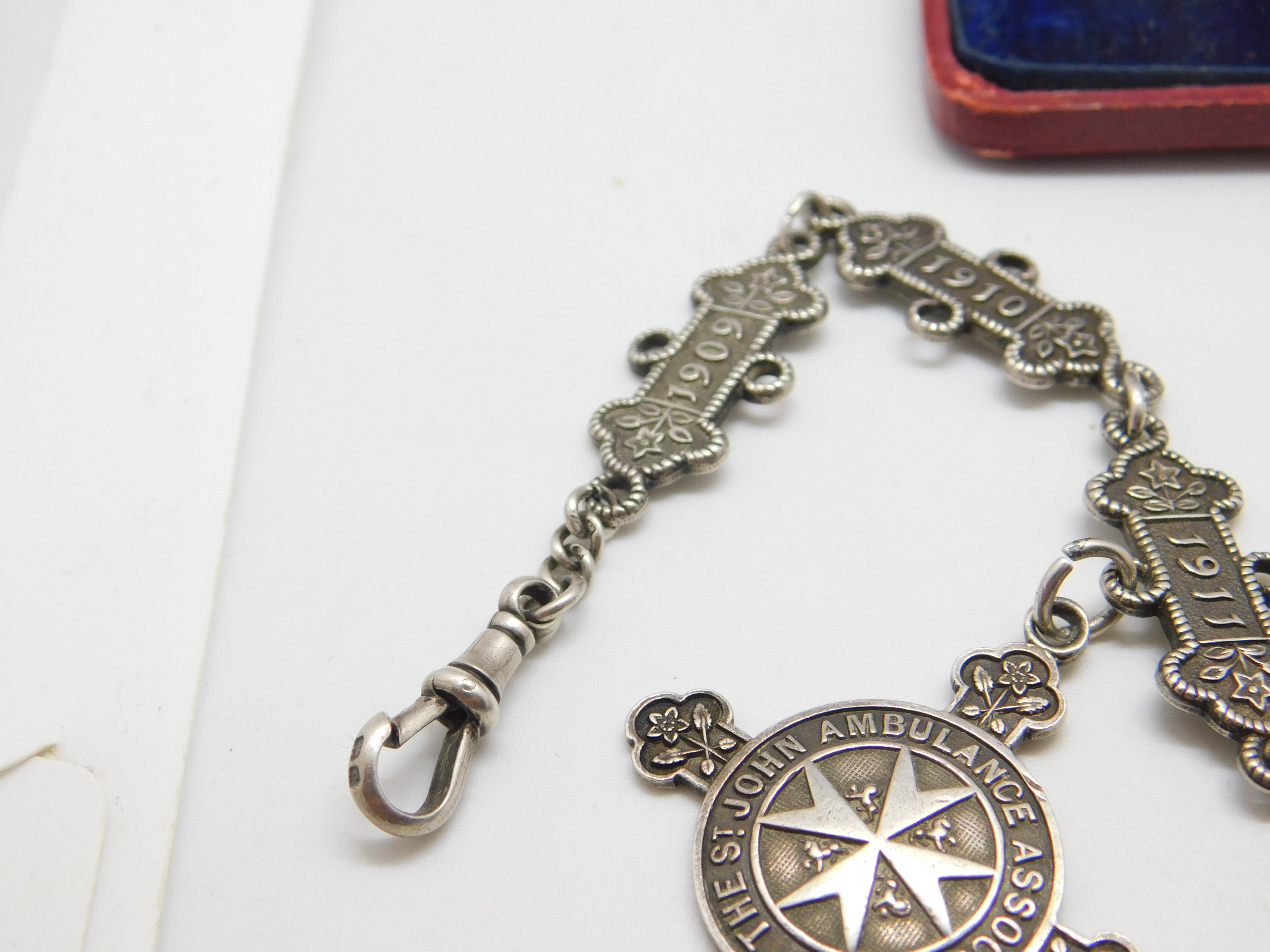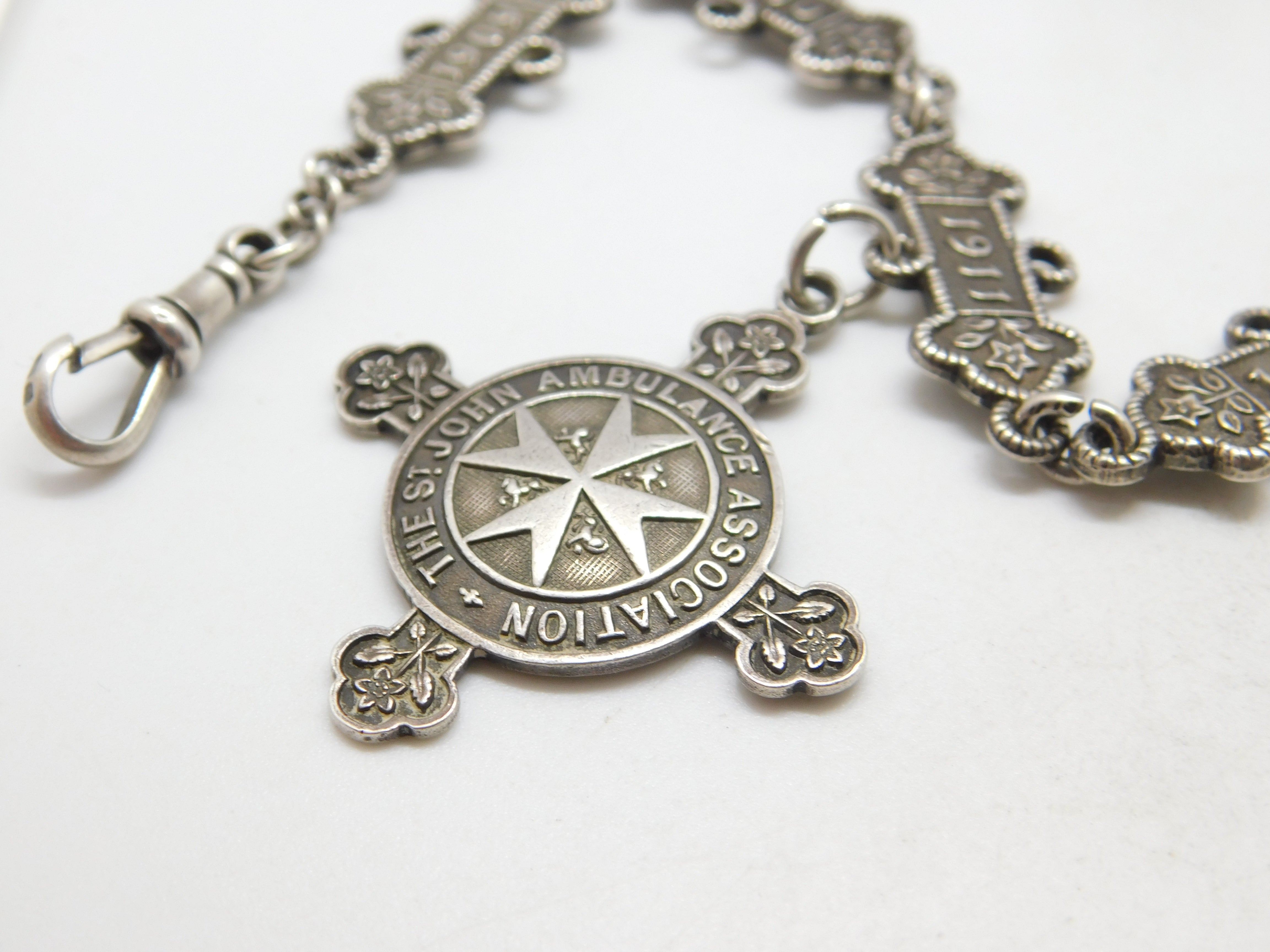 Sterling Silver St. John's Ambulance 'Joseph Jackson' Watch Chain Antique 1909-1917 Fobs & Dates
