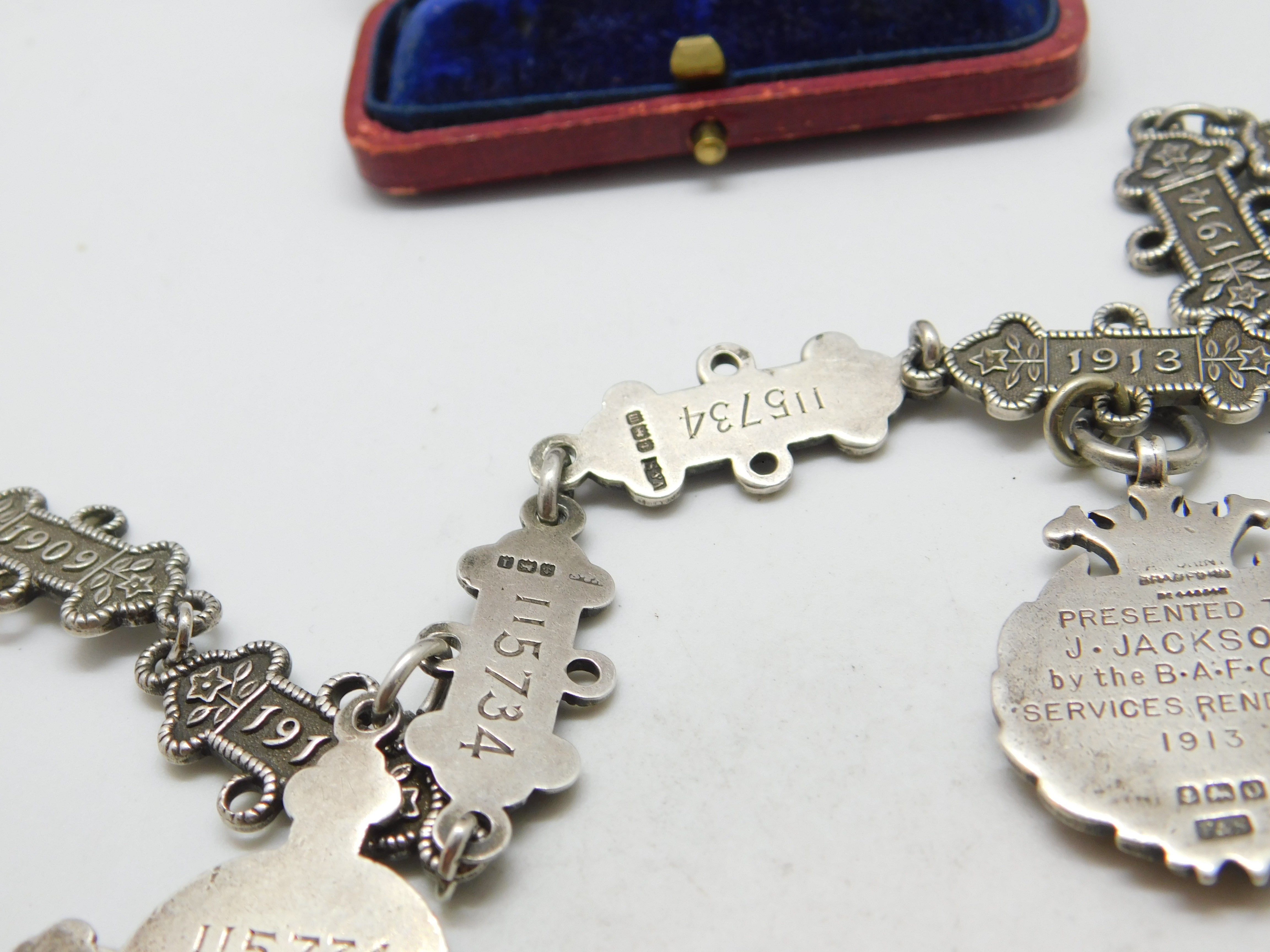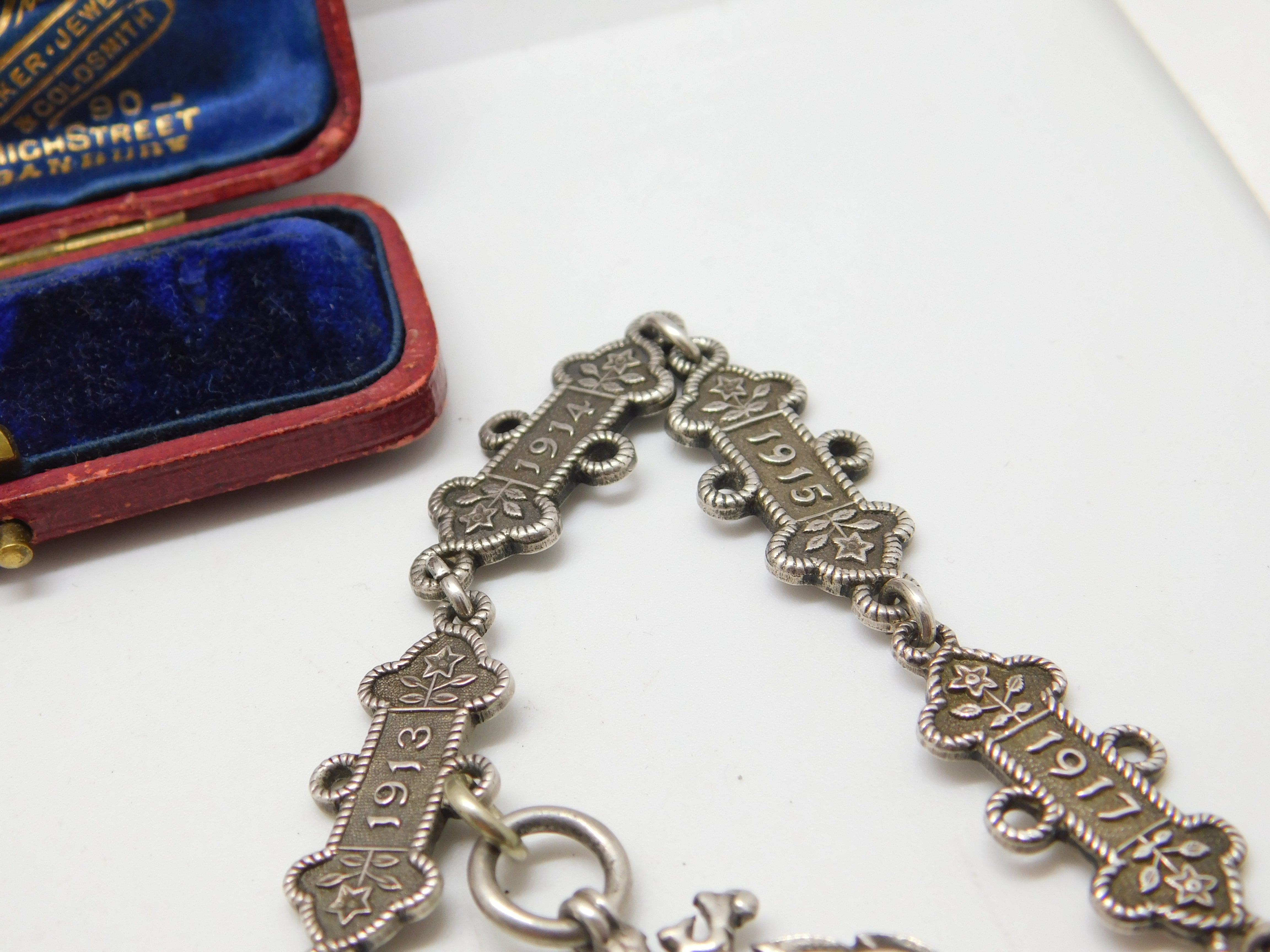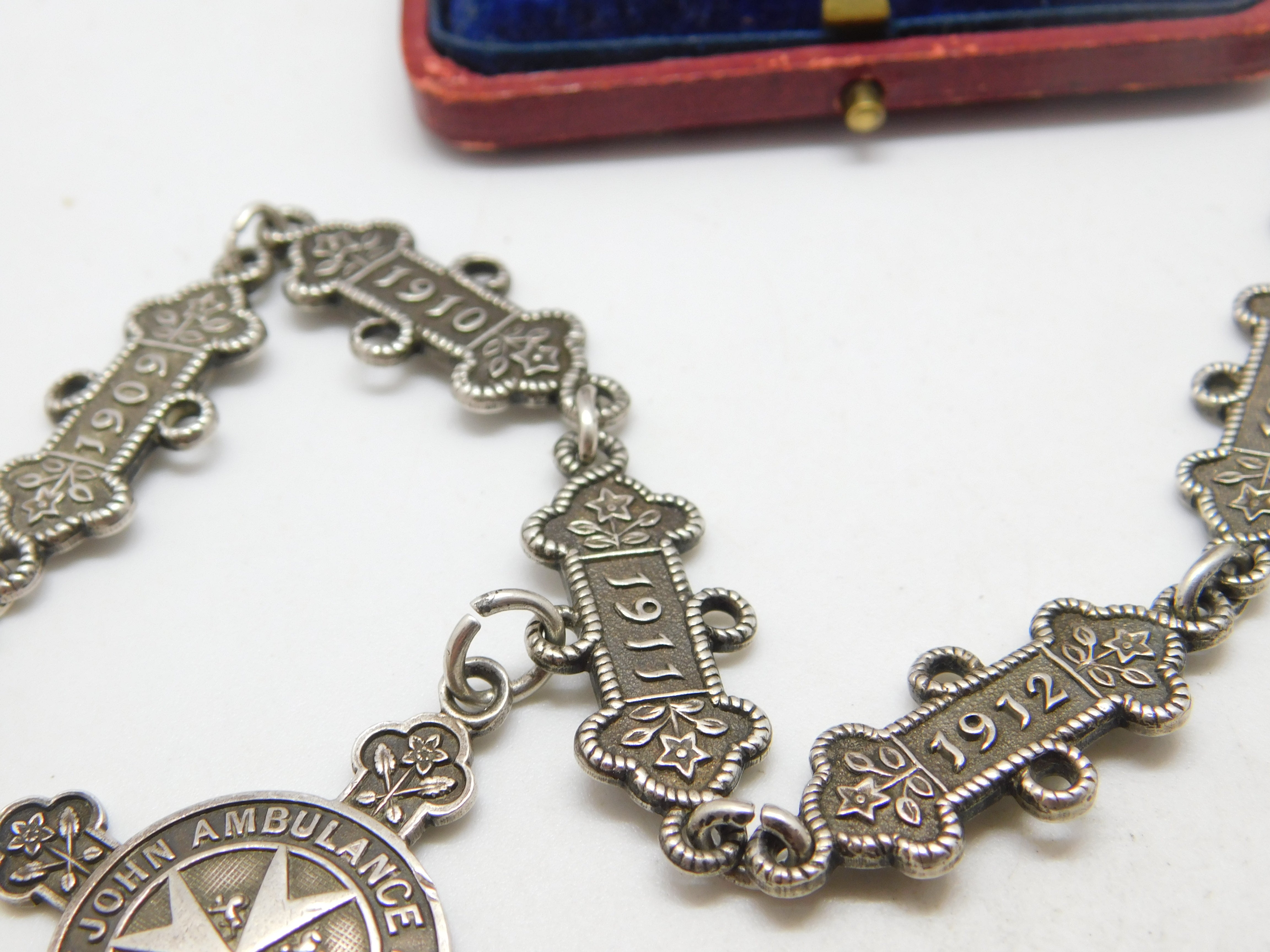 Details: For the discerning watch chain collector a superbly unusual antique sterling silver watch chain, the links made up of St John Ambulance service date tags with each year from 1909-1917 included with two service fobs attached both inscribed and fully hallmarked the chain belonging to a Mr. Joseph Jackson. Every link and fob is hallmarked we have never seen one like this! This is a wonderful item that would make a perfect gift or addition to any collection. The BOX pictured is for PRESENTATION ONLY and is NOT included in the listings but used to frame the pictures unless specifically stated otherwise.