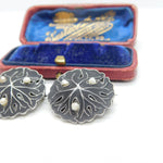 Details: A fantastic and wonderfully designed pair of antique art deco sterling silver brooches in art nouveau floral style adorned with black enamel and baroque pearls both hallmarked to the reverse by German silversmith Theodor Fahrner. Theodor Fahrner, a German jeweler from the early 20th century, achieved acclaim for avant-garde designs in Art Deco and Jugendstil styles. His eponymous jewelry firm, founded in Pforzheim in 1883, produced innovative pieces with intricate silverwork, semi-precious stones, and enamel. Fahrner's creations remain prized collectibles, reflecting his influential contribution to Art Nouveau jewelry. This is a wonderful item that would make a perfect gift or addition to any collection. The BOX pictured is for PRESENTATION ONLY and is NOT included in the listings but used to frame the pictures unless specifically stated otherwise.