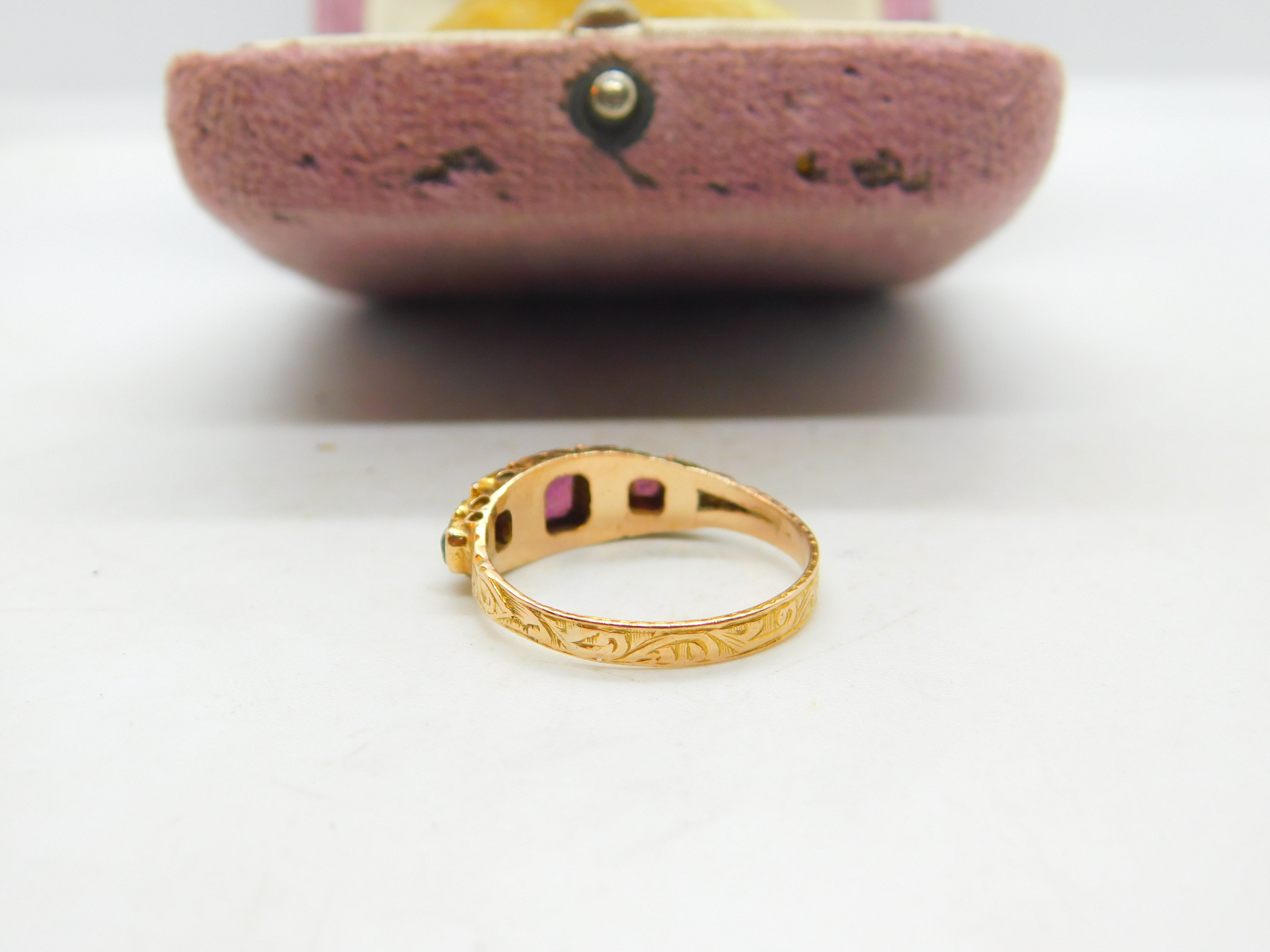 Details: A fantastic and wonderfully designed antique Victorian 15ct yellow gold boat ring set with pink tourmaline and emerald stones to the front and adorned with a beautiful floral band clearly hallmarked Birmingham 1869. The stones have been tested. This is a wonderful item that would make a perfect gift or addition to any collection. The BOX pictured is for PRESENTATION ONLY and is NOT included in the listings but used to frame the pictures unless specifically stated otherwise.
