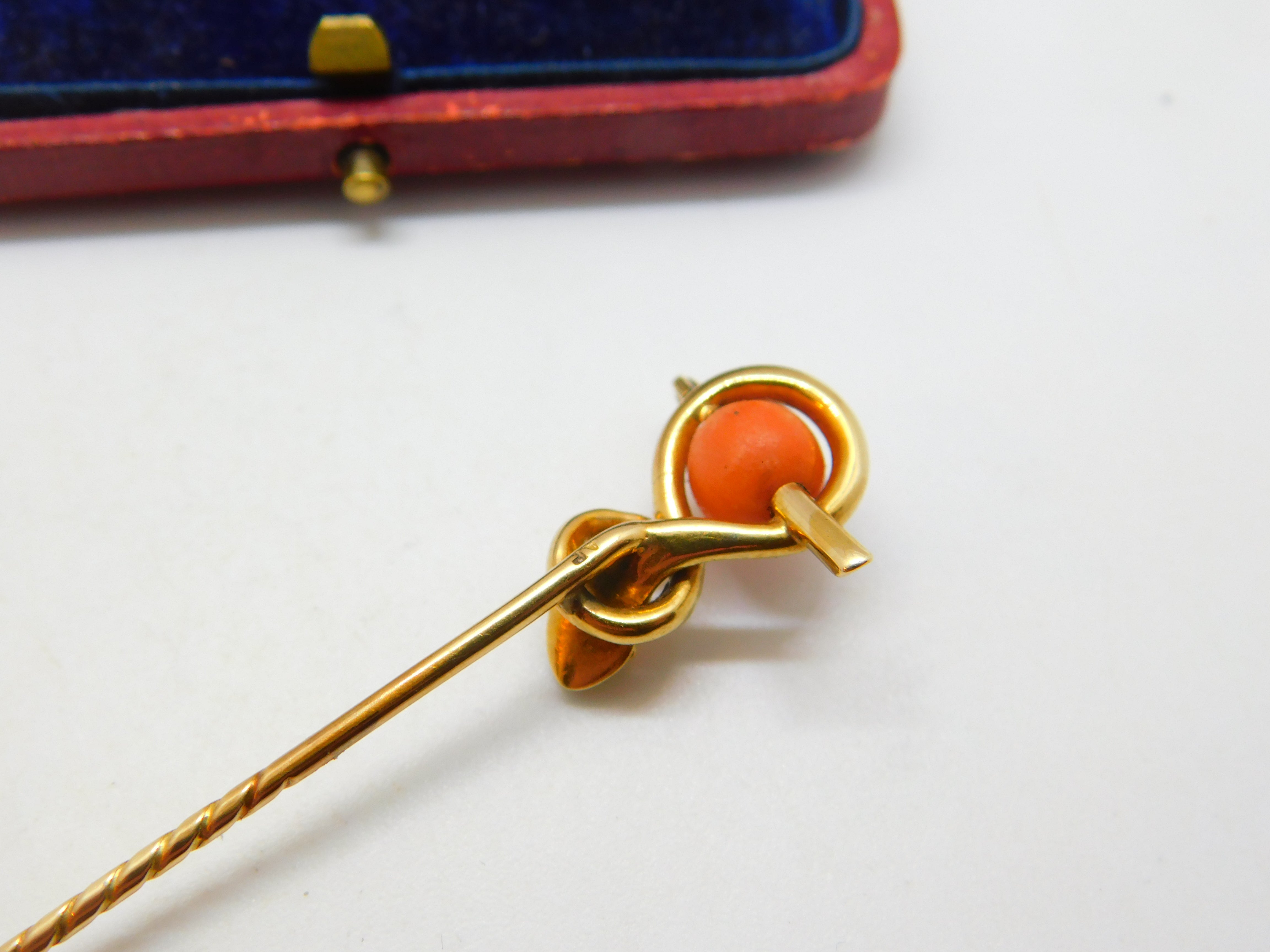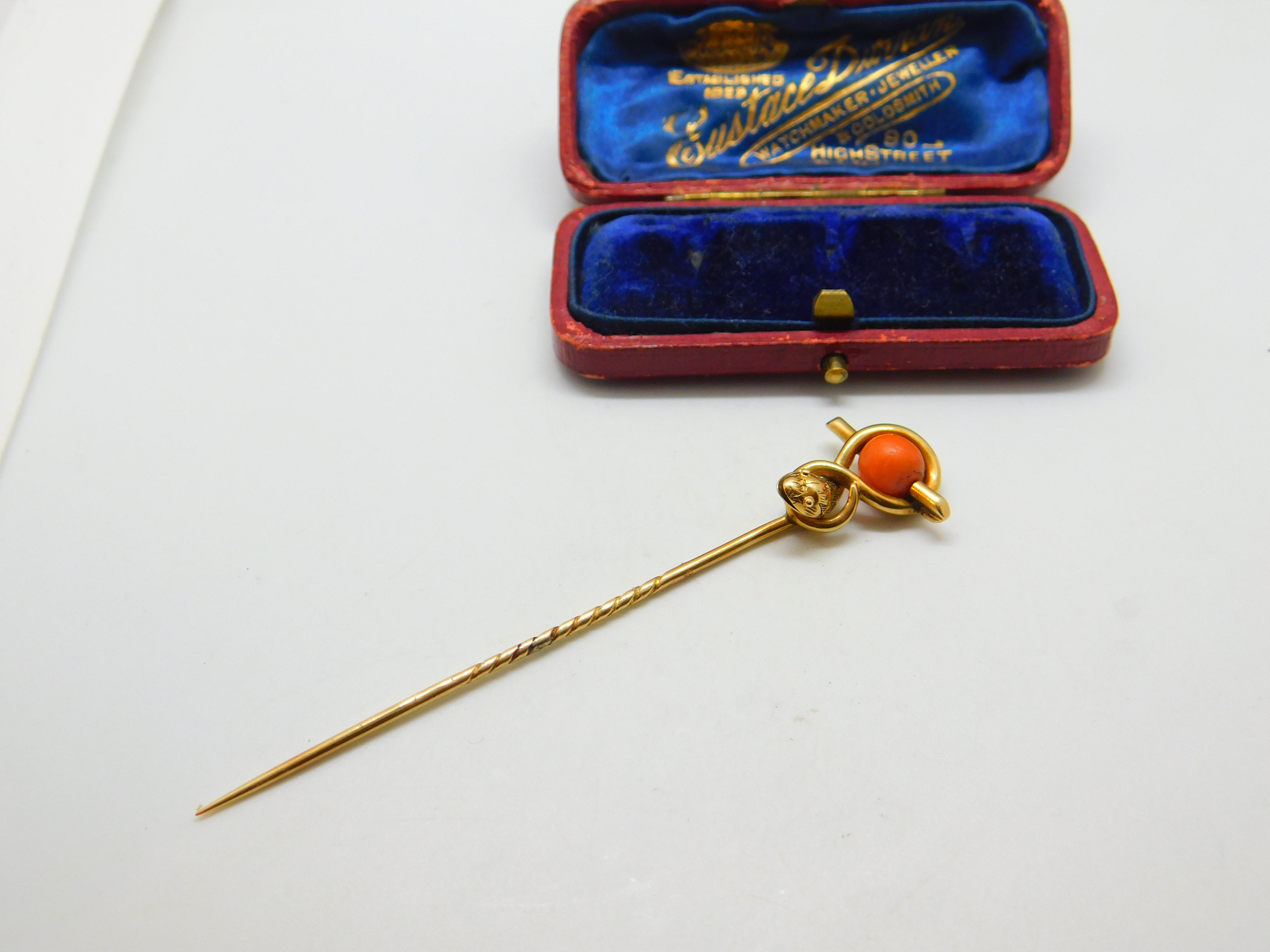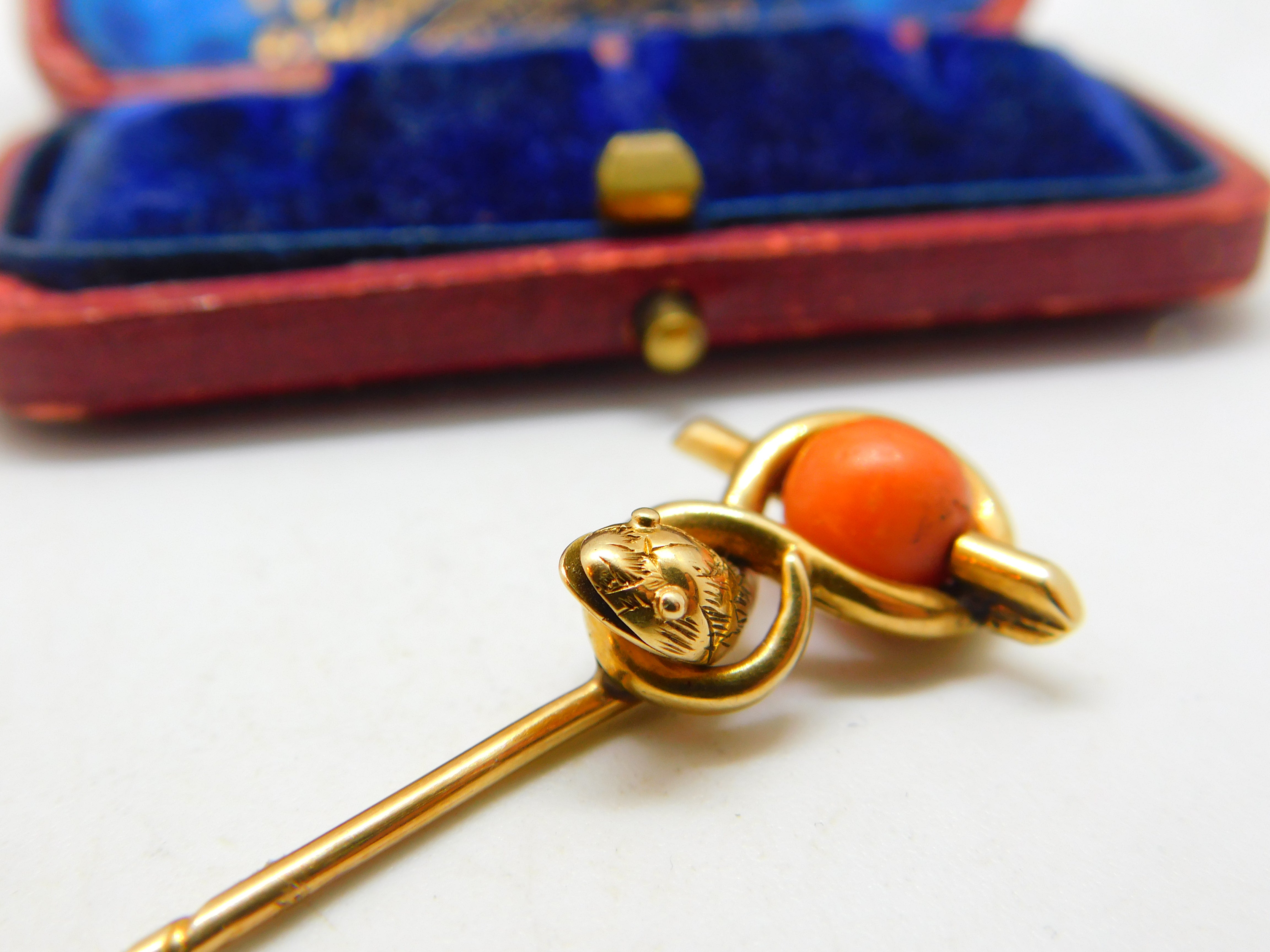 Details: A fantastic and wonderfully designed antique Victorian 15ct yellow gold large stick pin set with a lovely red coral bead in the form of a serpent or snake c1880 - the gold has been XRF tested only makers marks to the reverse. This is a wonderful item that would make a perfect gift or addition to any collection. The BOX pictured is for PRESENTATION ONLY and is NOT included in the listings but used to frame the pictures unless specifically stated otherwise.