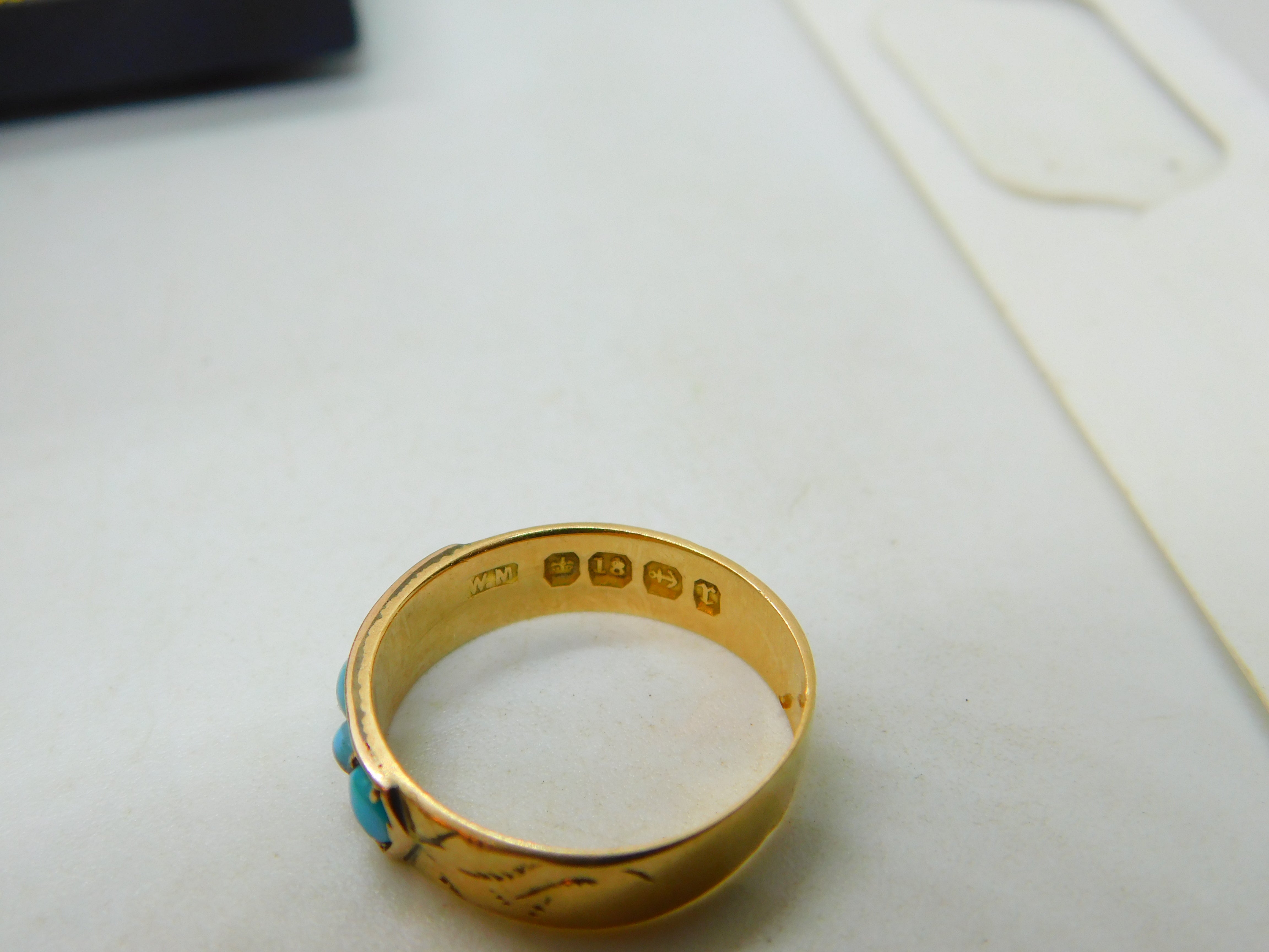 Details: A superb antique Victorian 18ct yellow gold five-stone band ring set with cabochon turquoise stones and very clearly assayed to the inner band Birmingham 1891. Nice floral etching to the shoulders. This is a wonderful item that would make a perfect gift or addition to any collection. The BOX pictured is for PRESENTATION ONLY and is NOT included in the listings but used to frame the pictures unless specifically stated otherwise.