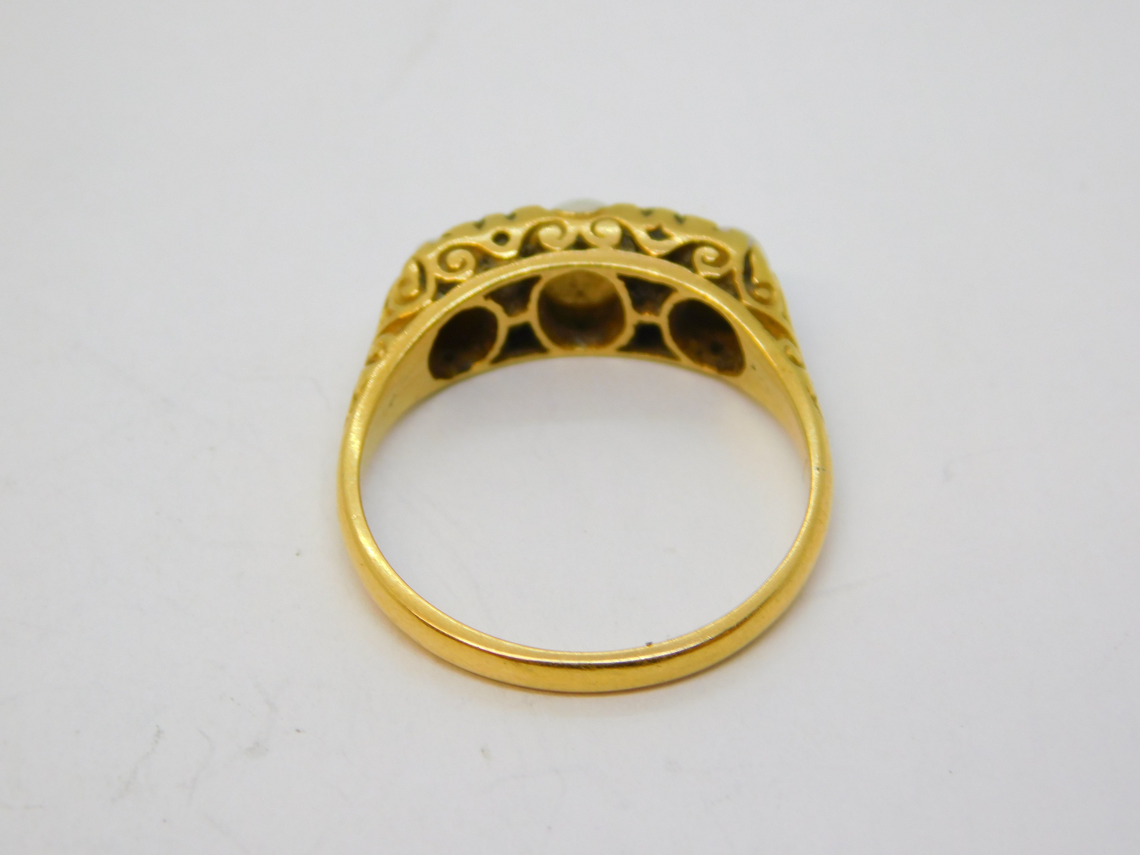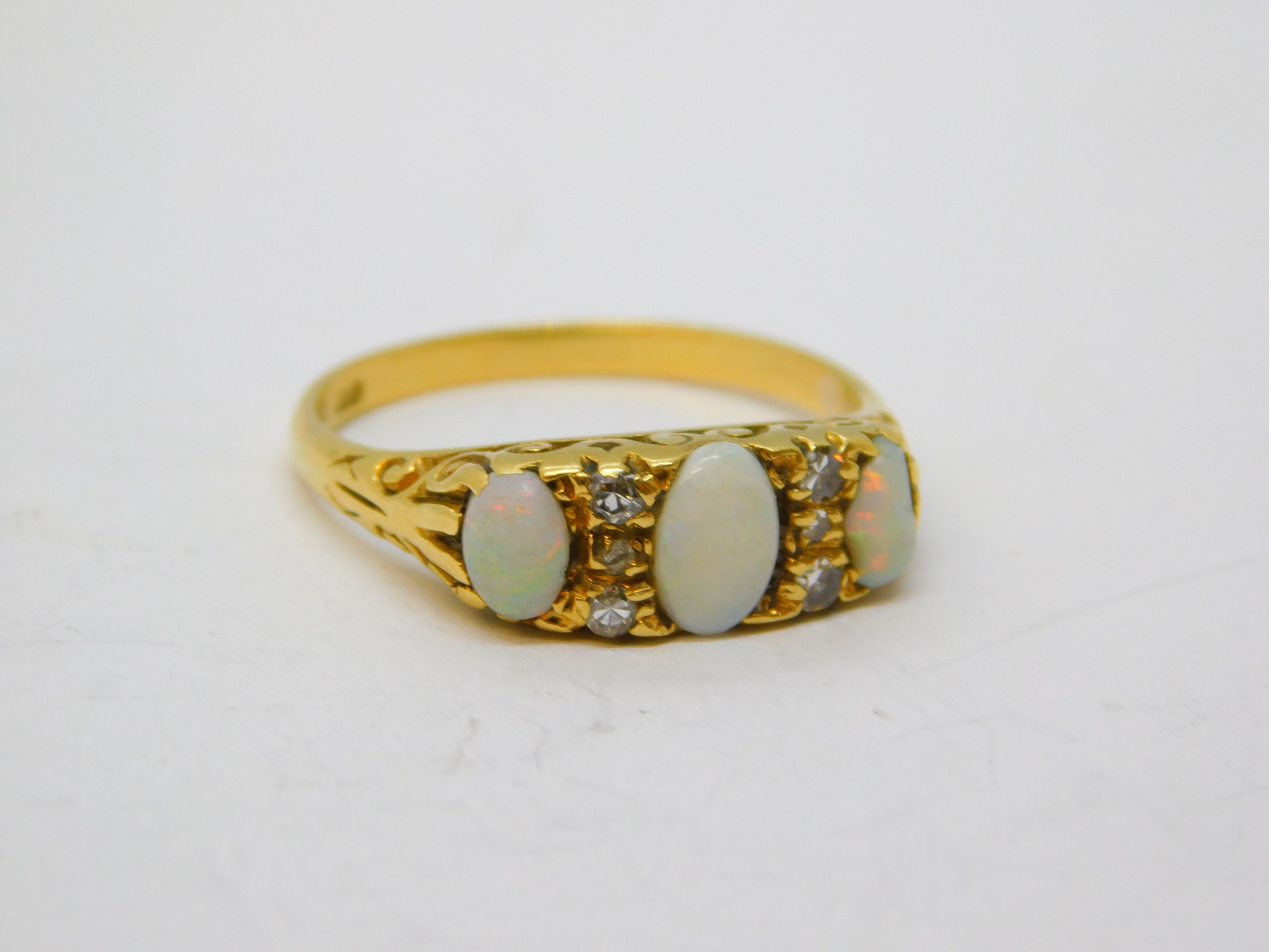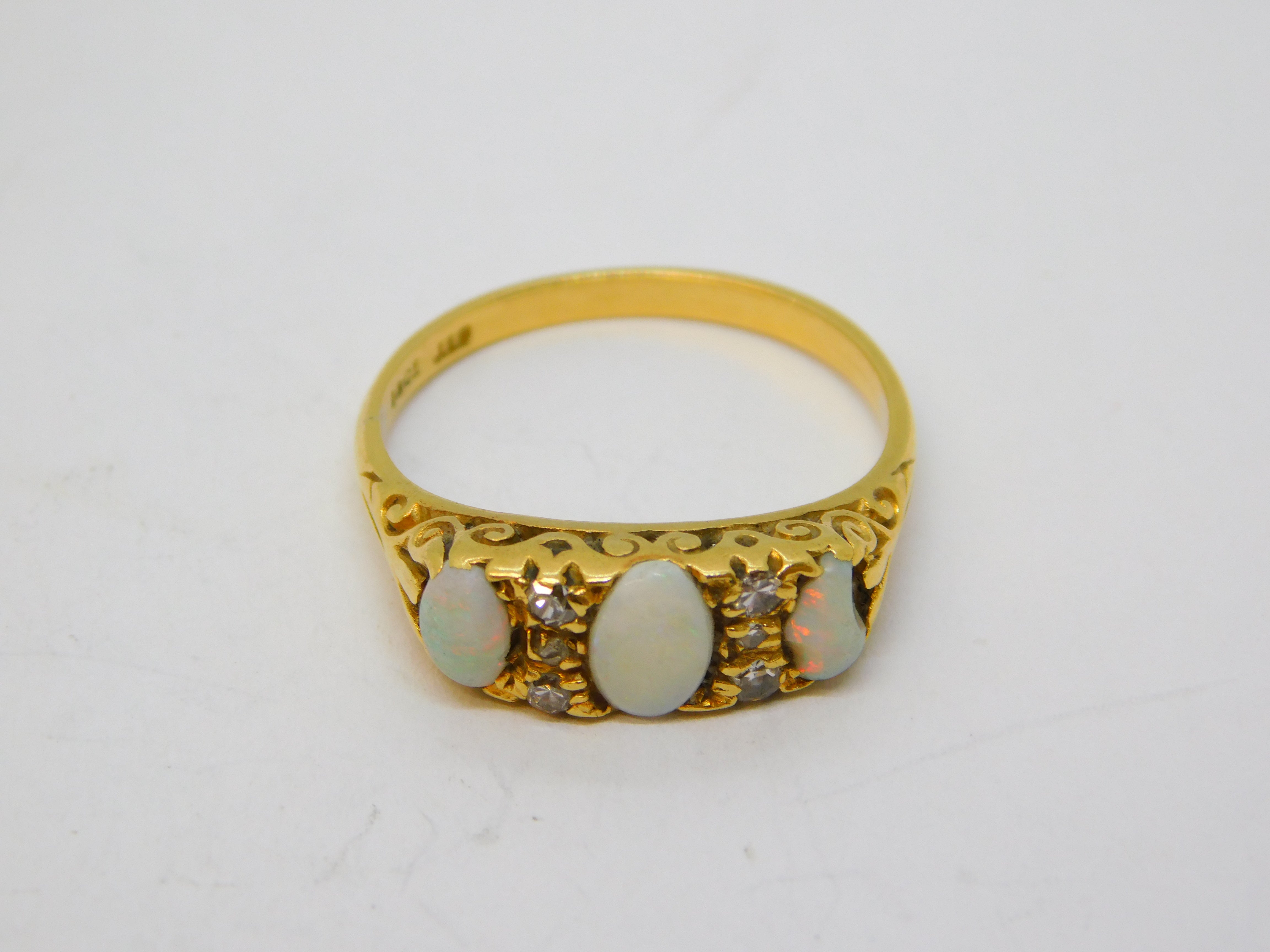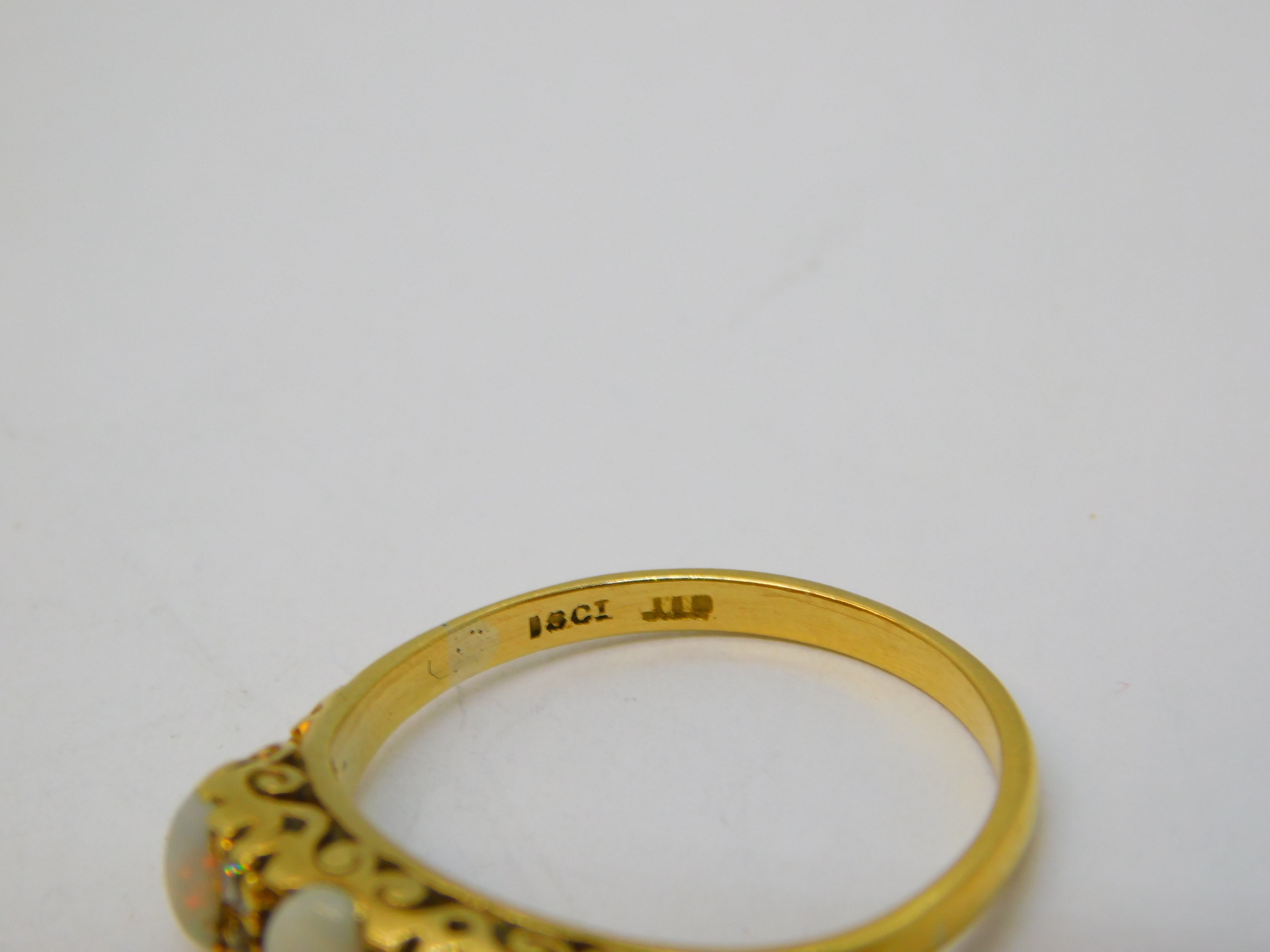 Details: A fantastic and wonderfully designed antique Victorian 18ct yellow gold three-stone boat ring set with white cabochon opals and diamonds hallmarked to the interior c1880, one of the opals is chipped please note. This is a wonderful item that would make a perfect gift or addition to any collection. We are more than happy to provide XRF reports for items upon request.