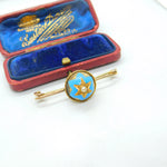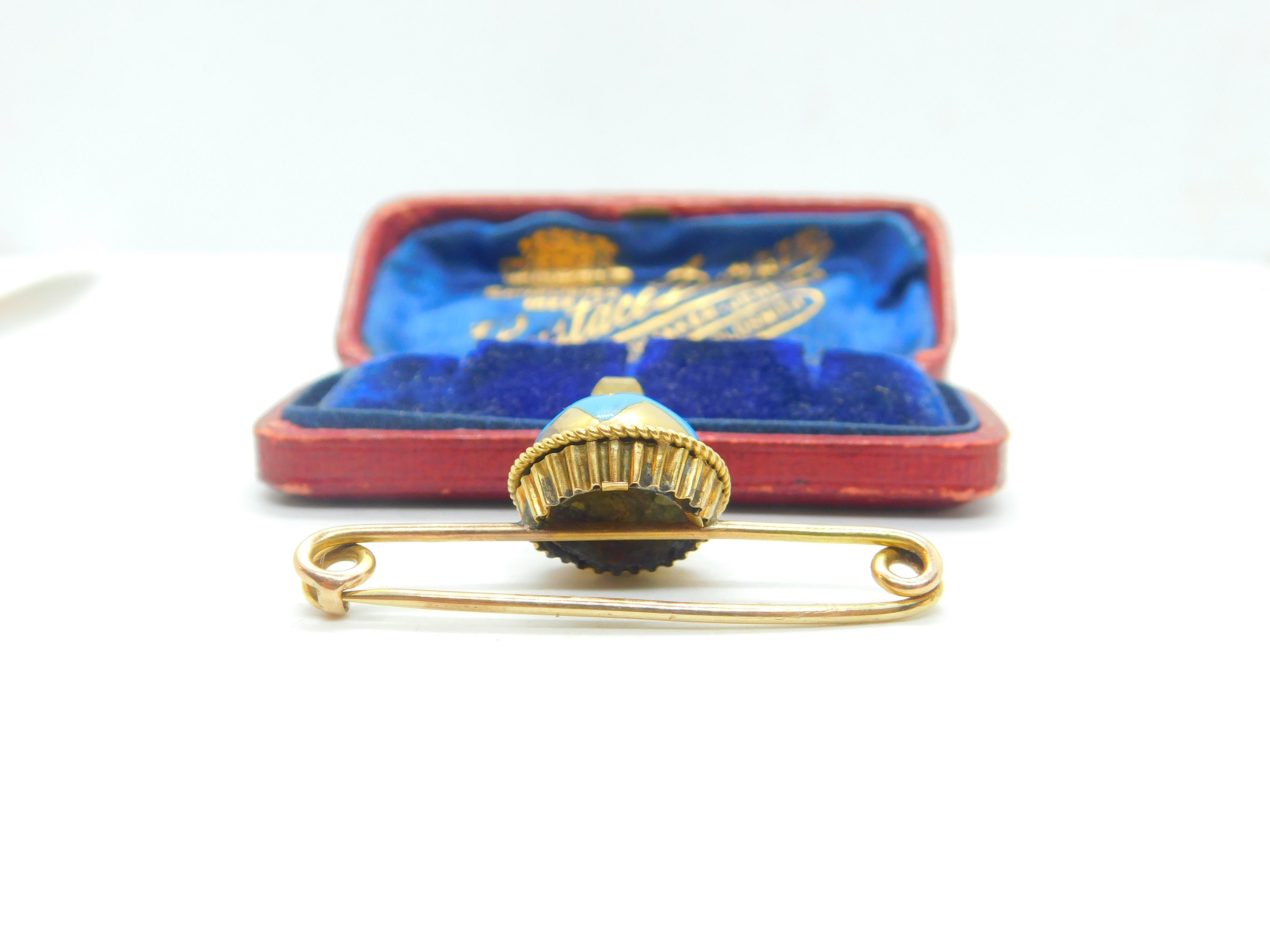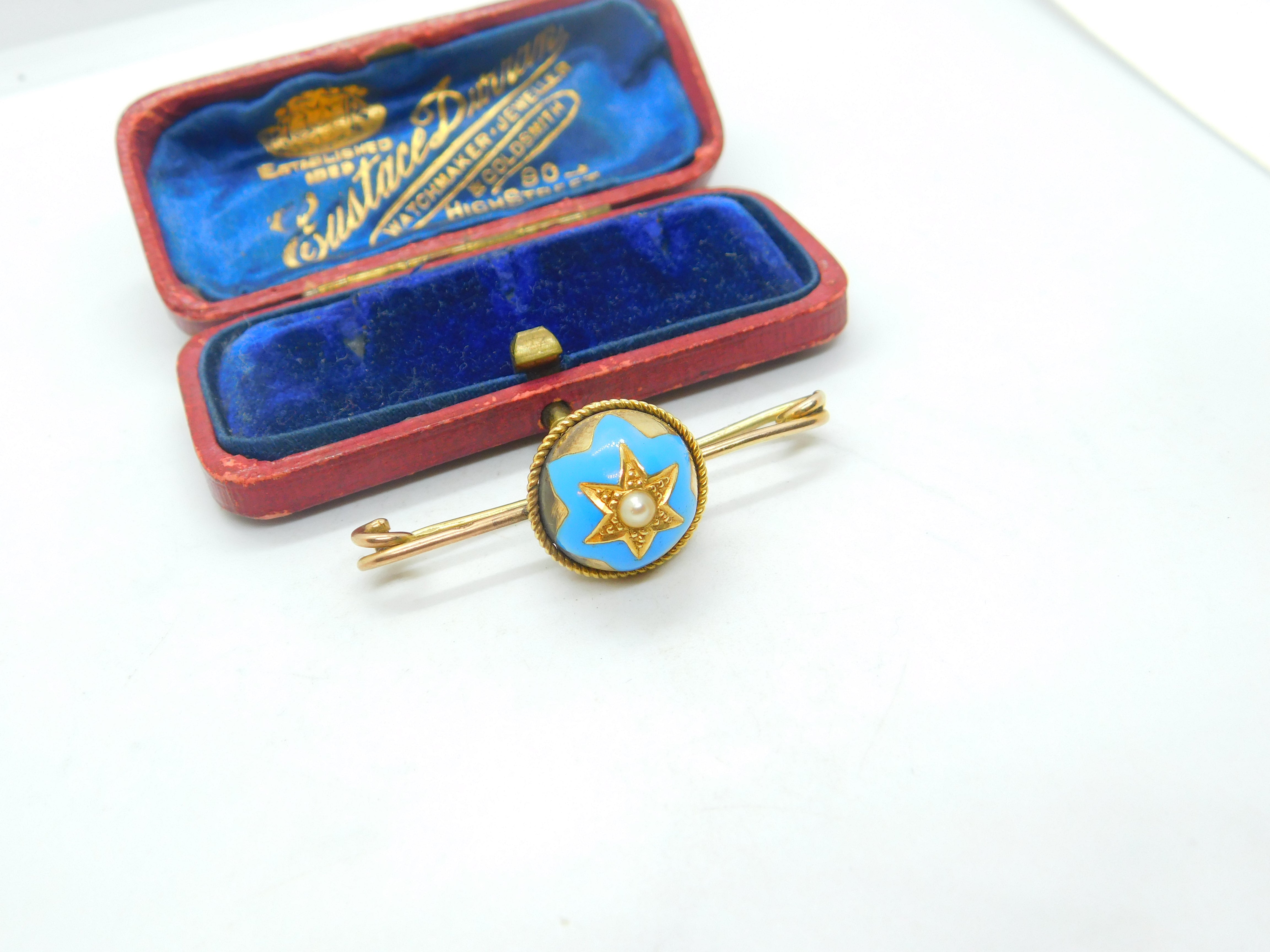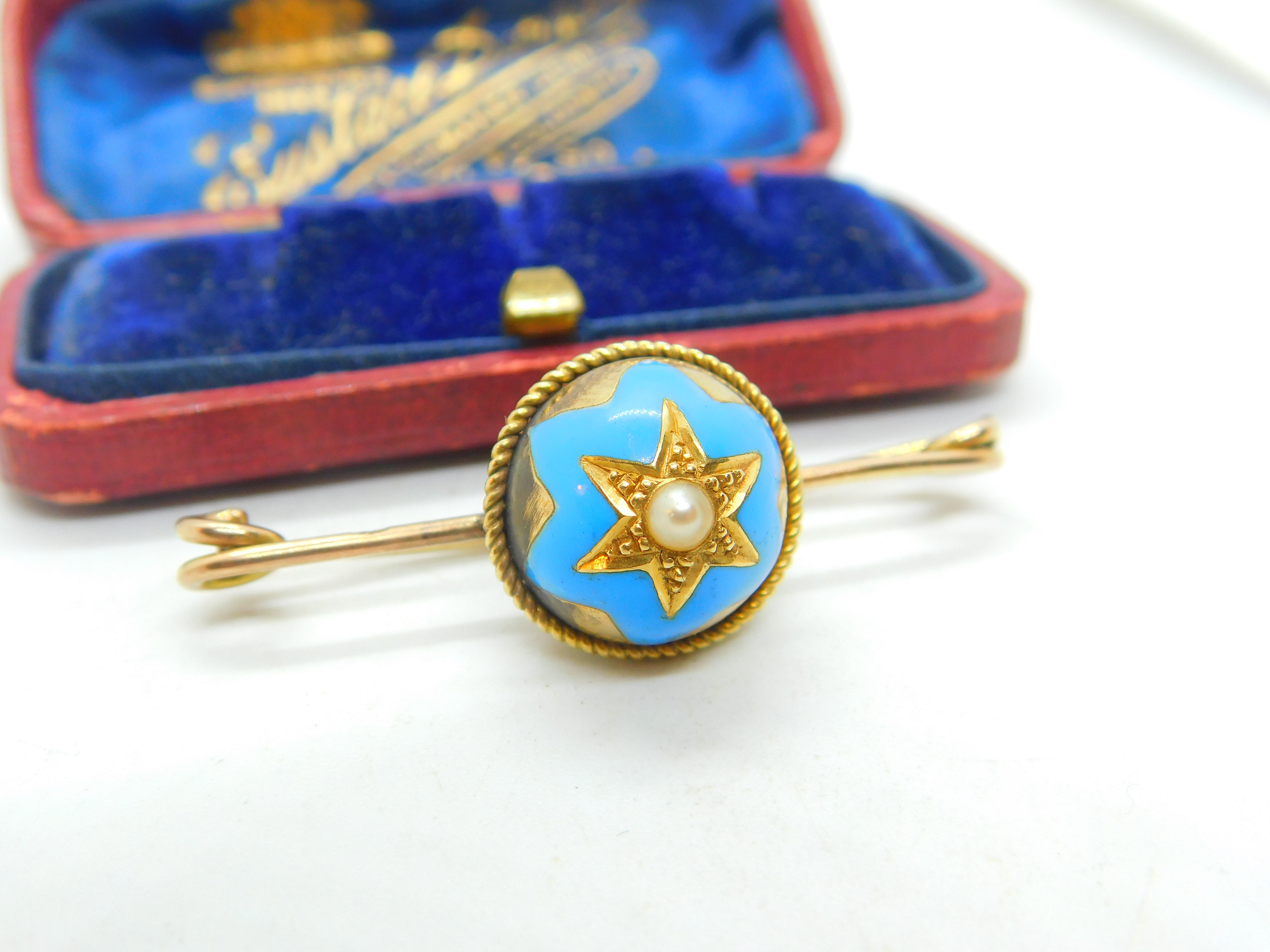 Details: A fantastic and wonderfully designed antique Victorian 18ct yellow gold sweetheart brooch with blue enamel star form centre set with a seed pearl c1880. The front is 18ct while the back pin is 9ct and is stamped 9C - the brooch has been XRF tested. This is a wonderful item that would make a perfect gift or addition to any collection. The BOX pictured is for PRESENTATION ONLY and is NOT included in the listings but used to frame the pictures unless specifically stated otherwise.