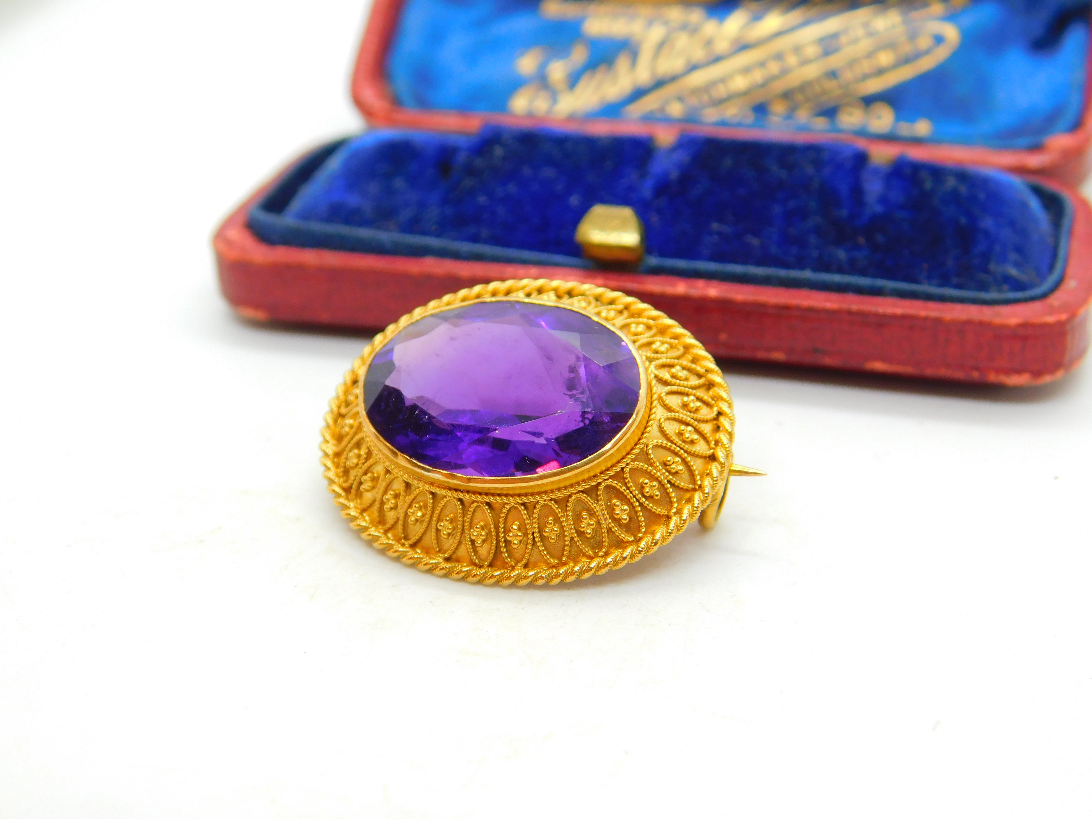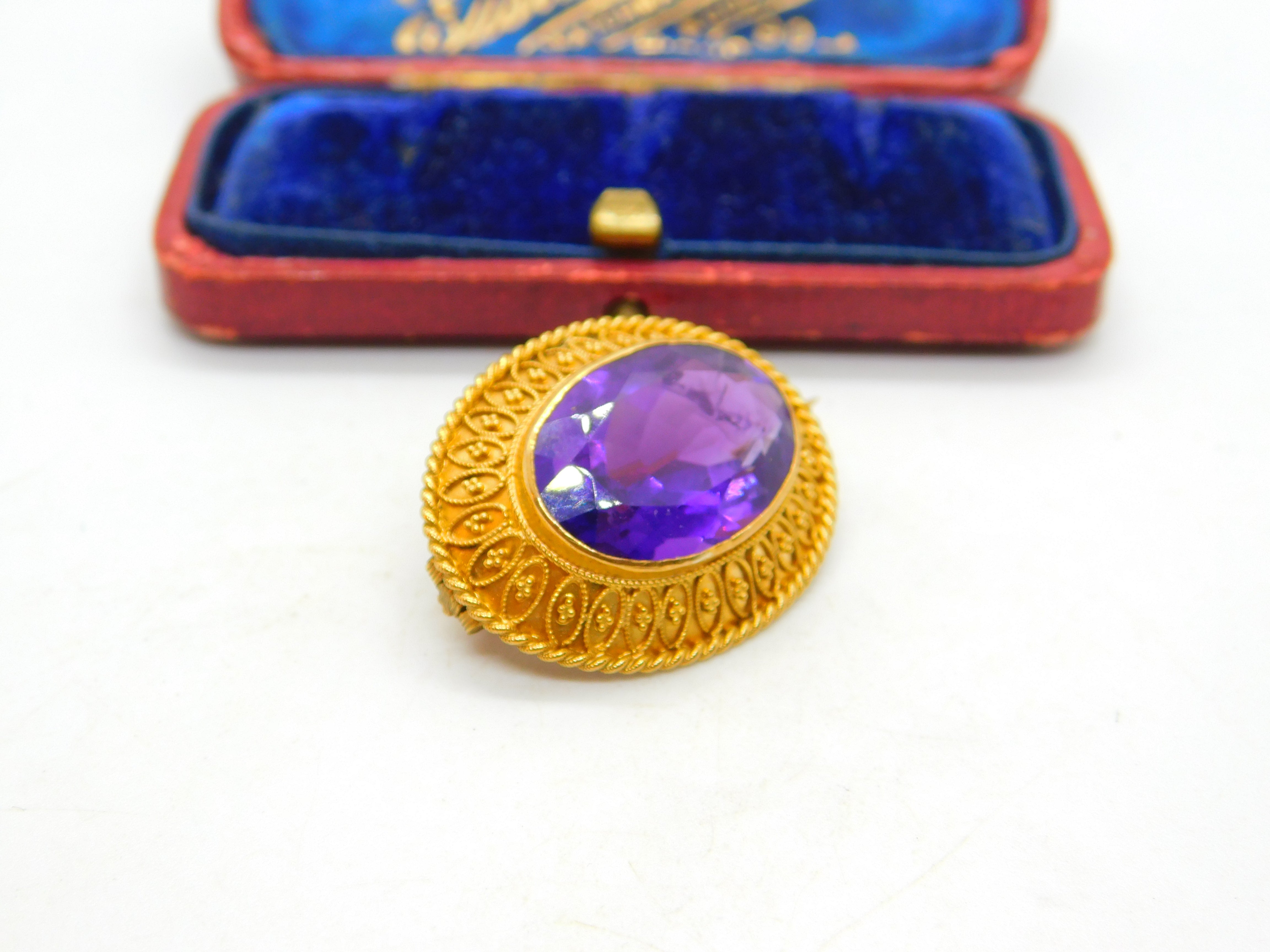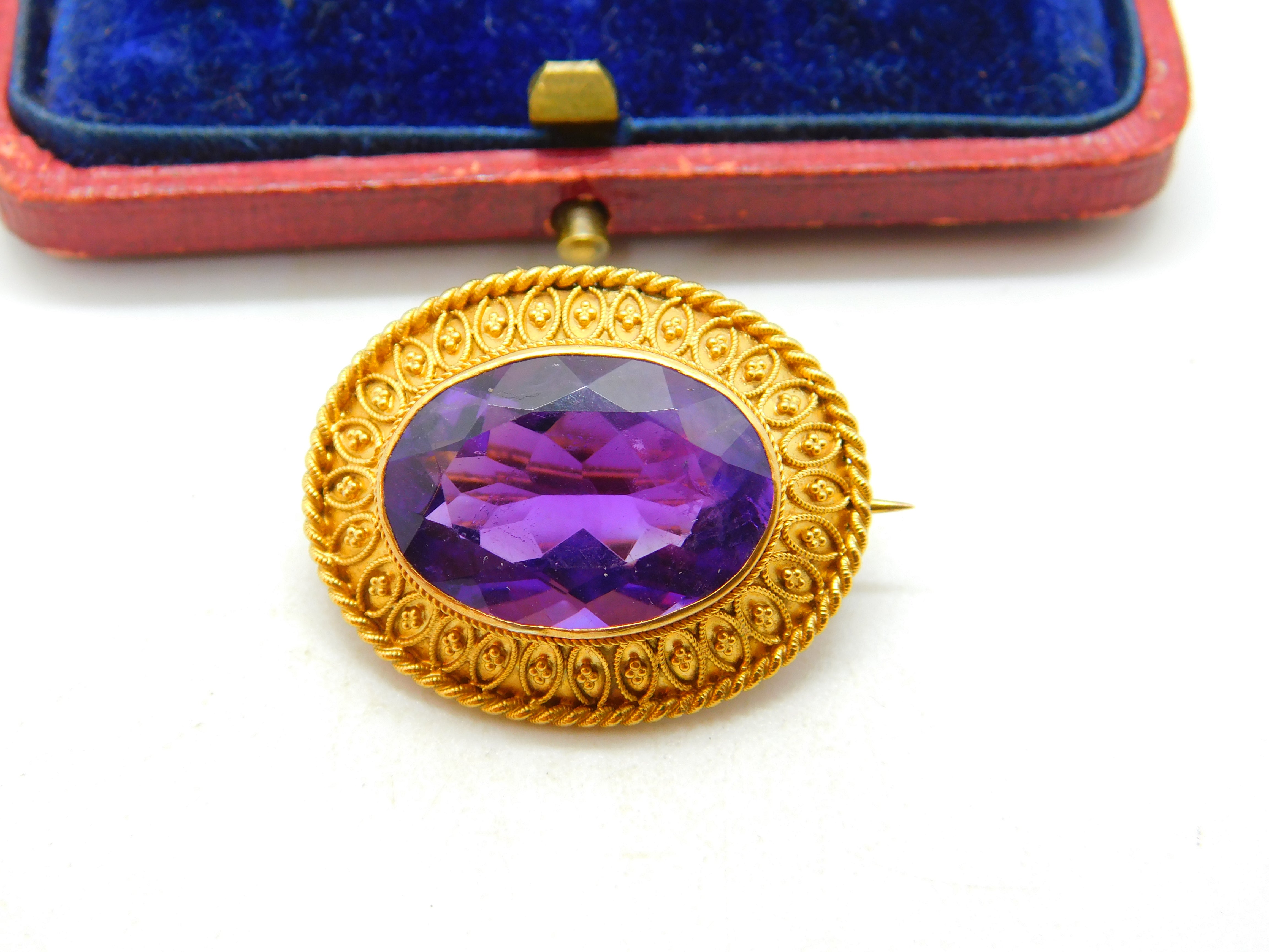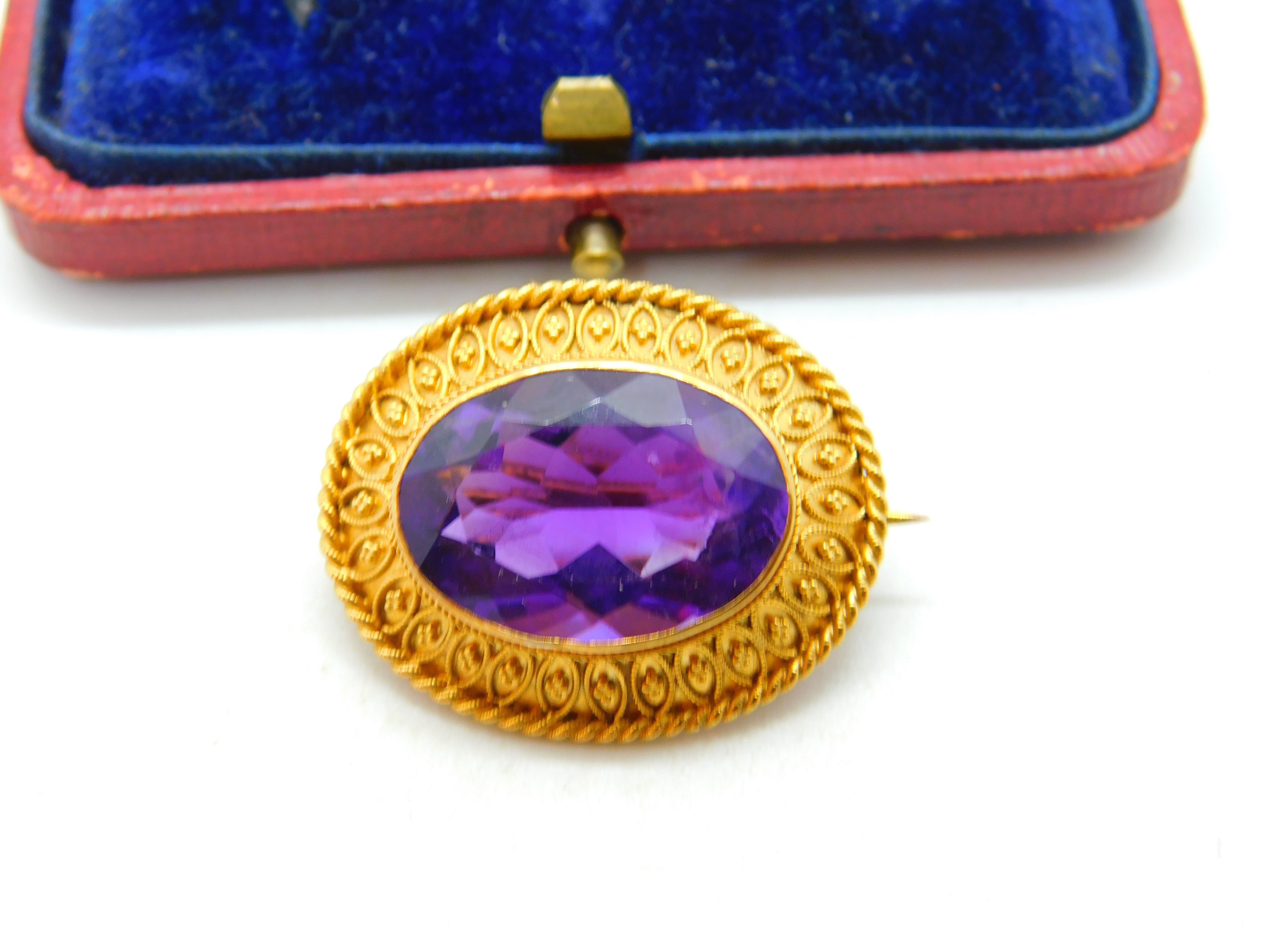 Details: A fantastic and wonderfully designed antique Victorian 18ct yellow gold etruscan style brooch set with superb deep purple faceted amethyst c1880 - the gold has been XRF tested and the pin is 9ct and is also marked 9ct. This is a wonderful item that would make a perfect gift or addition to any collection. The BOX pictured is for PRESENTATION ONLY and is NOT included in the listings but used to frame the pictures unless specifically stated otherwise.