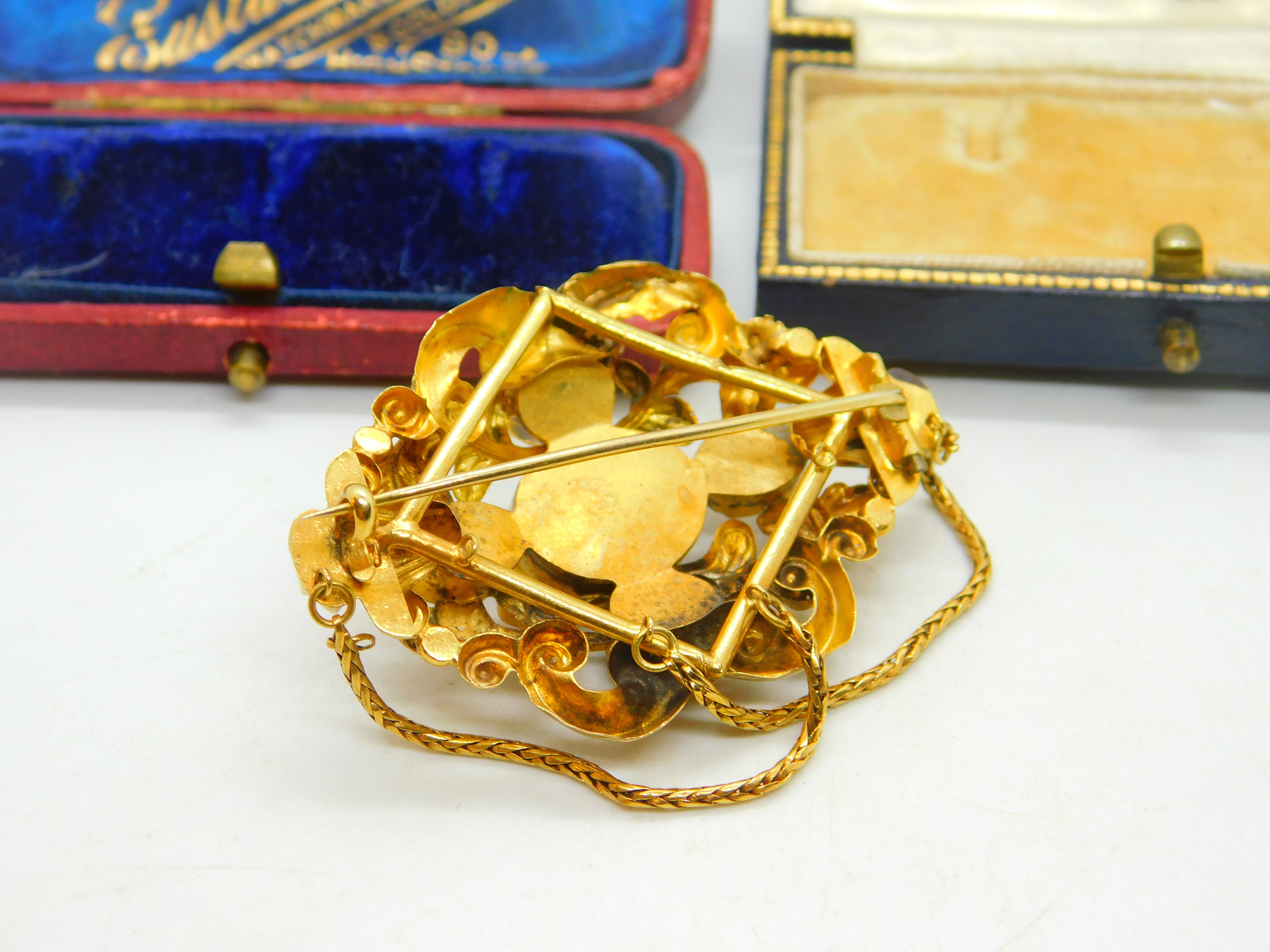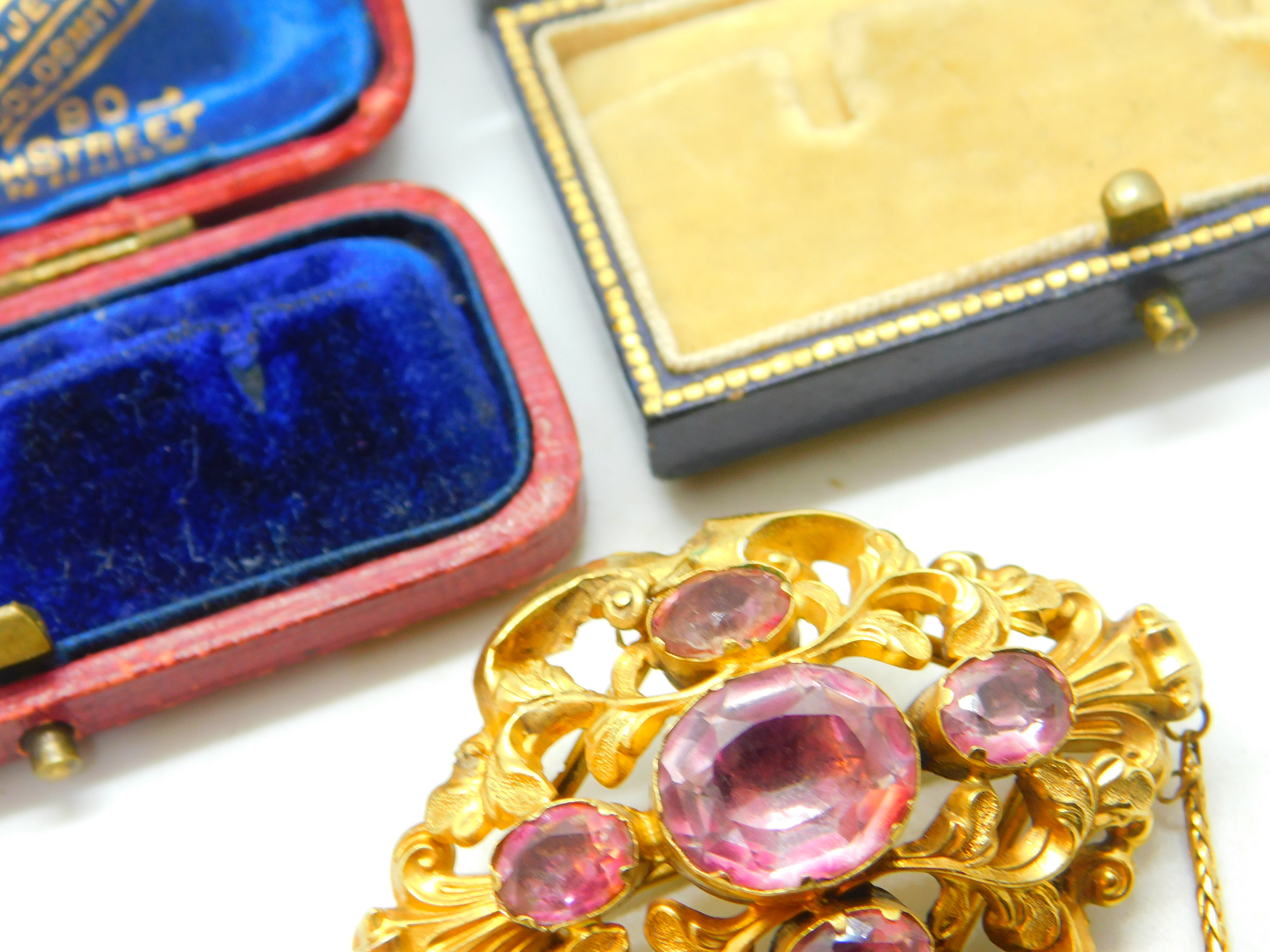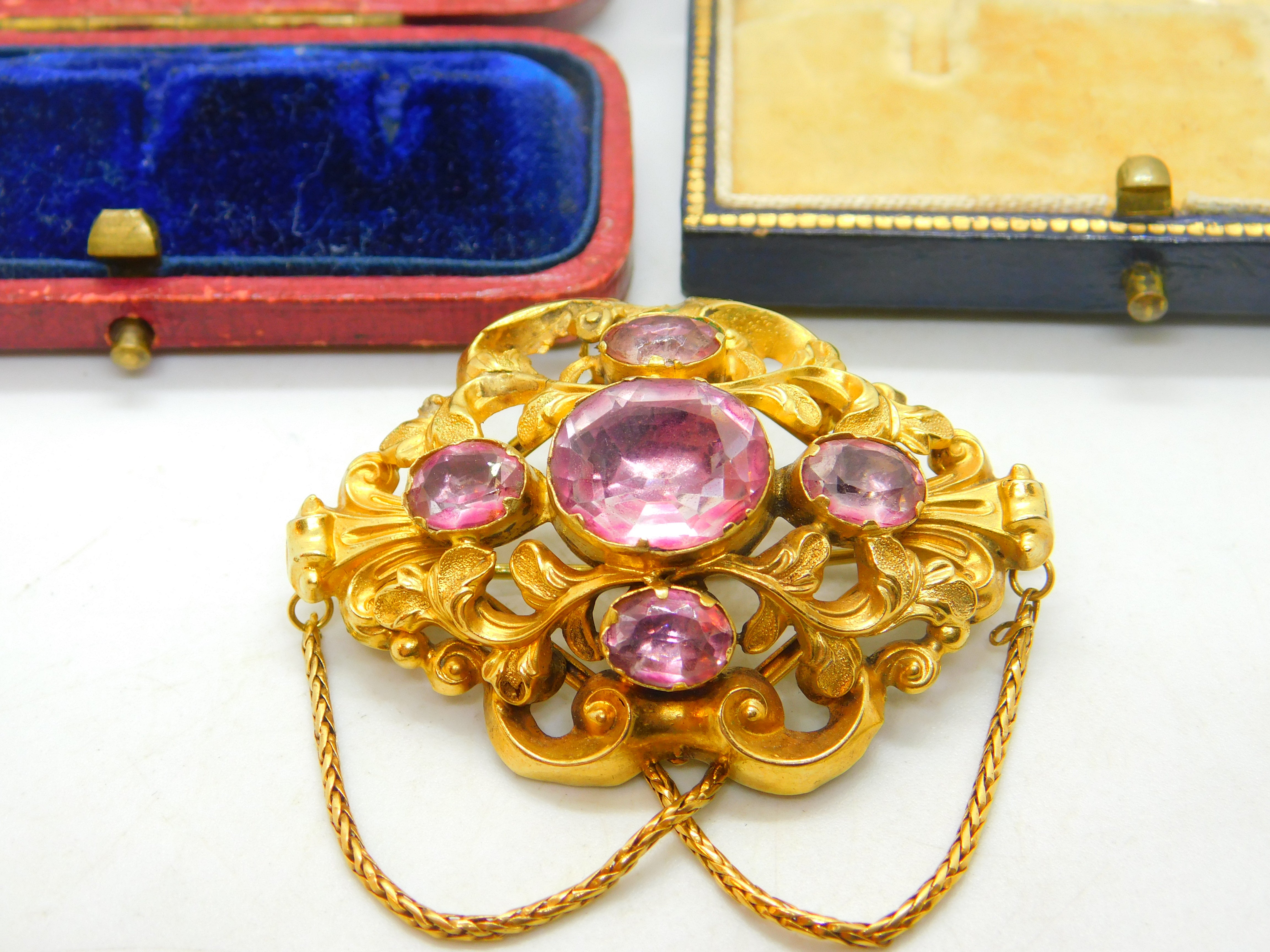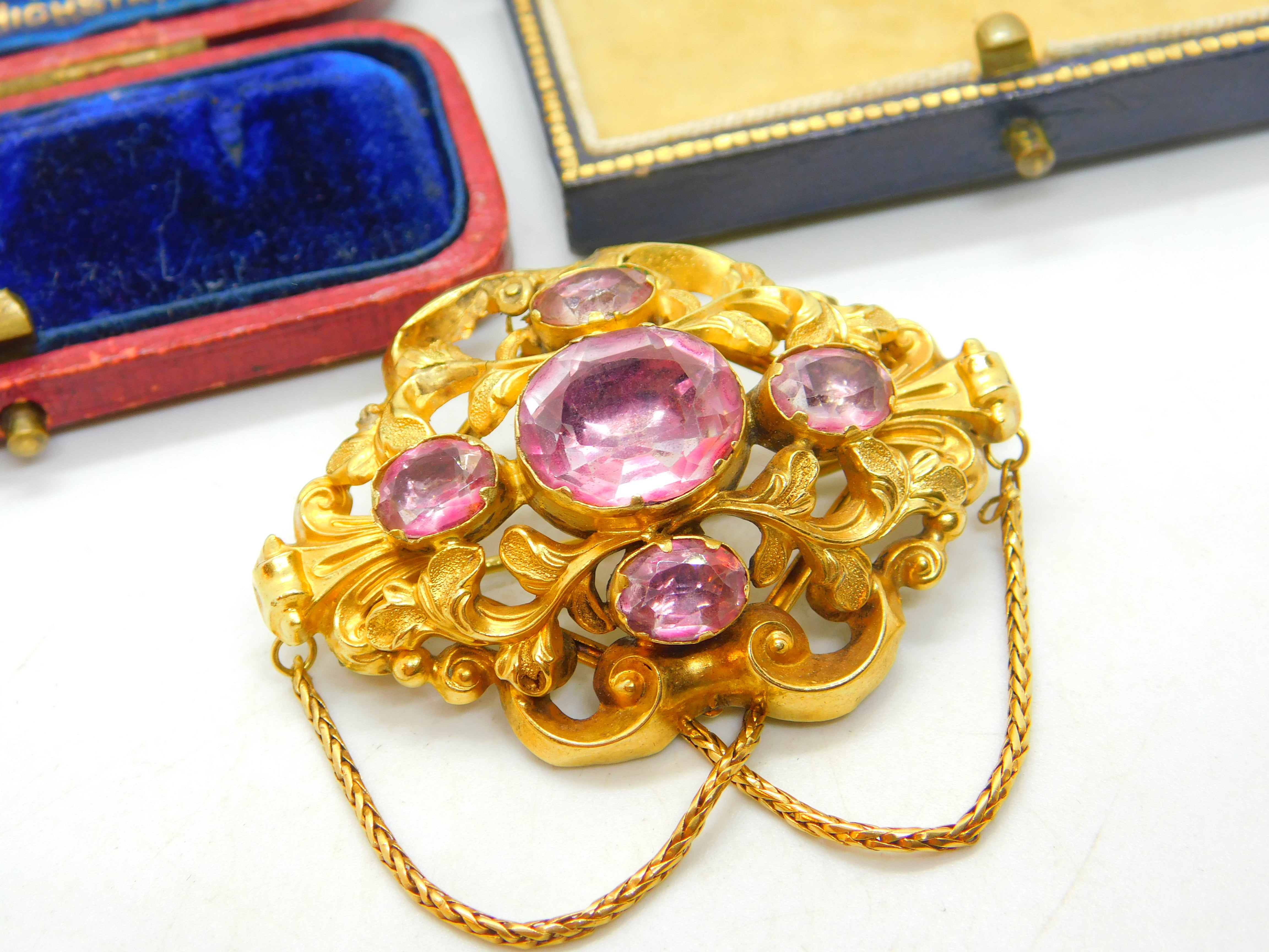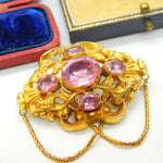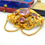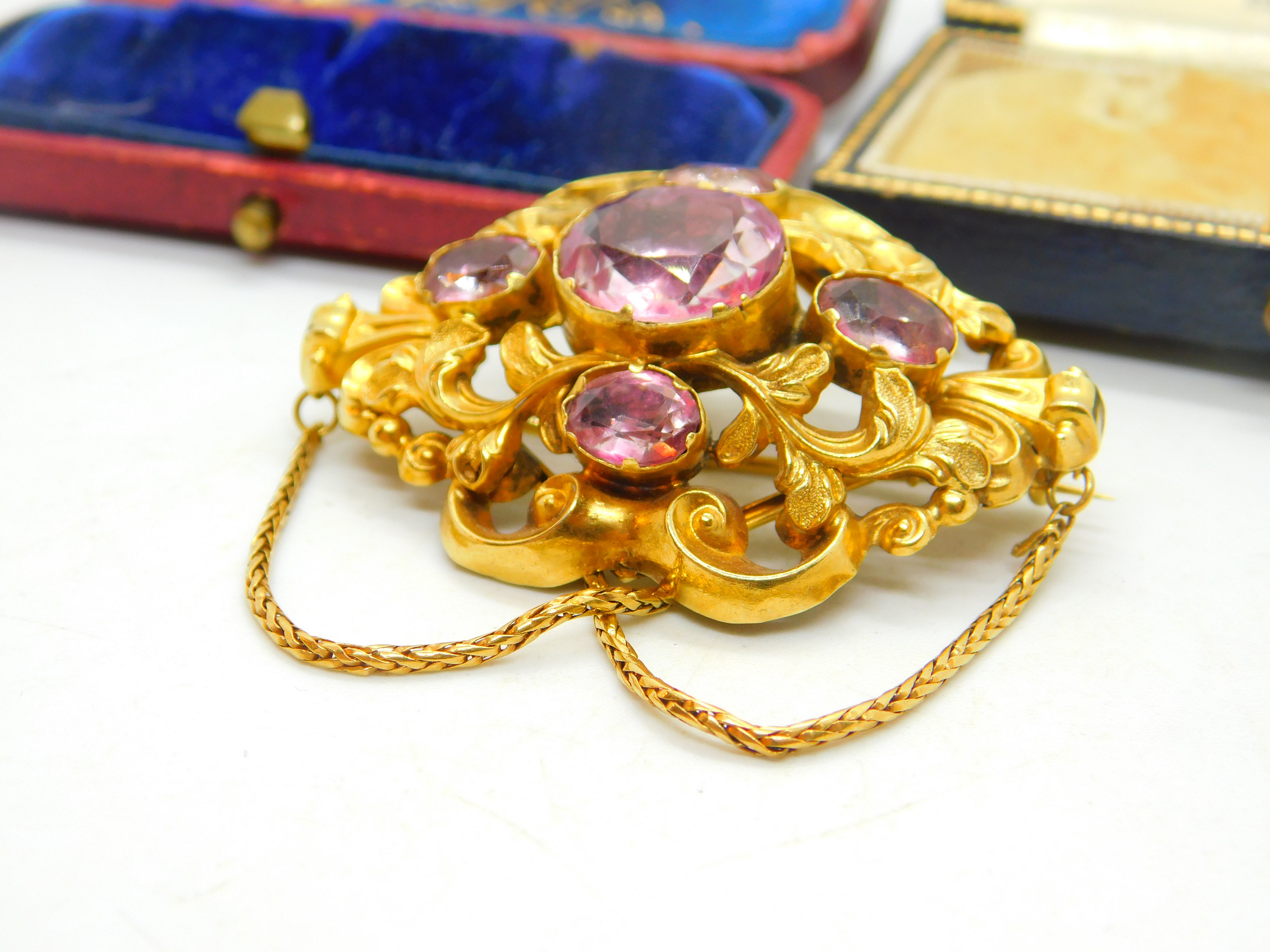 Details: A fantastic and wonderfully designed early Victorian 18ct yellow gold stylistic brooch with superb floral detailing and pink sapphire paste stones inlaid c1850. This is a stunning brooch featuring even two extra links for added effect. The gold has been tested as it is not marked - strong back pin. The stones may be foil back pink sapphire paste although they appear as natural sapphires and the backs are sealed so it is challenging to confirm. This is a wonderful item that would make a perfect gift or addition to any collection. The item is in good condition, all our items are quality conditioned prior to listings however some may have age related signs of wear commensurate with their antique status; please refer to the photos provided as they further inform condition. Please do not hesitate to enquire if you have any questions regarding the product. The box pictured is for presentation and is not included in the listings unless specifically stated otherwise.