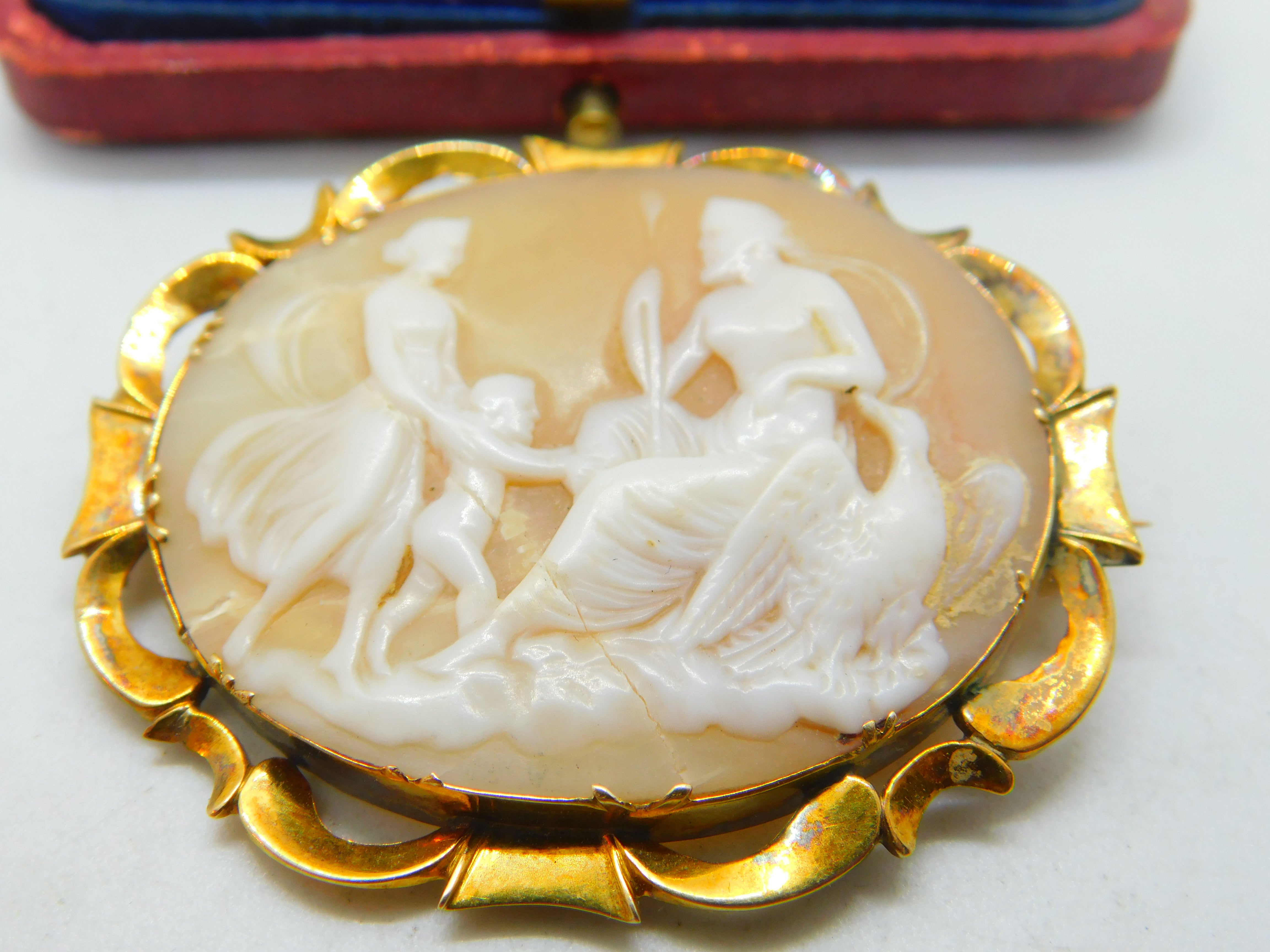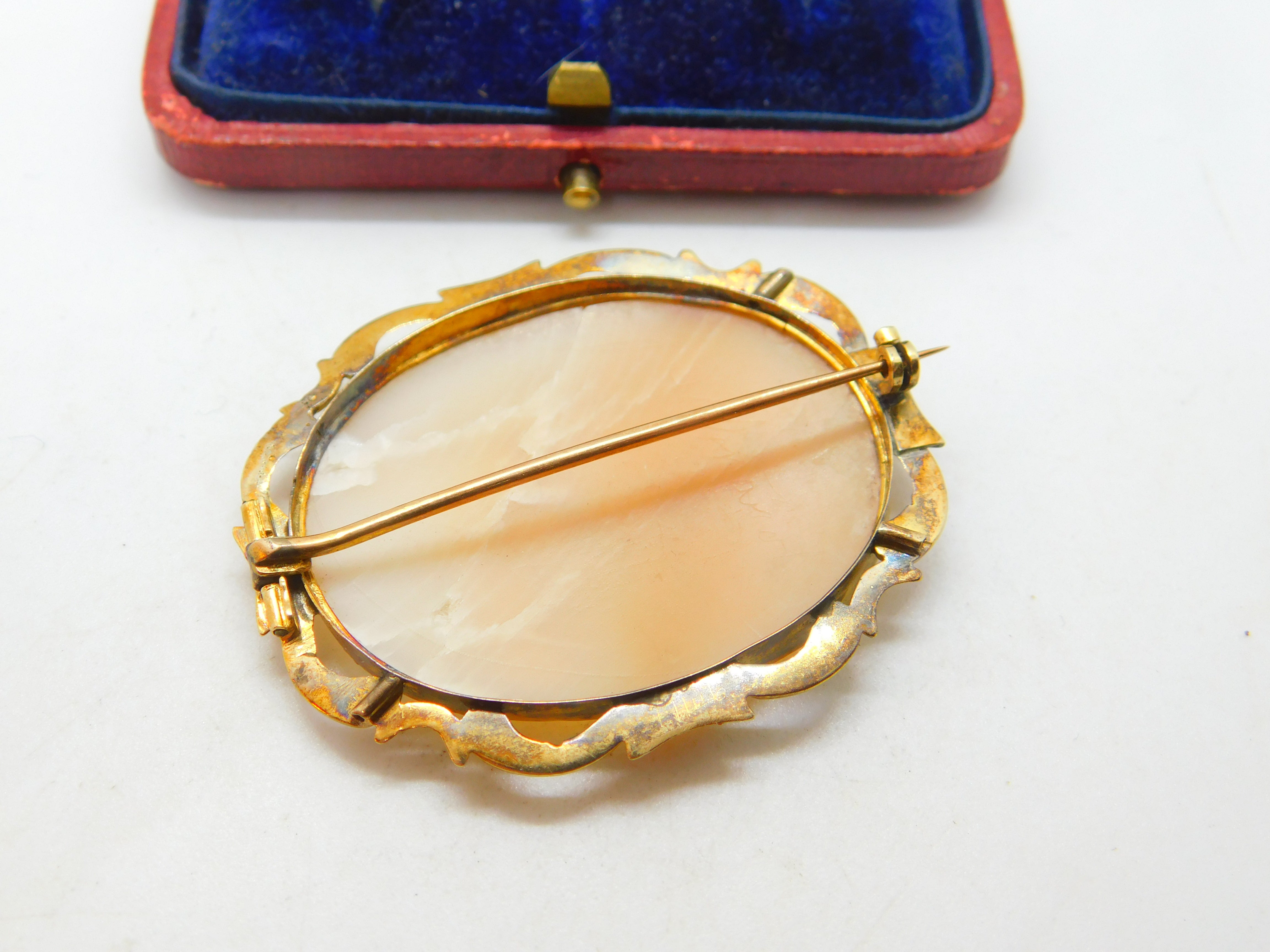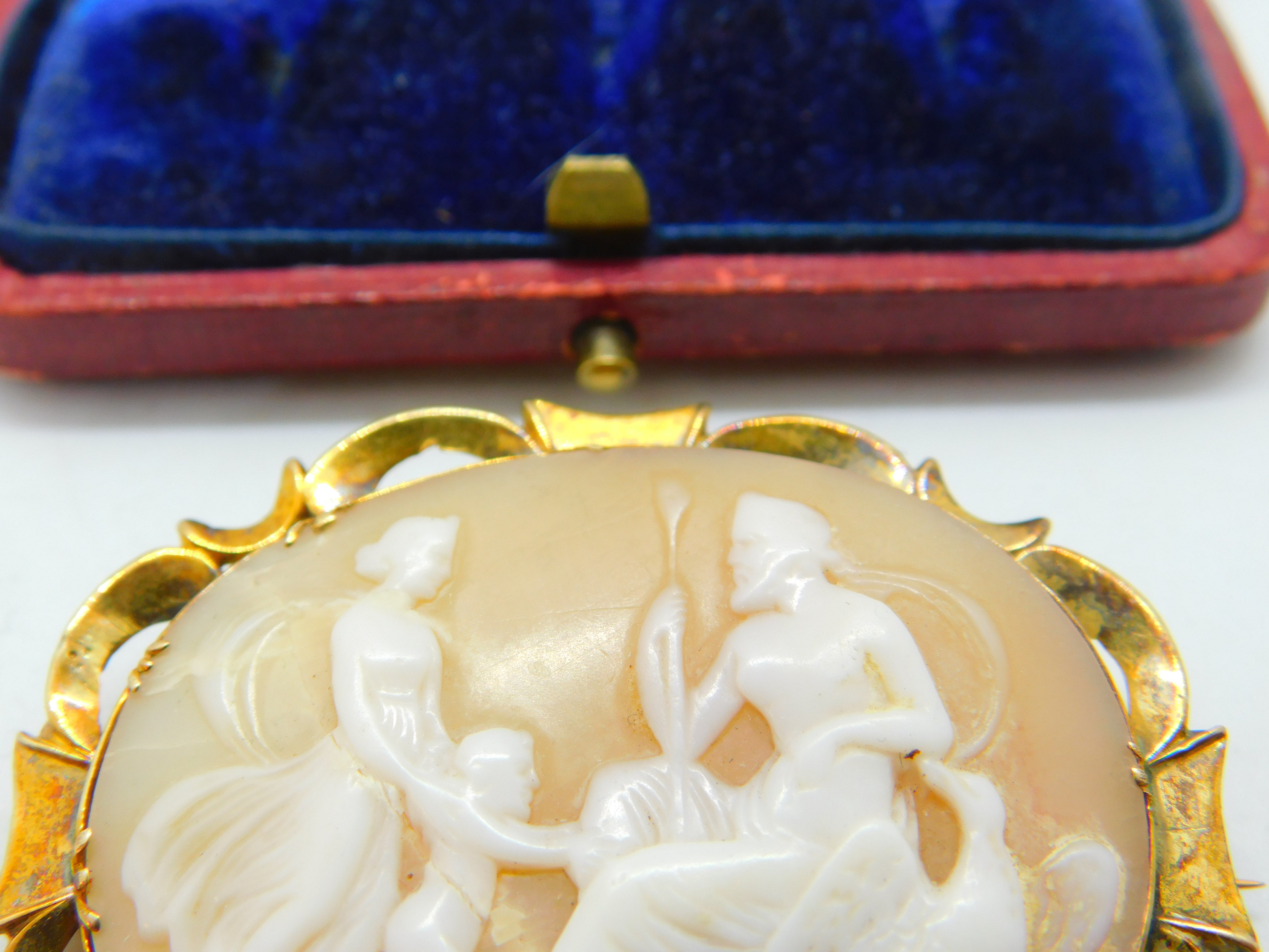 Details: A fantastic and wonderfully designed antique Victorian 9ct yellow gold set carved shell cameo with superb image depicting Jupiter sitting with an eagle with his wife juno to the left c1860. The gold has been XRF tested and needs a good polish. This is a wonderful item that would make a perfect gift or addition to any collection. The BOX pictured is for PRESENTATION ONLY and is NOT included in the listings but used to frame the pictures unless specifically stated otherwise.