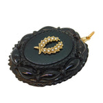 Details: A fantastic and wonderfully designed antique Victorian 9ct gold carved whitby jet mourning locket pendant with charming seed pearl set wreath detailing c1860, the gold has been XRF tested. This is a wonderful item that would make a perfect gift or addition to any collection.