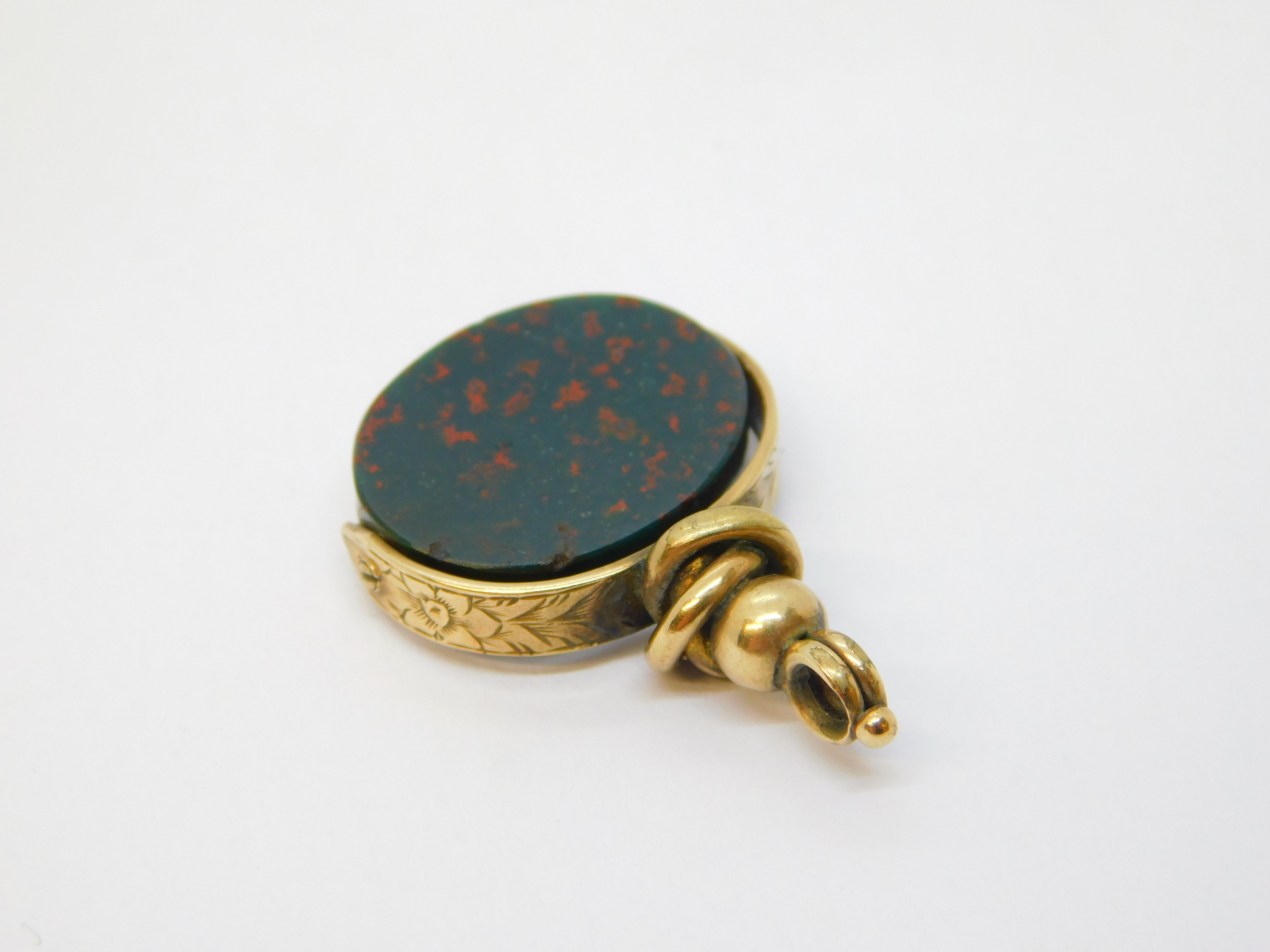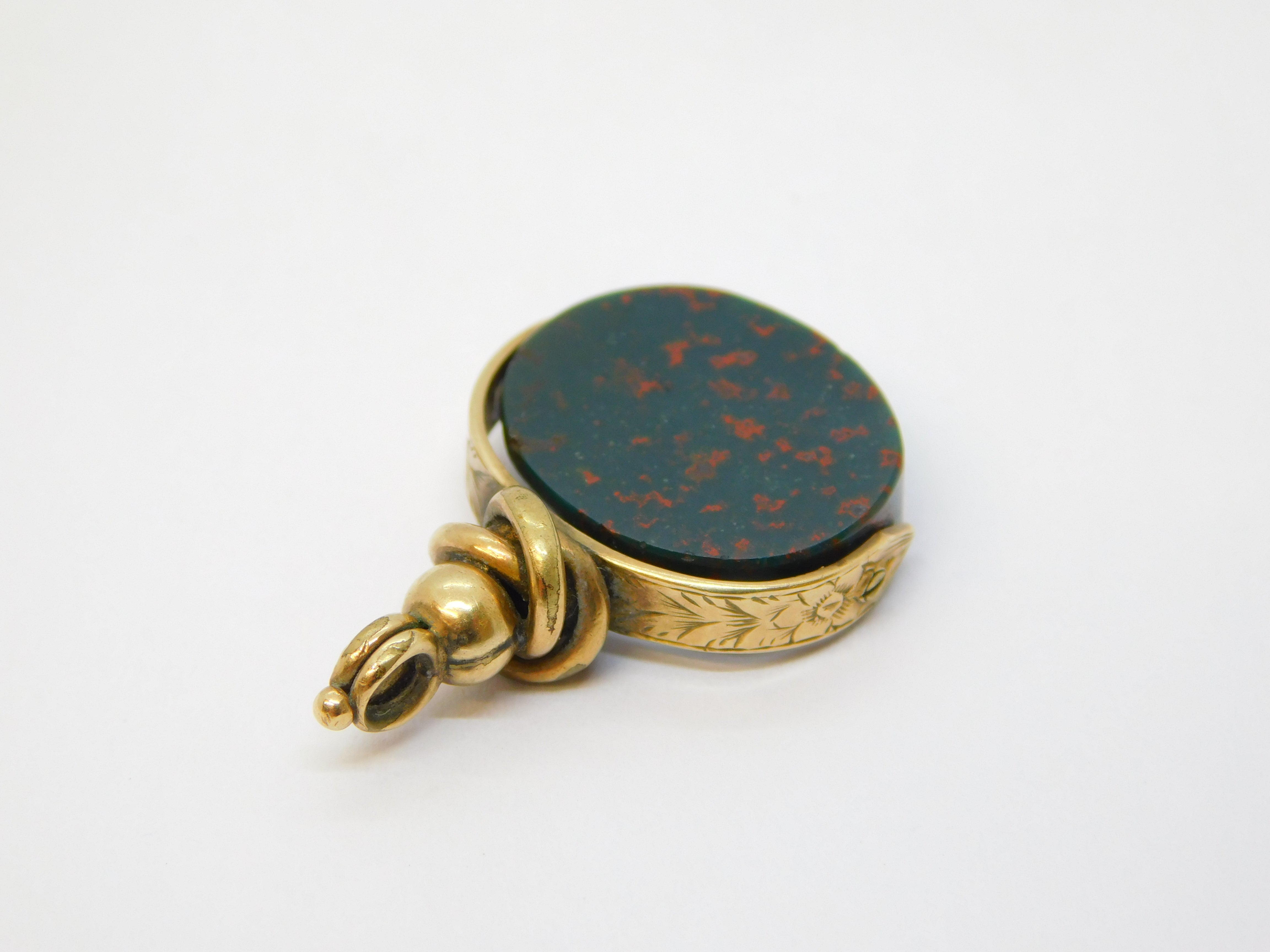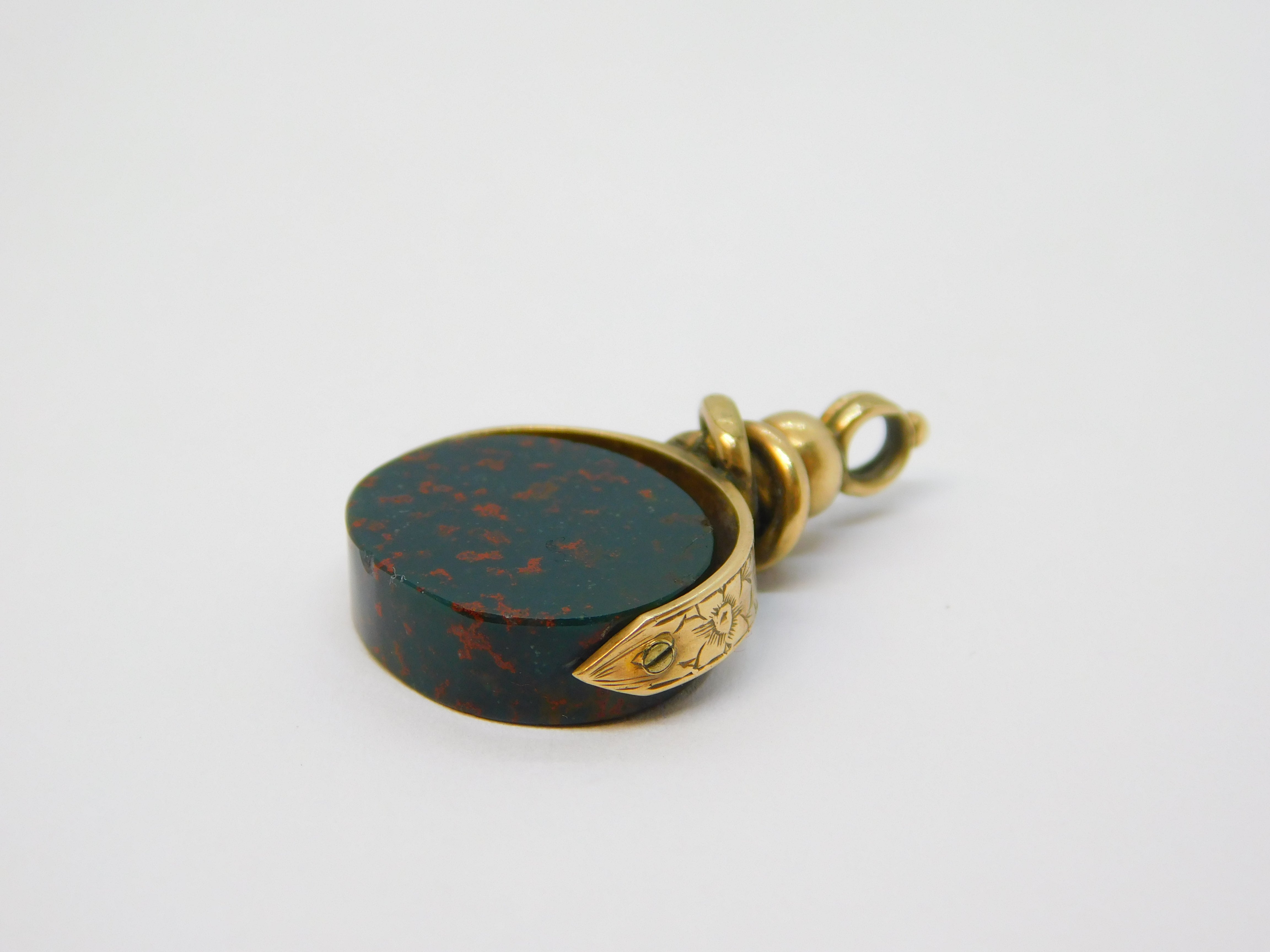 Details: A fantastic and wonderfully designed antique Victorian 9ct yellow gold topped bloodstone spinner fob pendant with lovely detailing c1890, the gold has been XRF tested as it is unmarked. This is a wonderful item that would make a perfect gift or addition to any collection. We are more than happy to provide XRF reports for items upon request.