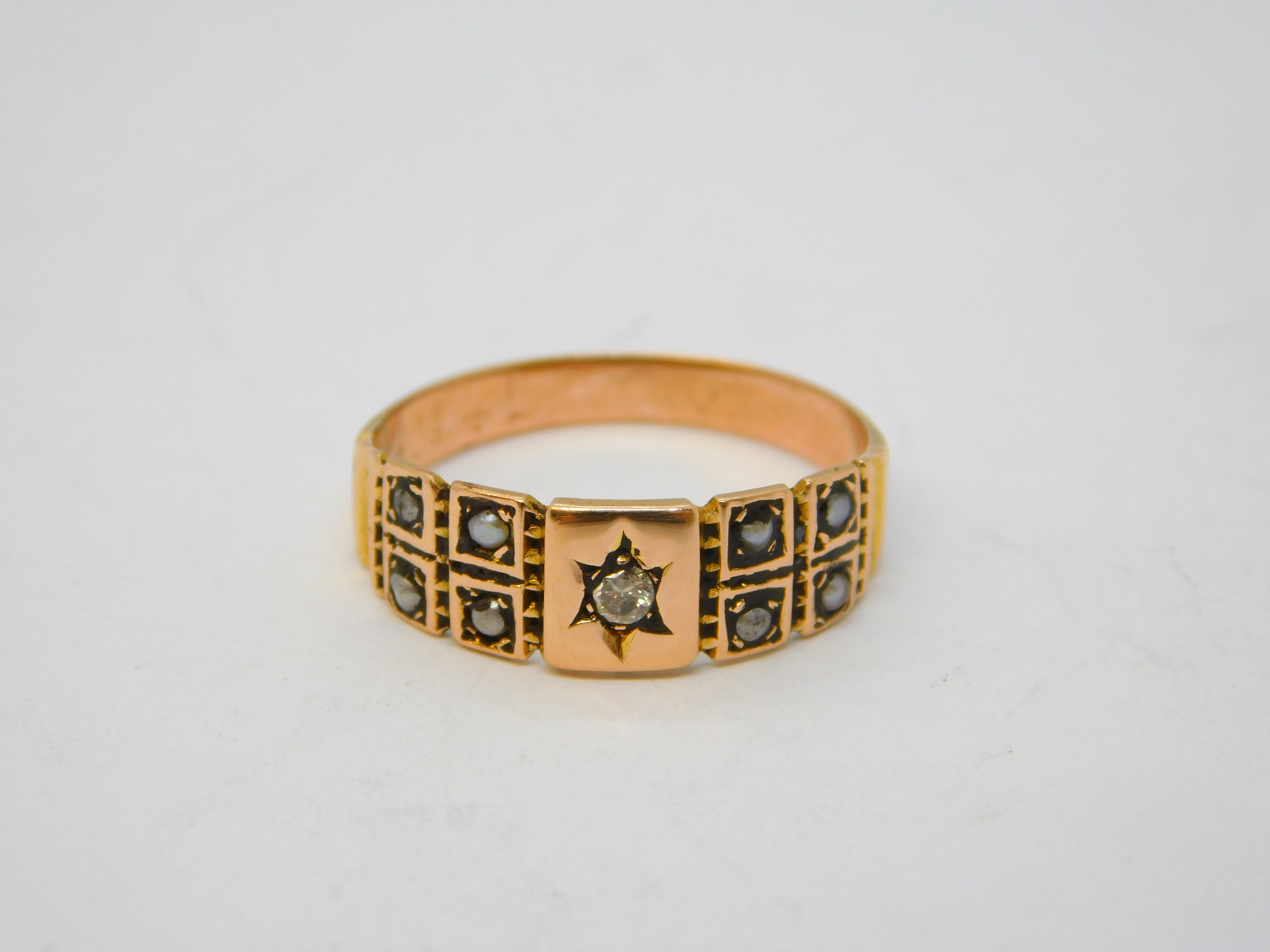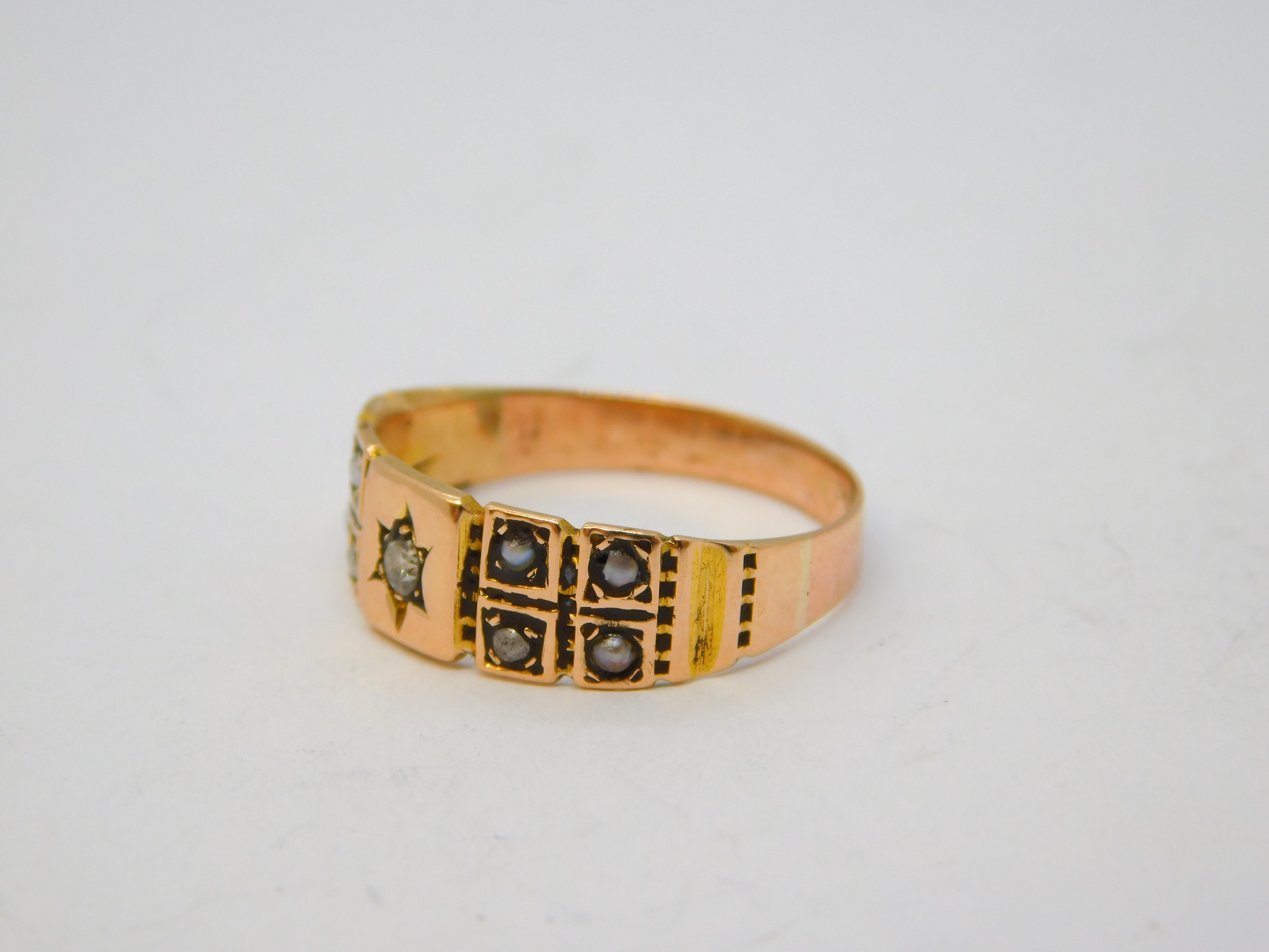 Victorian 9ct Rose Gold, Diamond & Seed Pearl Mourning Ring Antique c1880