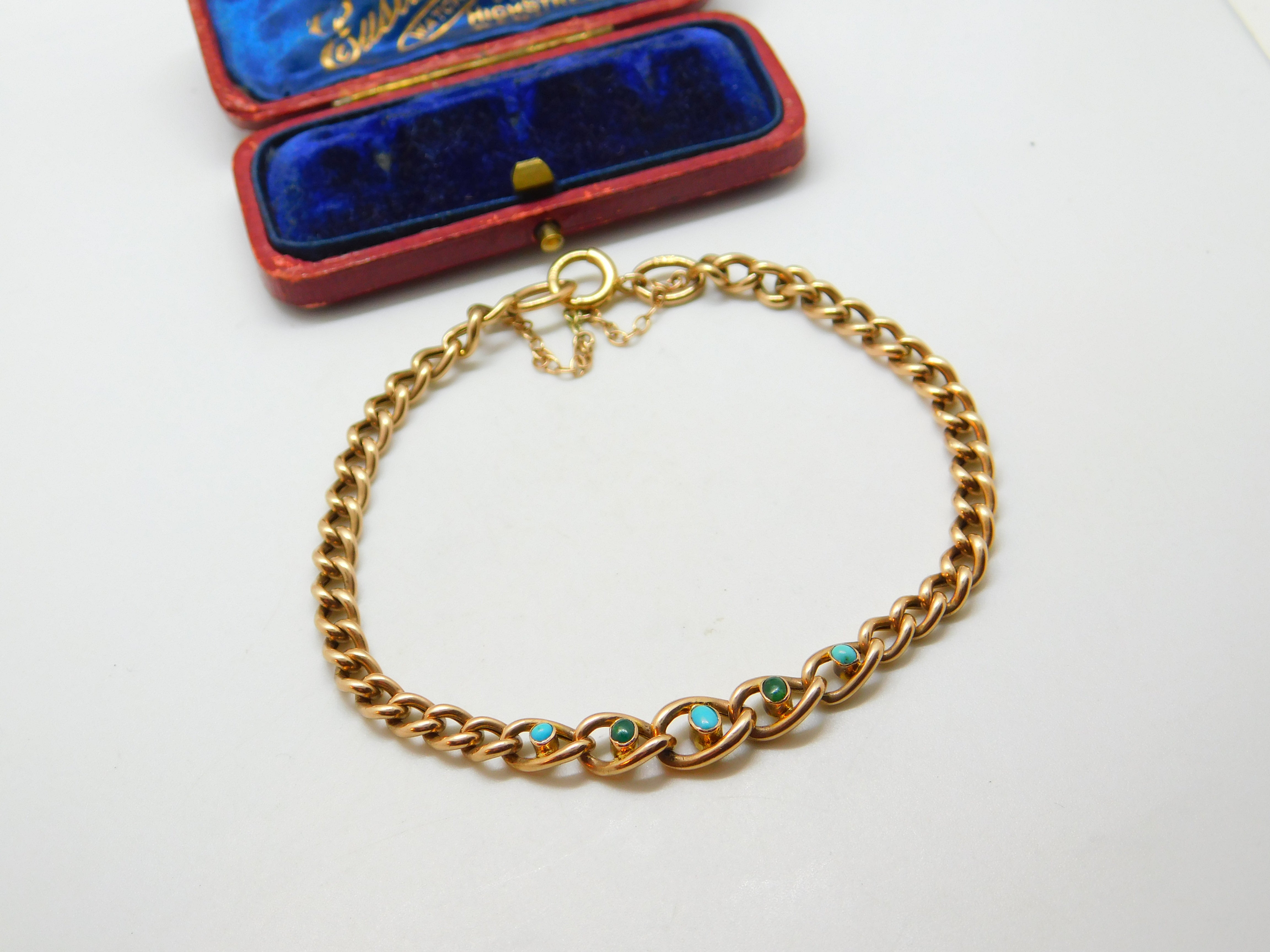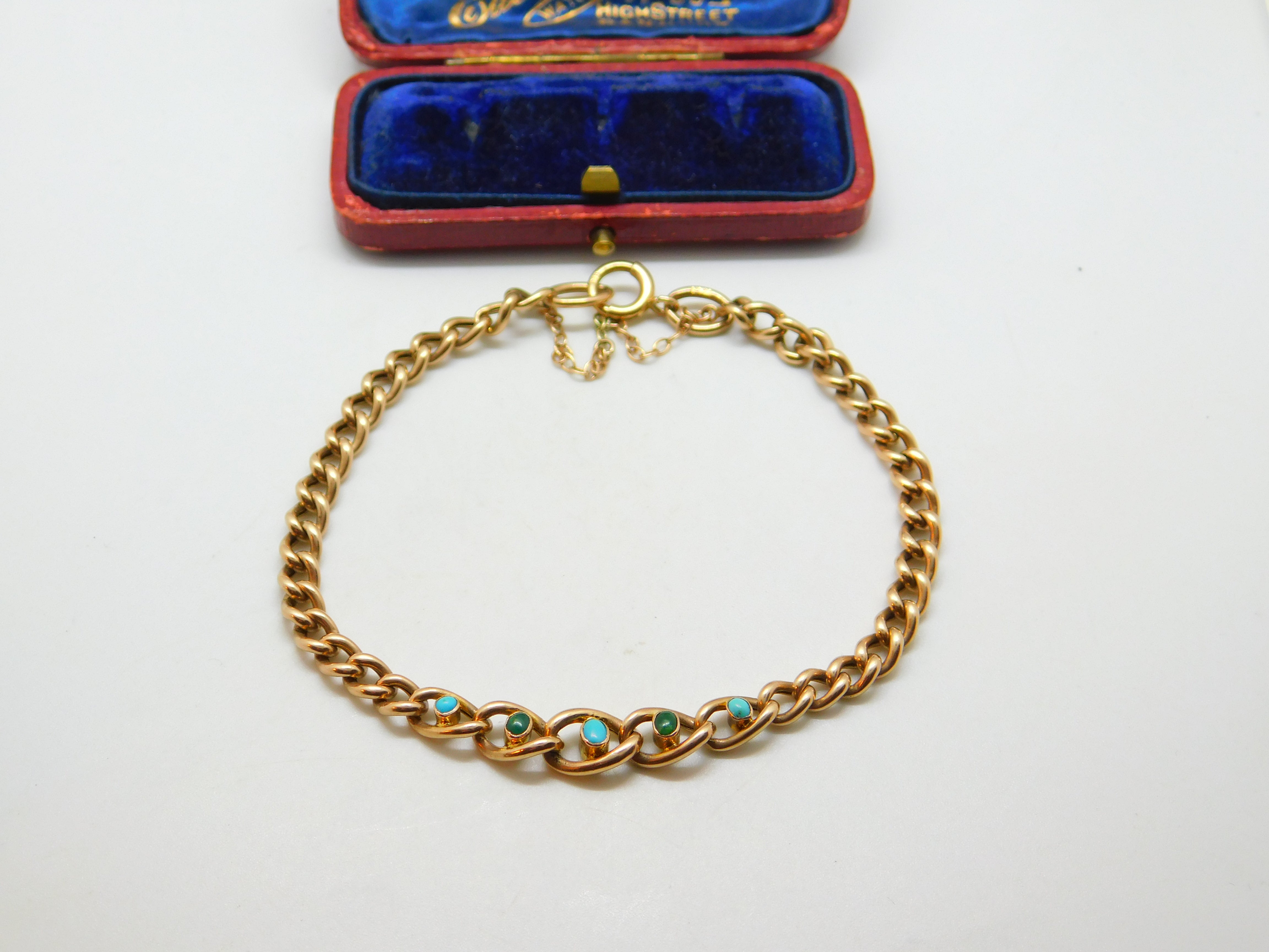 Details: A fantastic and wonderfully designed antique Victorian 9ct rose gold curb link bracelet set with five beautiful turquoise stones to the centre hallmarked to the link adjoining the clasp 9ct and tested c1890. This is a wonderful item that would make a perfect gift or addition to any collection. The BOX pictured is for PRESENTATION ONLY and is NOT included in the listings but used to frame the pictures unless specifically stated otherwise.