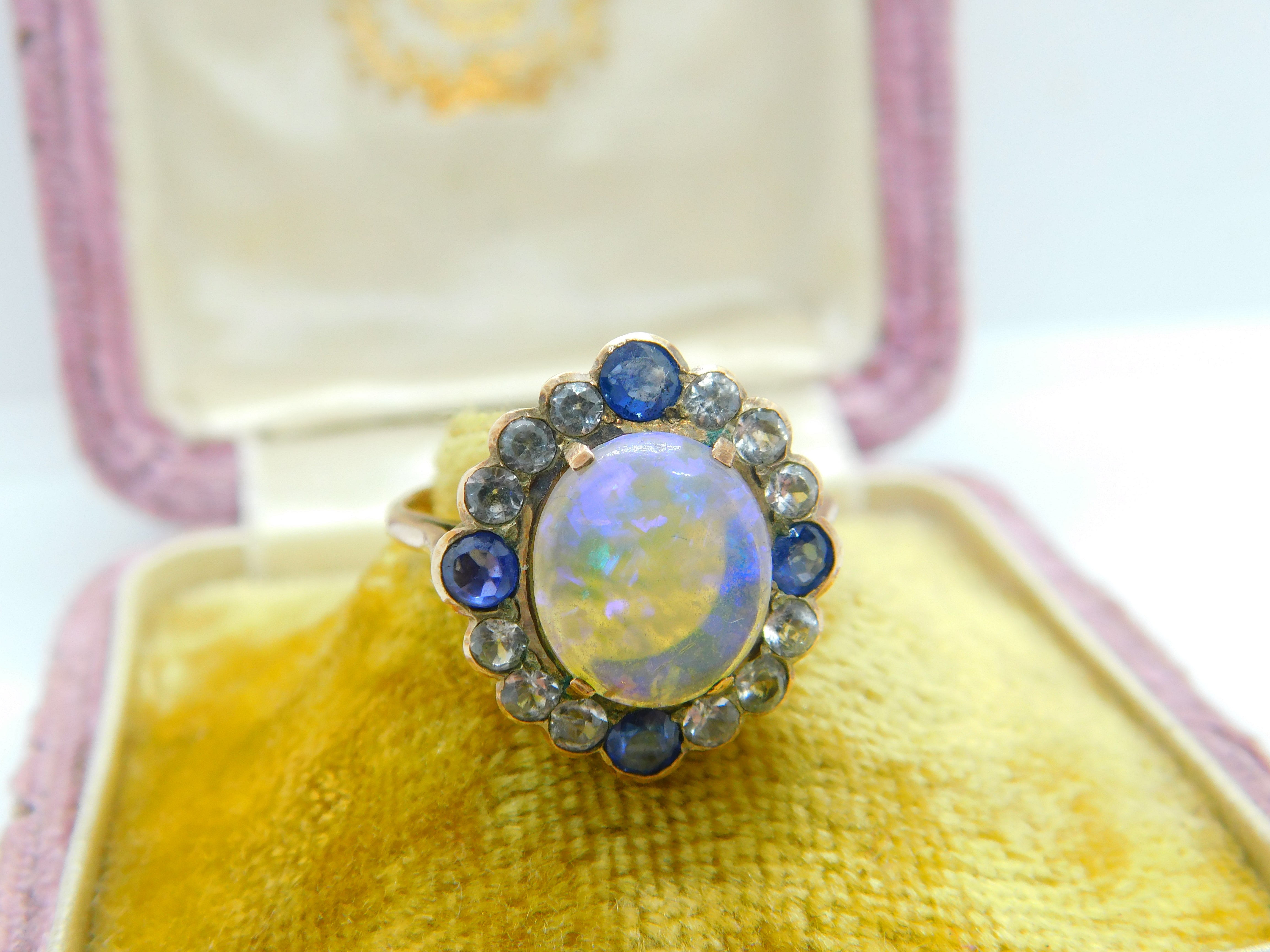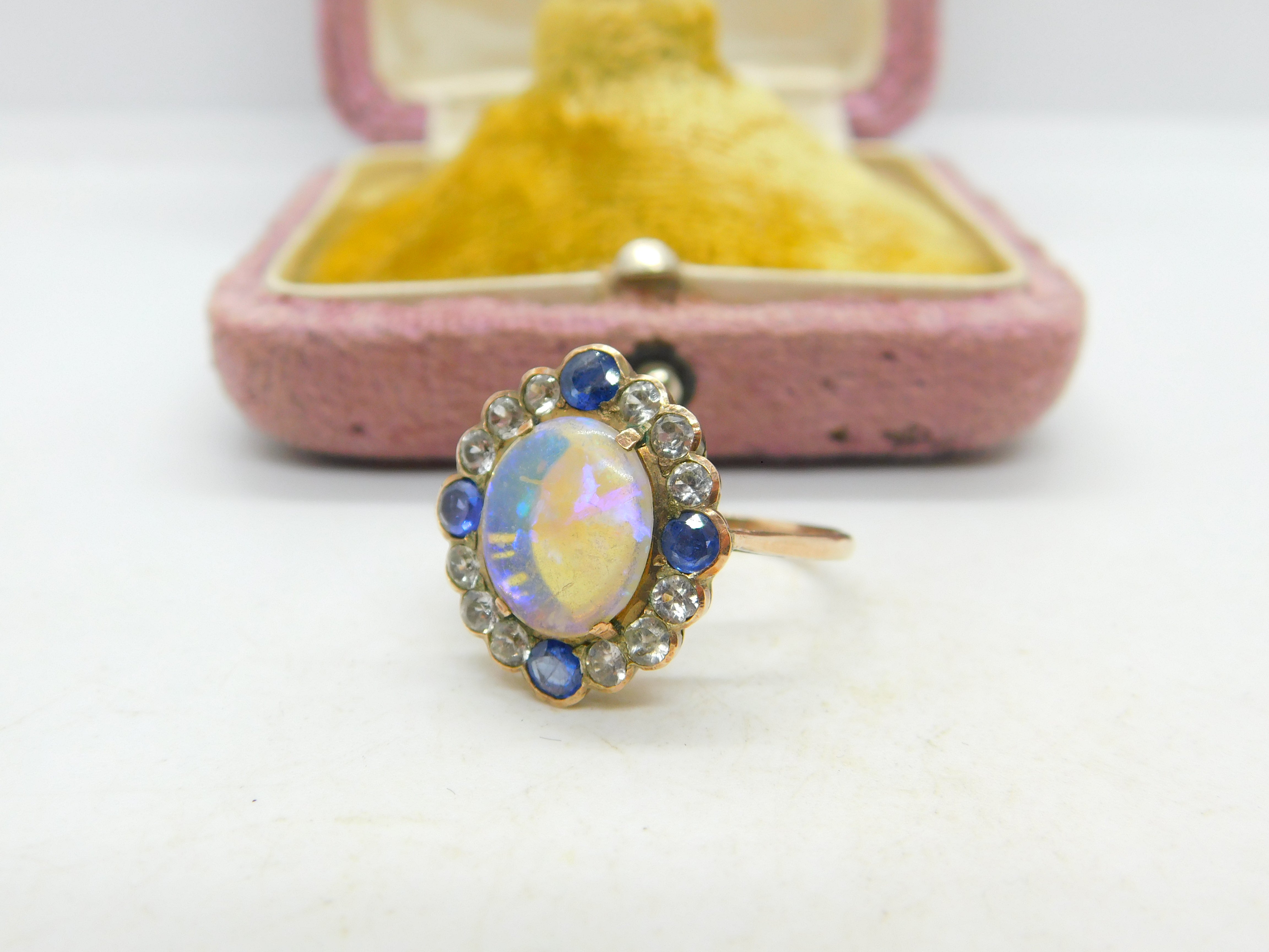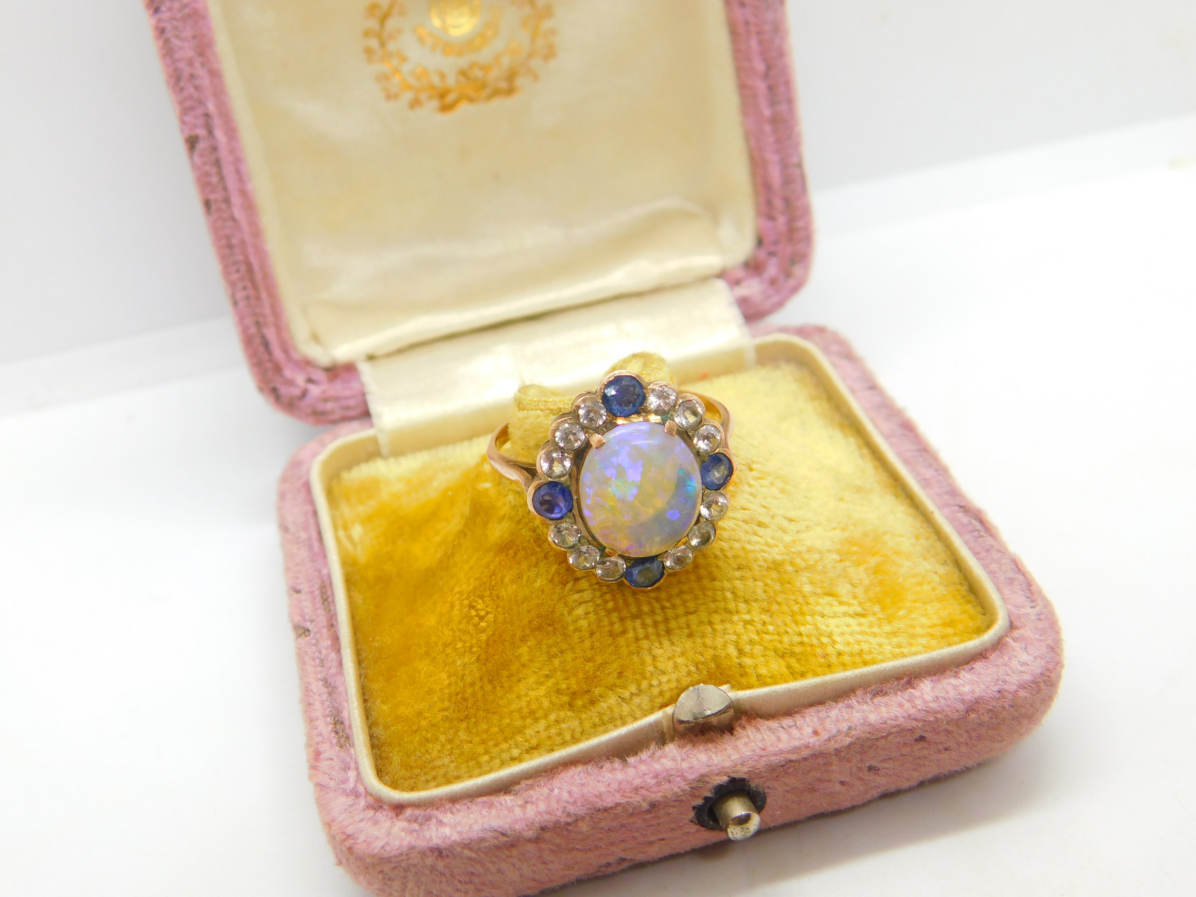 Details: A fantastic and wonderfully designed antique Victorian 9ct rose gold set dress ring with the most stunning water opal to the centre surrounded by blue & white sapphires c1850. The gold has been XRF tested and the stones have equally been tested. This is a wonderful item that would make a perfect gift or addition to any collection. The BOX pictured is for PRESENTATION ONLY and is NOT included in the listings but used to frame the pictures unless specifically stated otherwise.