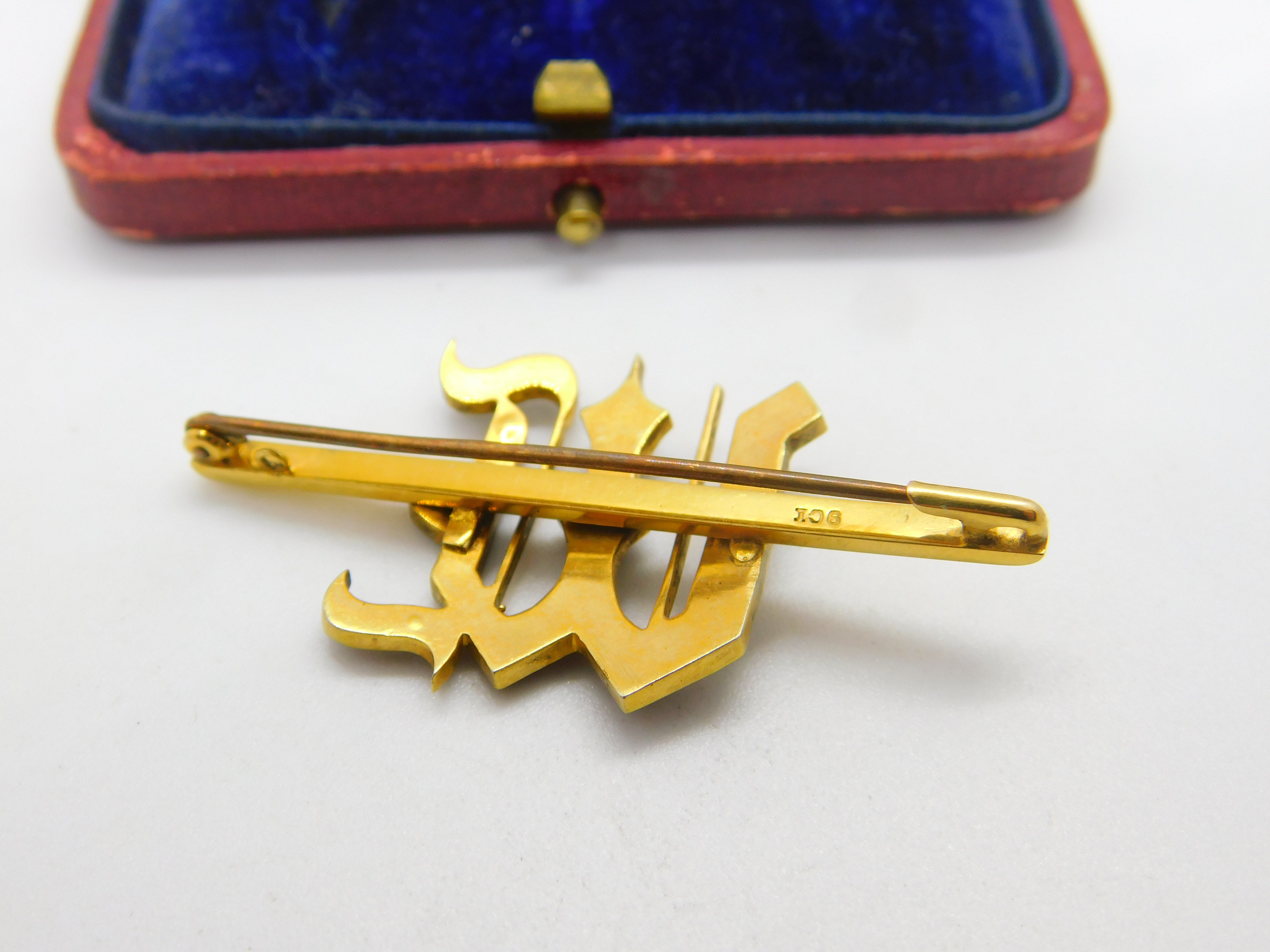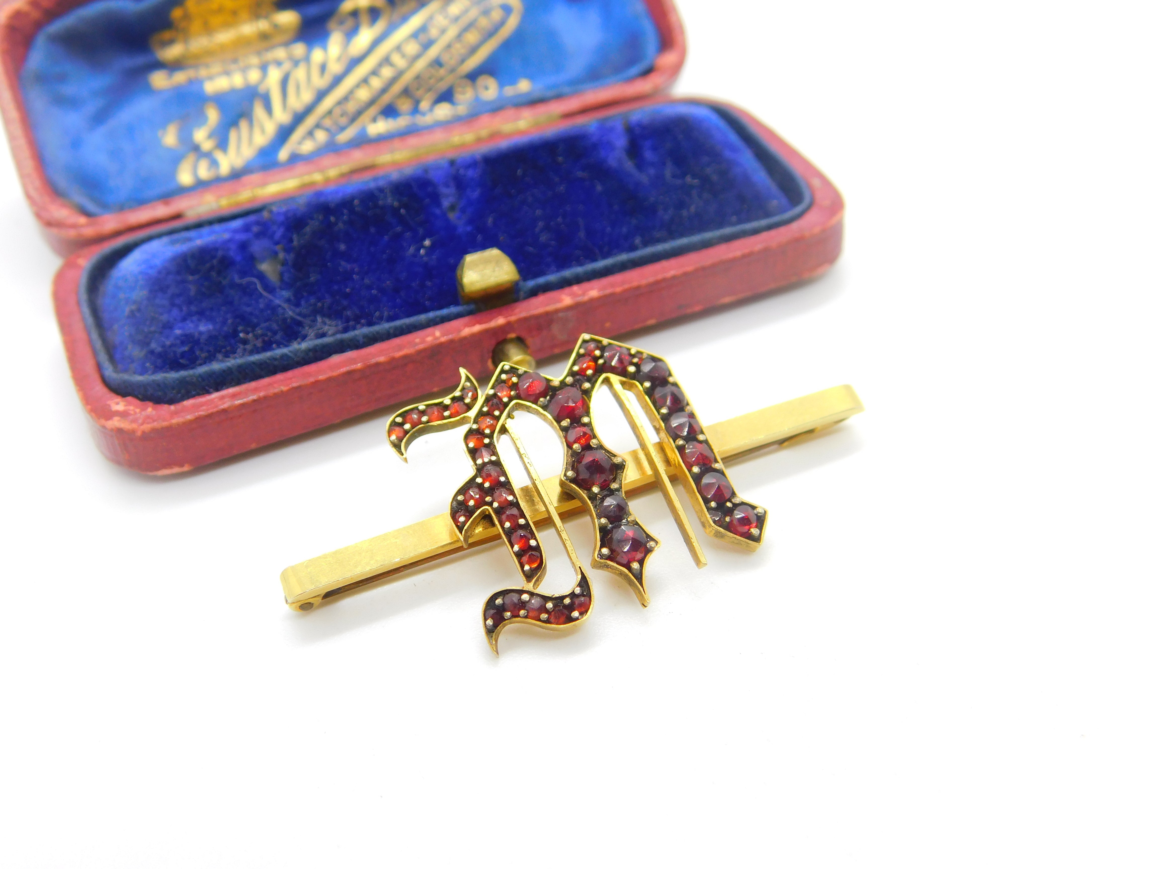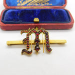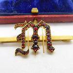 Victorian 9ct Yellow Gold Bohemian Garnet Set 'M Initial Brooch Antique c1860