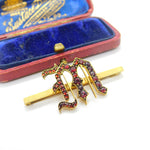 Simply stunning deep red garnet stones to this antique 9ct yellow gold initial brooch or pin dating from the mid Victorian period. The stones are set to form the letter 'M', all the stones are present, in good order considering age and use and have been tested, please see the pictures. There is a simple gold mark to the rear, this simply reads '9ct'. Good secure clasp and pin. Charming.