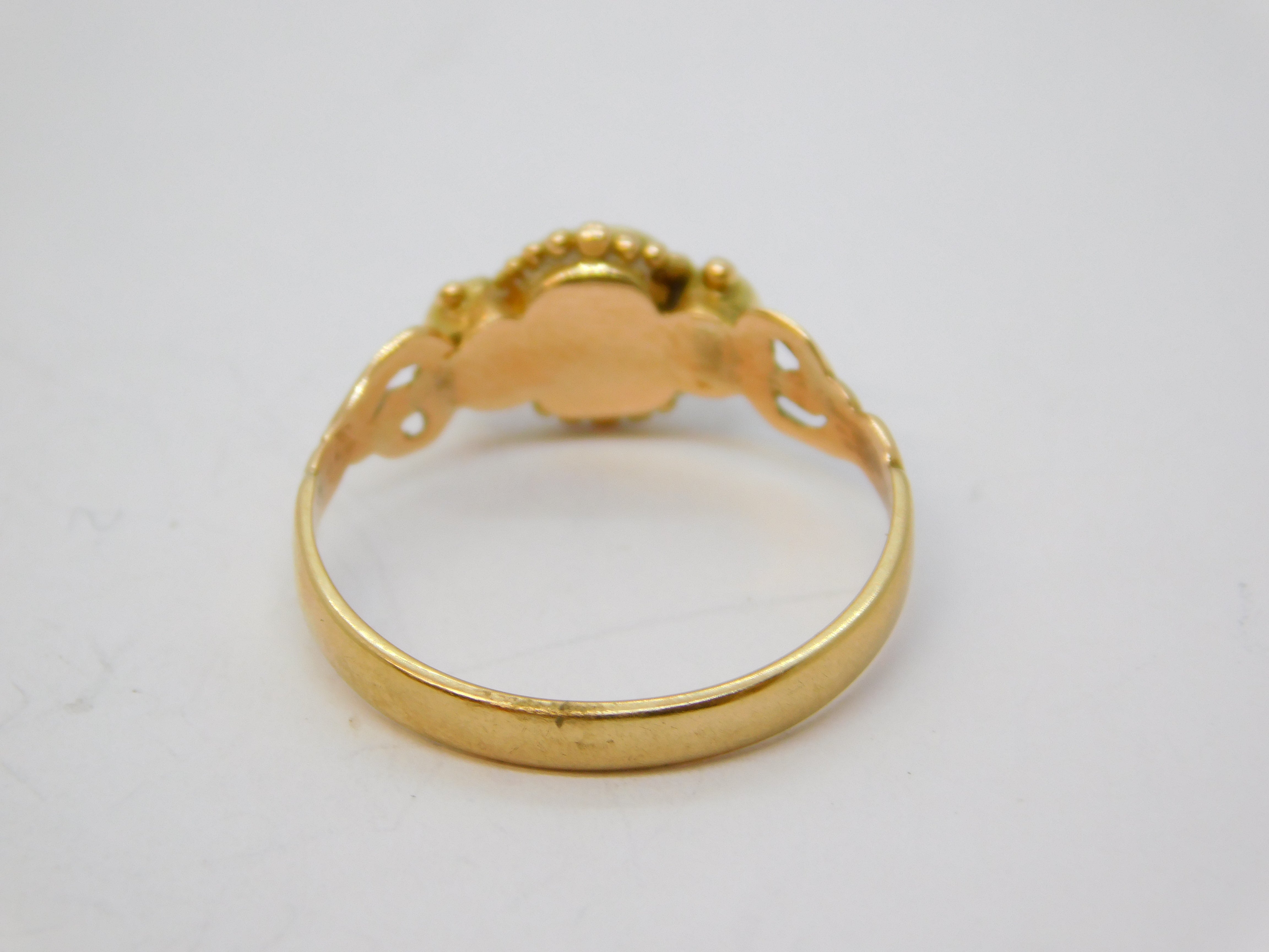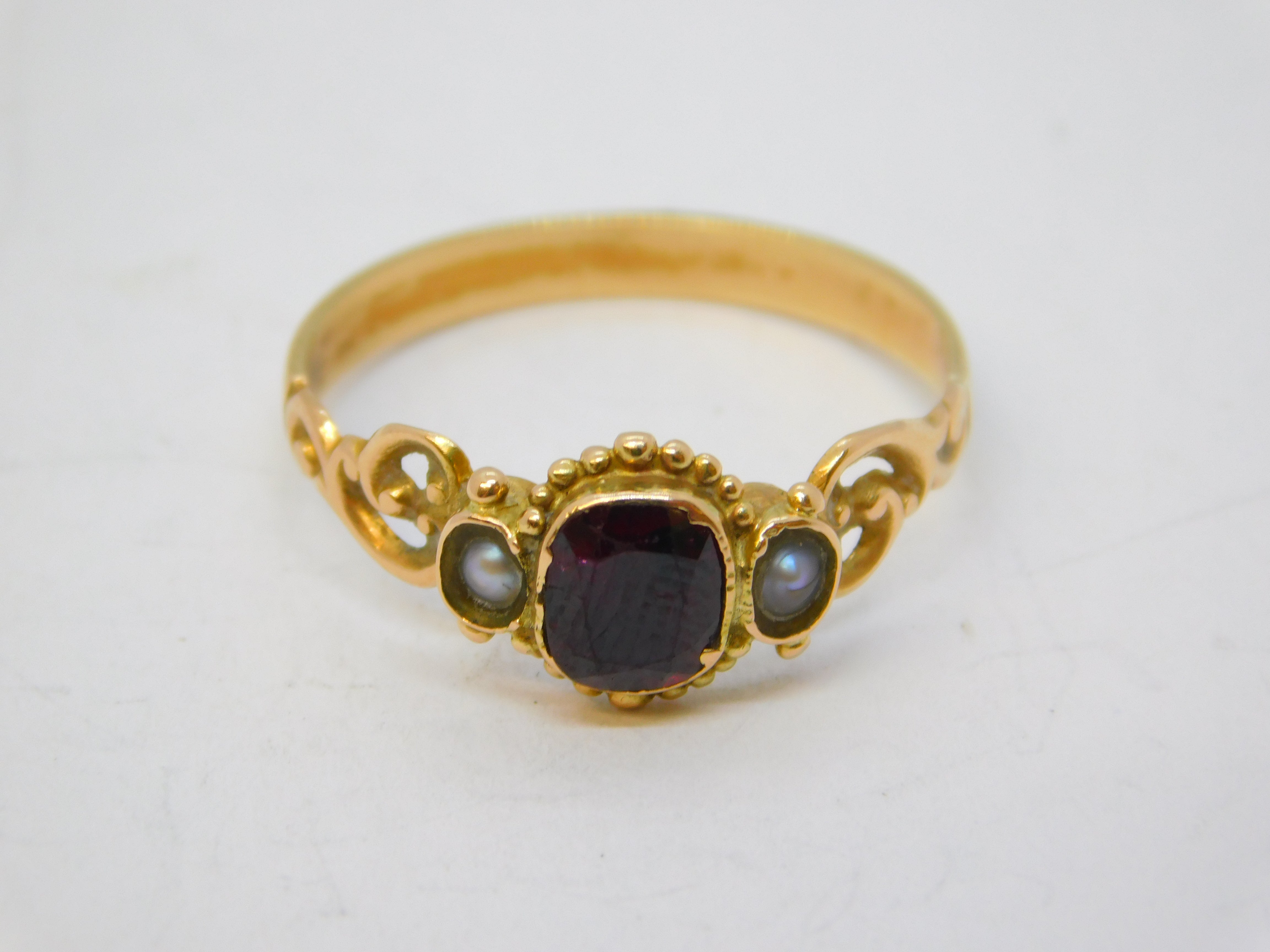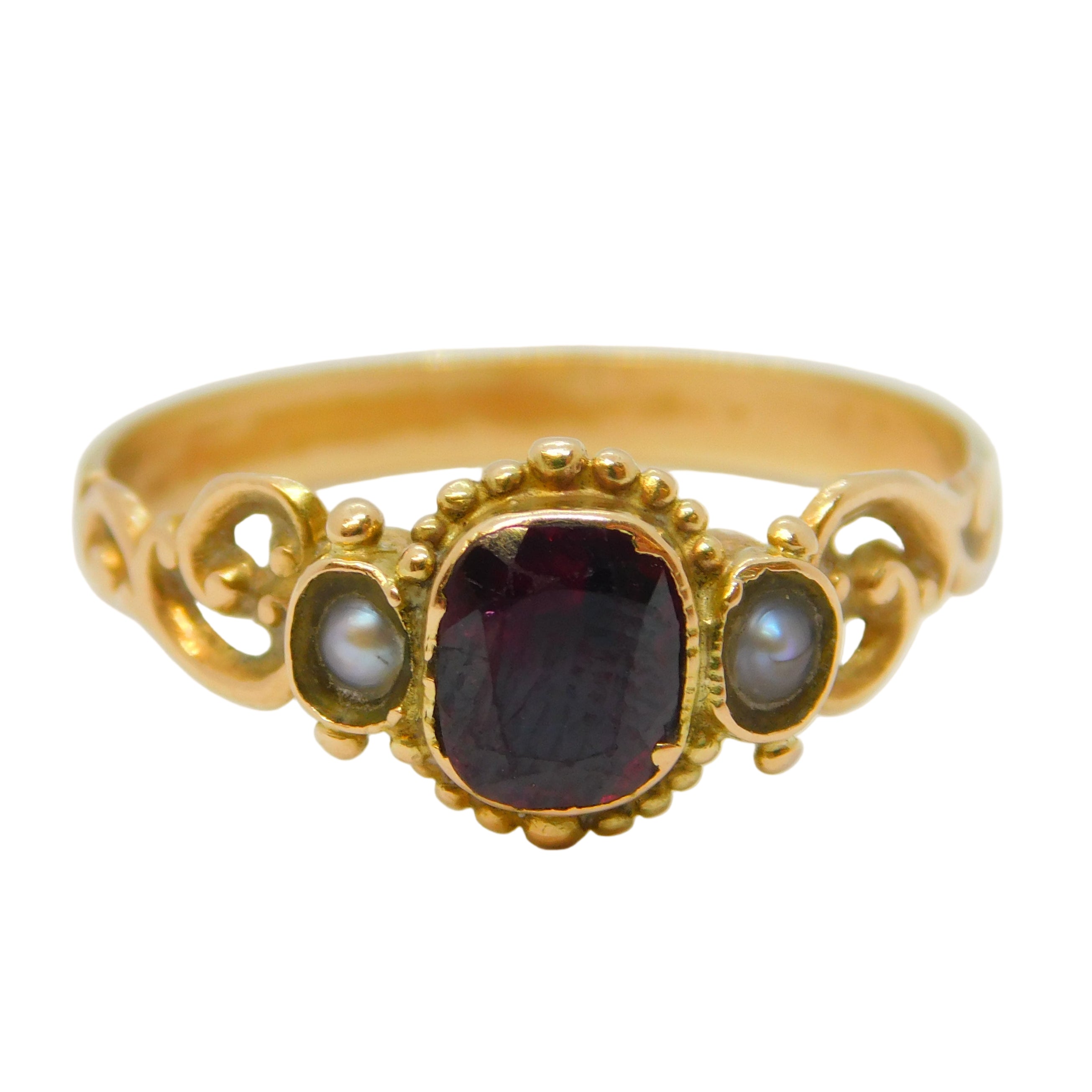 Details: A fantastic and wonderfully designed antique Victorian 9ct yellow gold floral decorated dress ring set with central garnet flanked with seed pearls c1860, the gold has been XRF tested - please see report. This is a wonderful item that would make a perfect gift or addition to any collection. We are more than happy to provide XRF reports for items upon request.