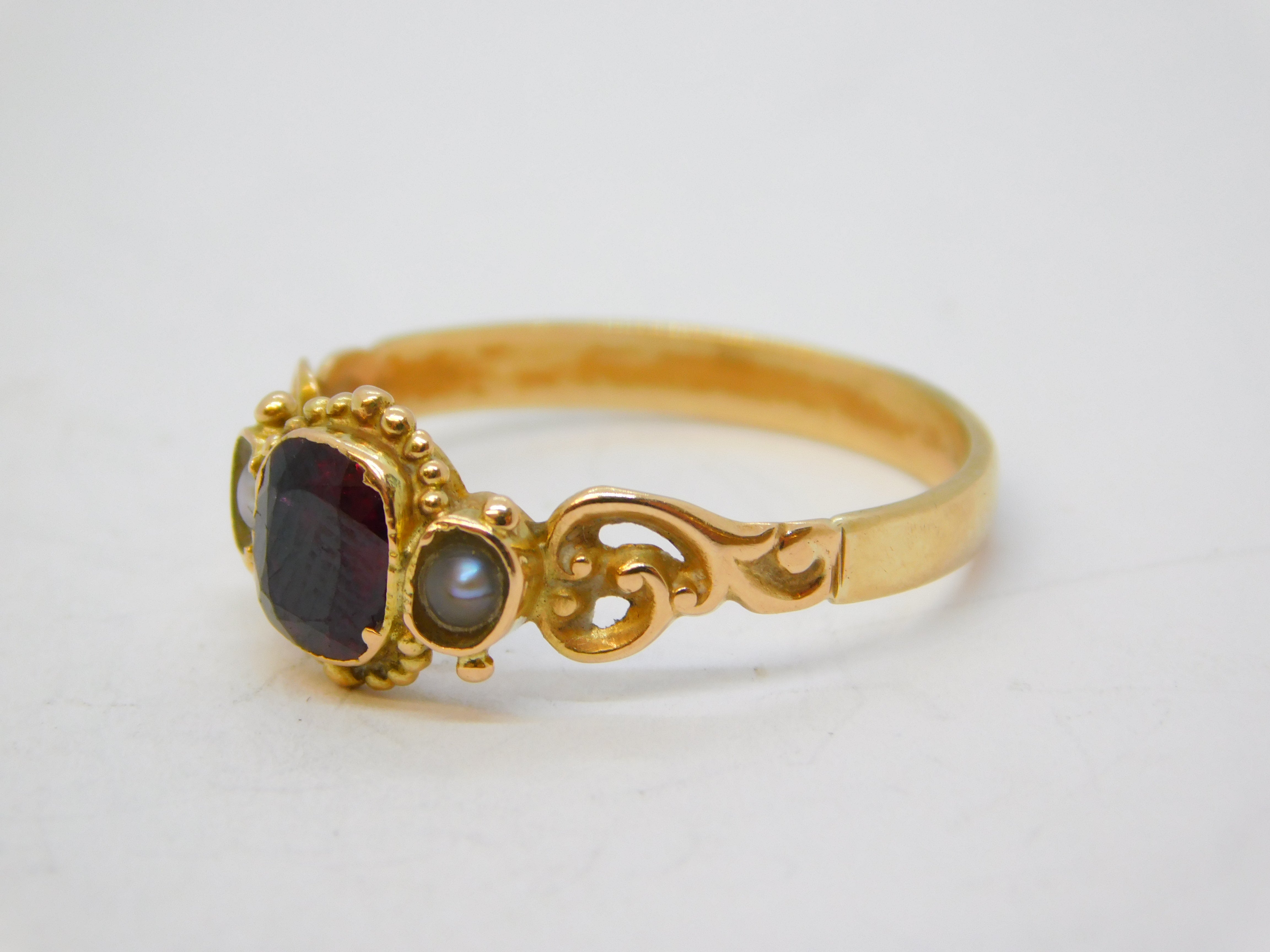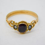 Victorian 9ct Yellow Gold, Garnet & Seed Pearl Dress Ring Antique c1860