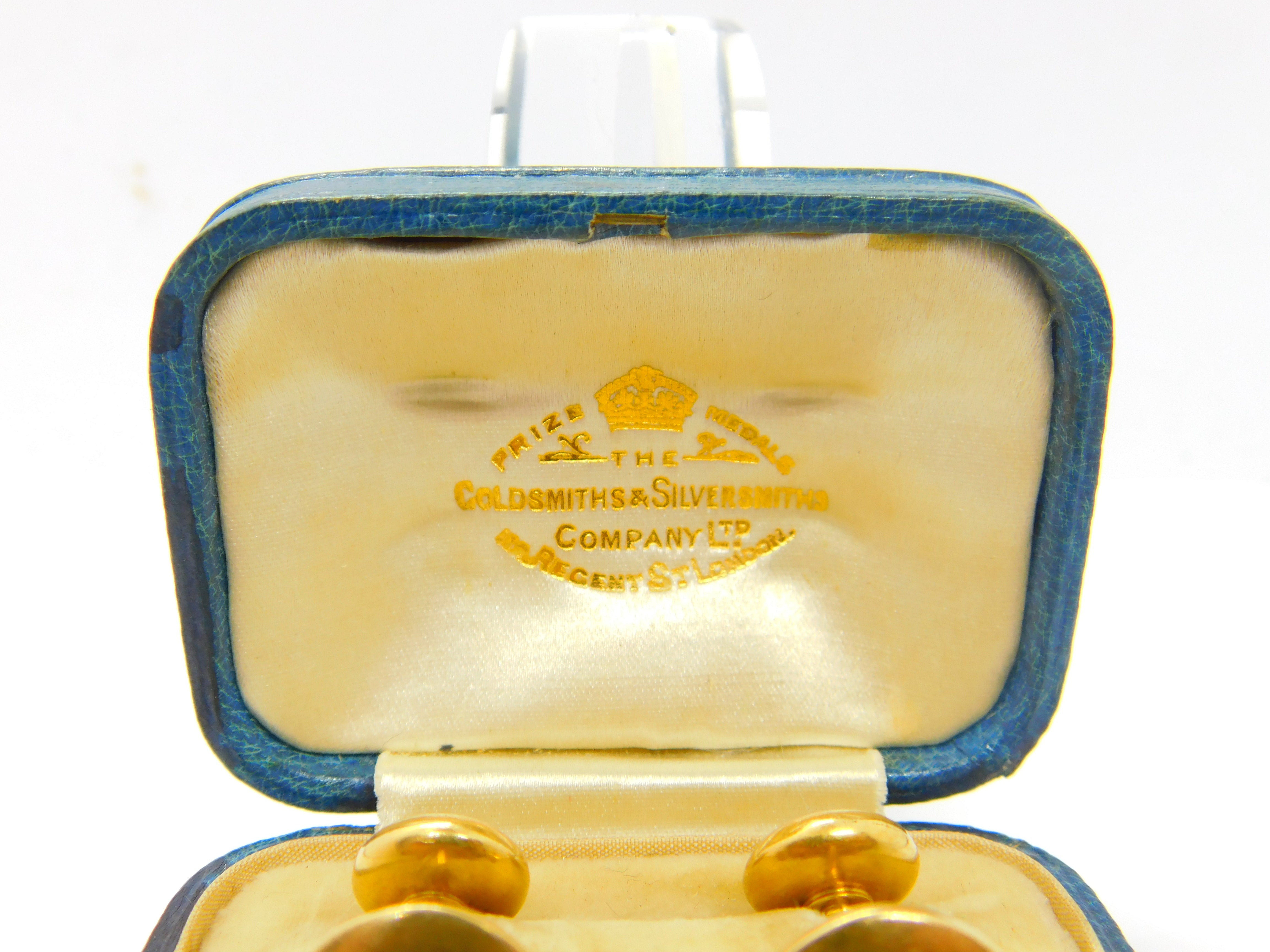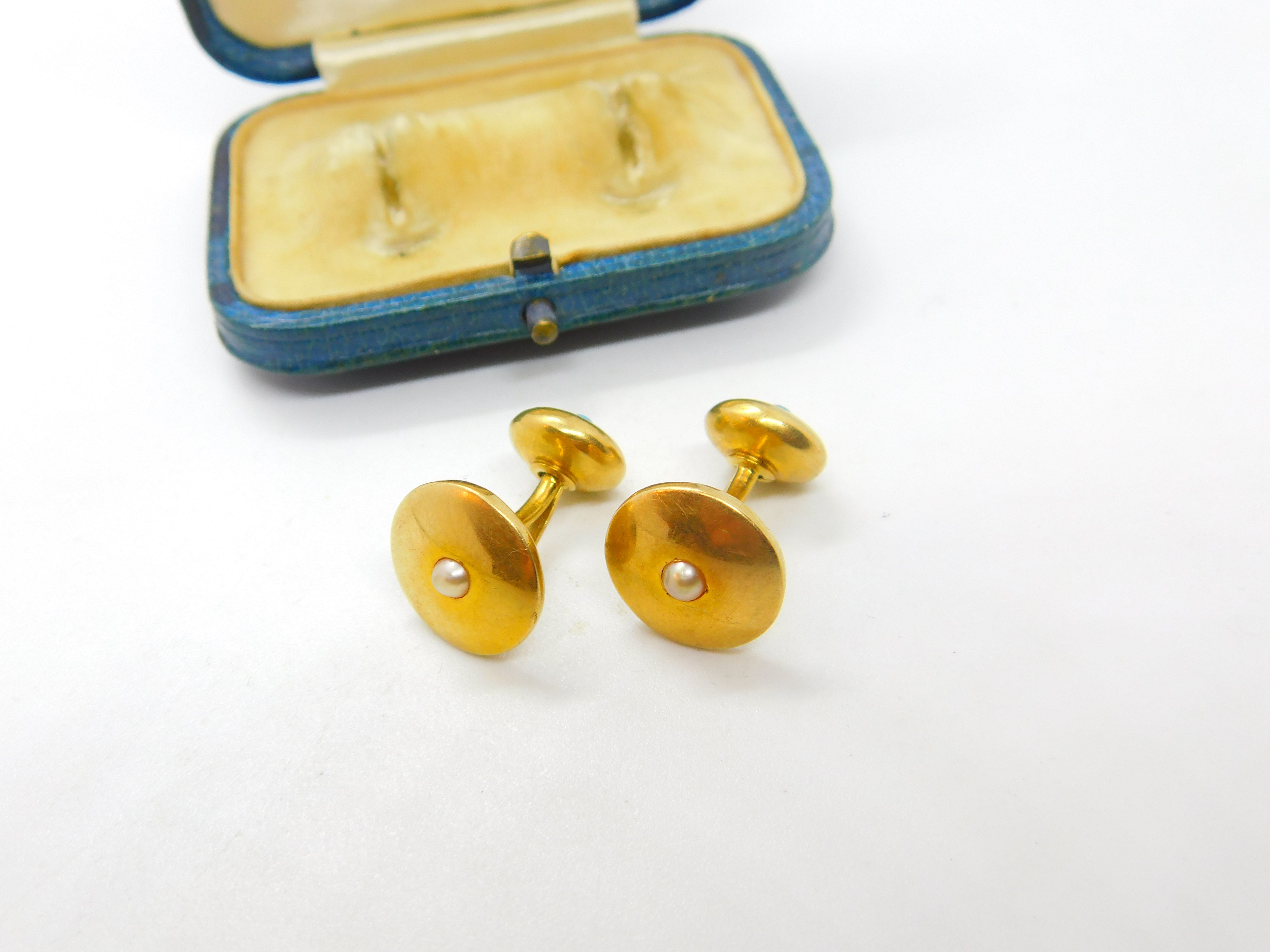 Details: A fantastic and wonderfully designed pair of antique Victorian 18ct yellow gold cufflinks with superb detail set with pearl to the front and turquoise to the reverse hallmarked 18ct to the reverse and engraved with the date 14.6.00 dated them to 1900 or earlier. The cufflinks are fitted in their original Goldsmiths & Silversmiths Company Ltd Moroccan leather Box and are simply quality. This is a wonderful item that would make a perfect gift or addition to any collection.