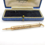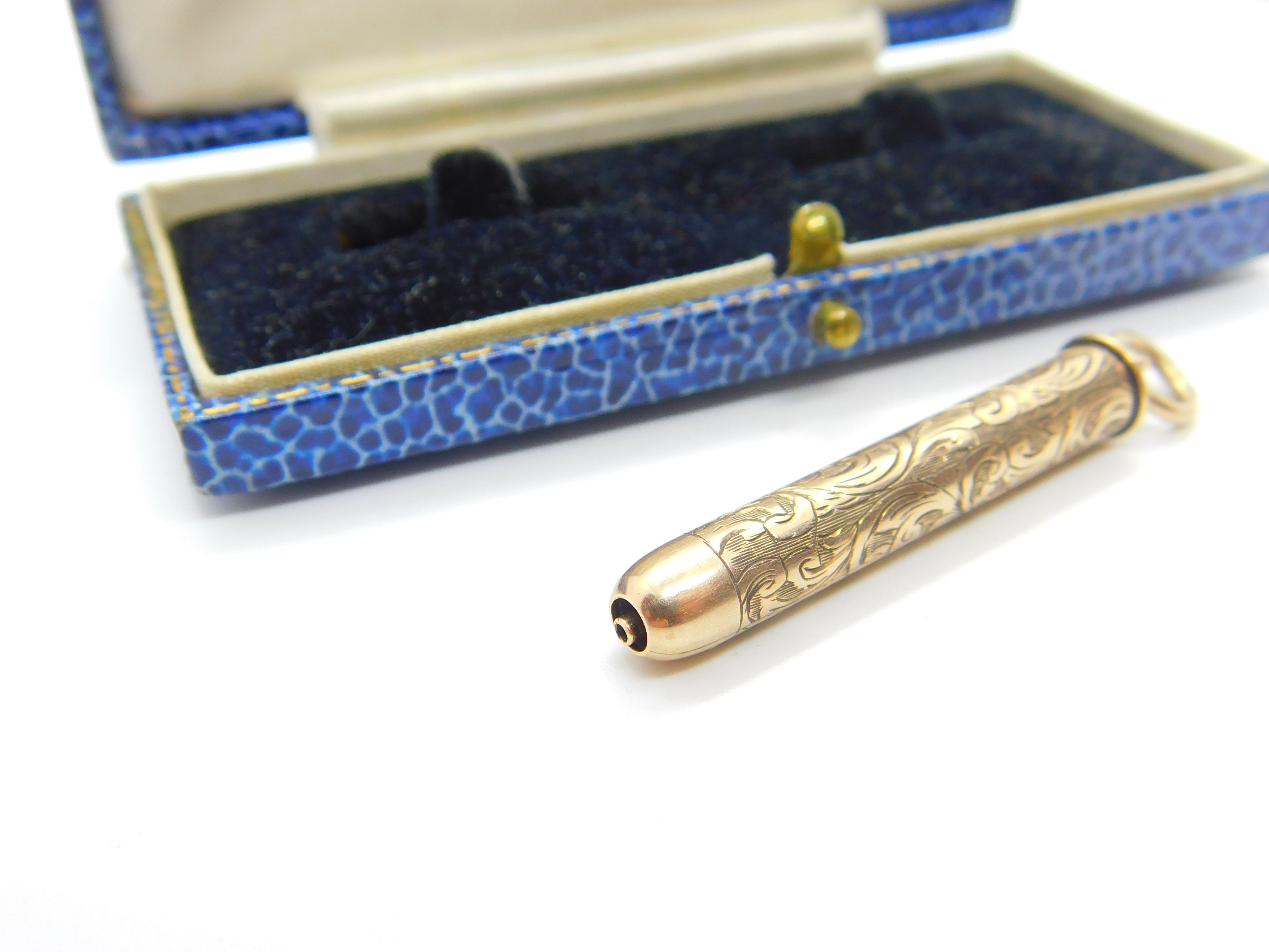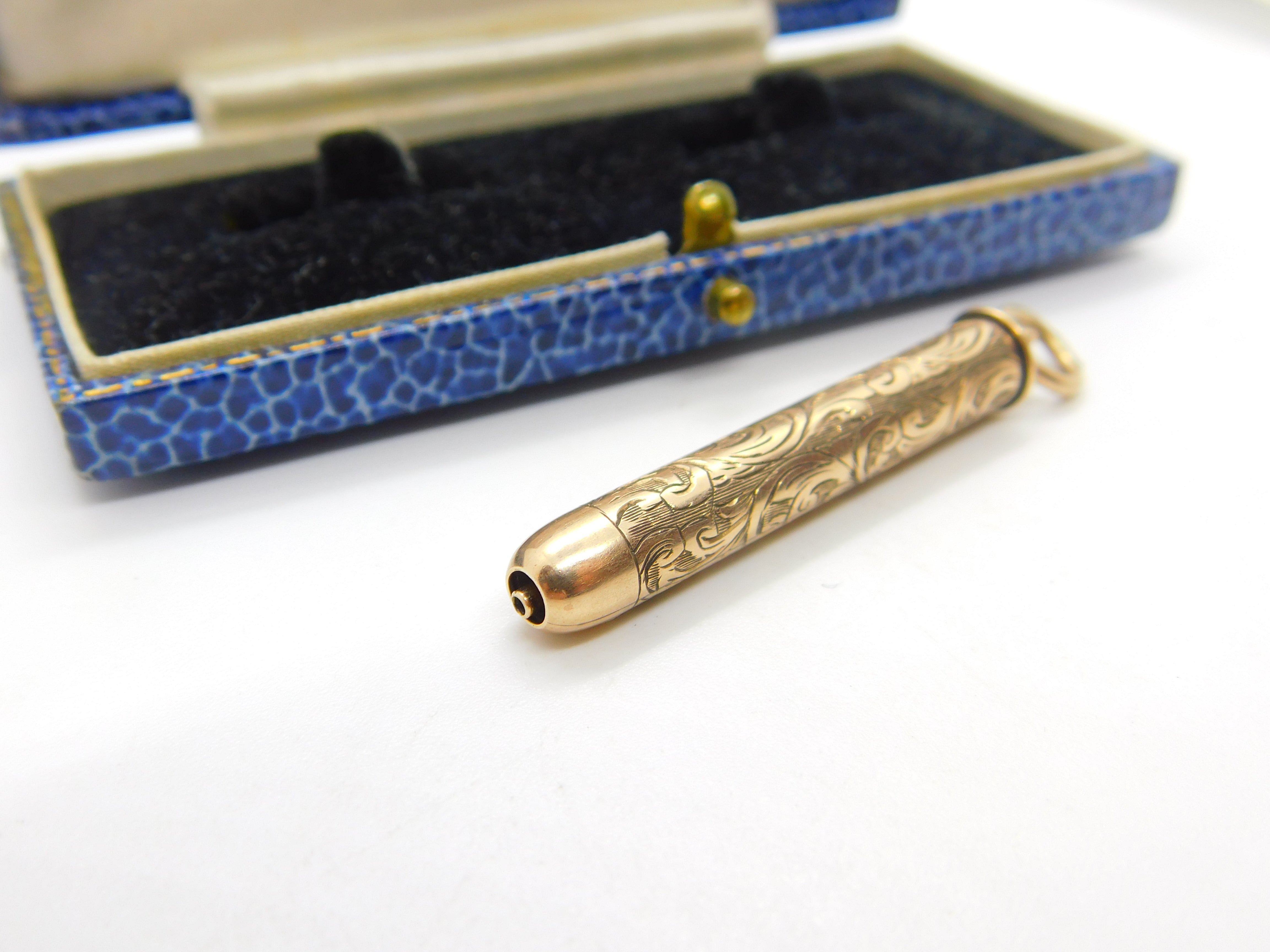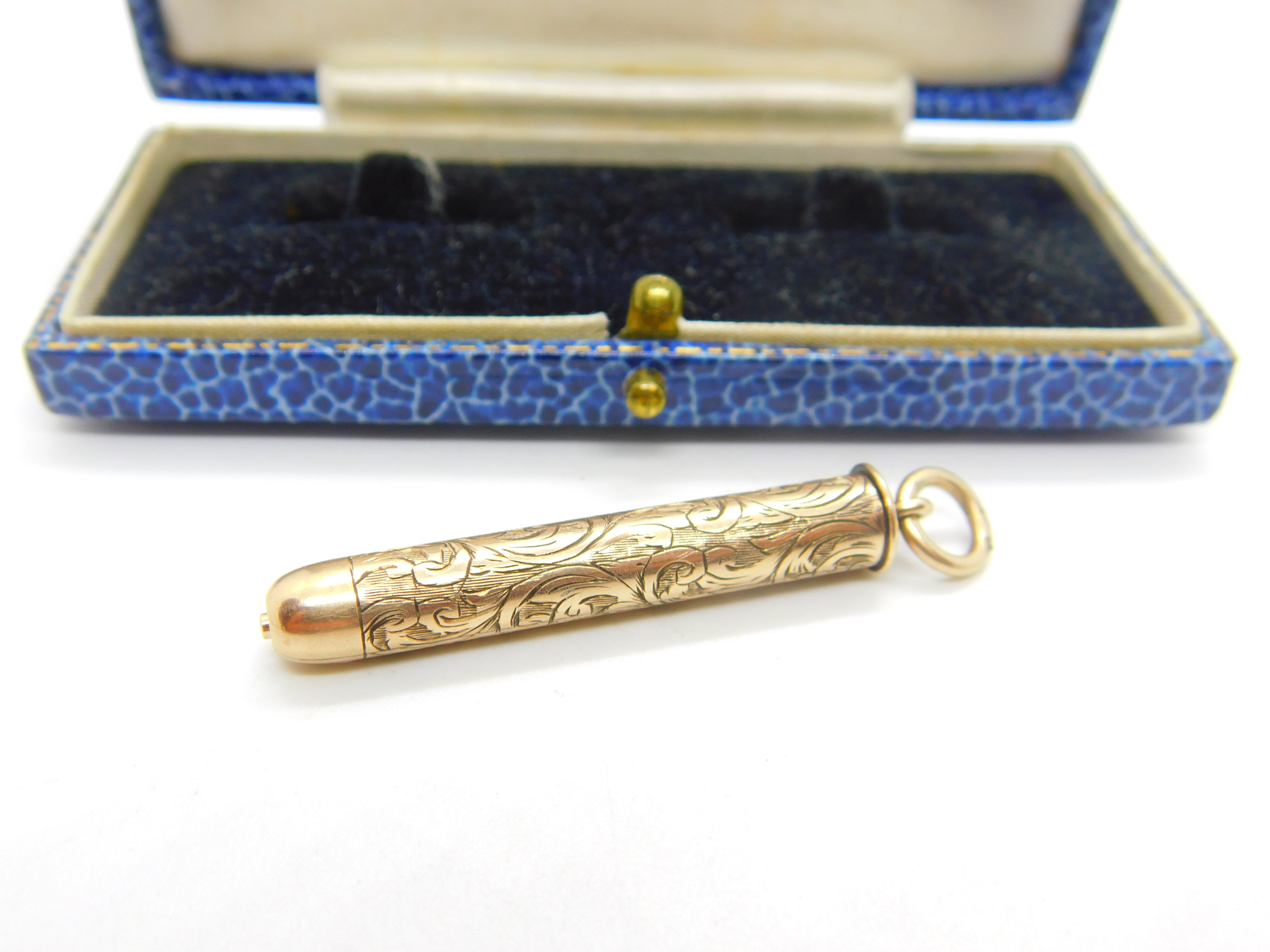 Details: A fantastic and wonderfully designed antique Victorian 9ct yellow gold floral pattern propelling pencil fob with lovely detail by prestigious makers Sampson Mordan c1900 with clear marks. Slightly stiff but works well - needs lead. This is a wonderful item that would make a perfect gift or addition to any collection. The BOX pictured is for PRESENTATION ONLY and is NOT included in the listings but used to frame the pictures unless specifically stated otherwise.
