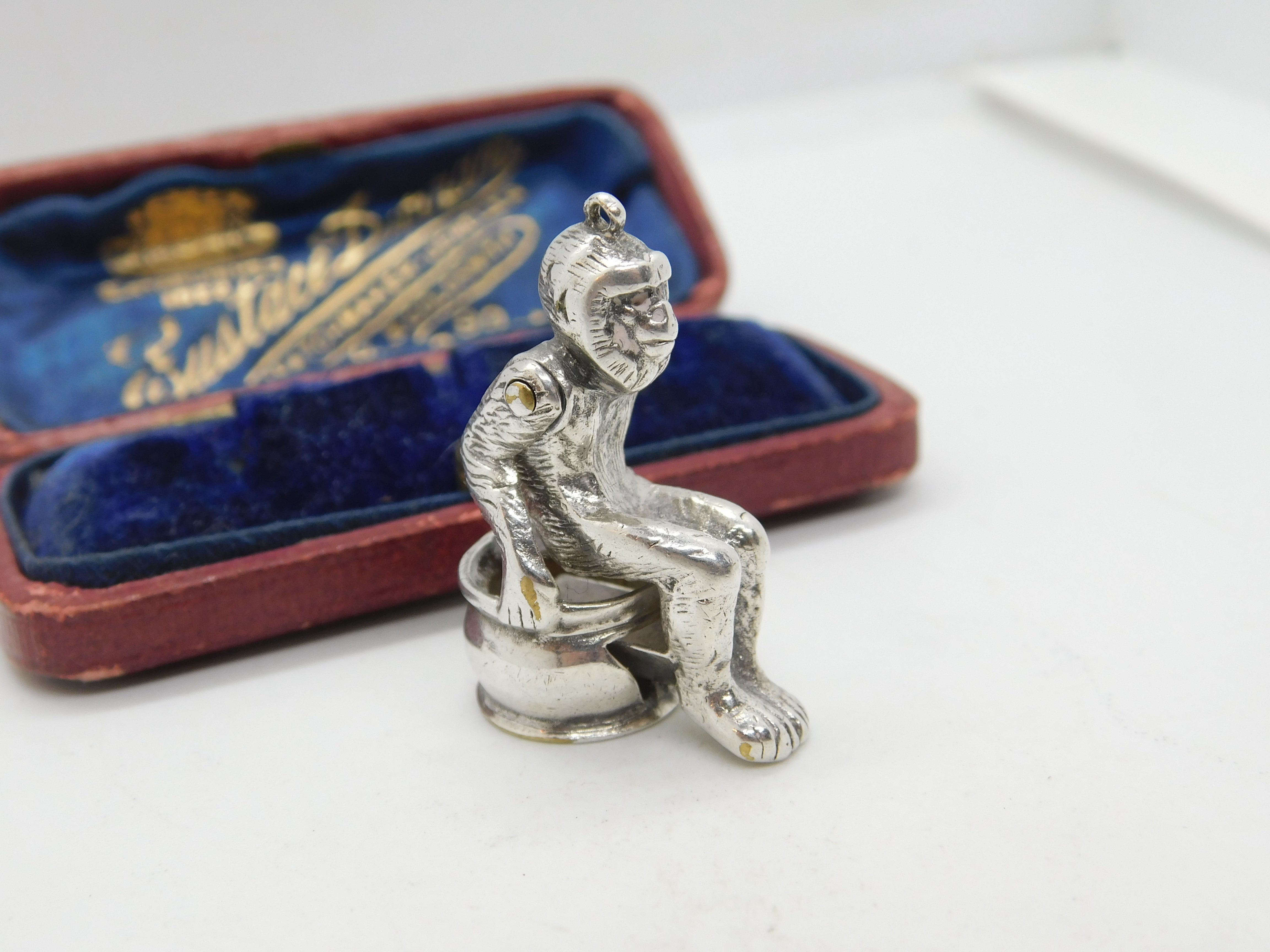 Details: A fantastic and wonderfully designed antique Victorian silver plated cigar cutter novelty fob in the form of a monkey sitting on the loo or pan c1860. This is a wonderful item that would make a perfect gift or addition to any collection. The BOX pictured is for PRESENTATION ONLY and is NOT included in the listings but used to frame the pictures unless specifically stated otherwise.