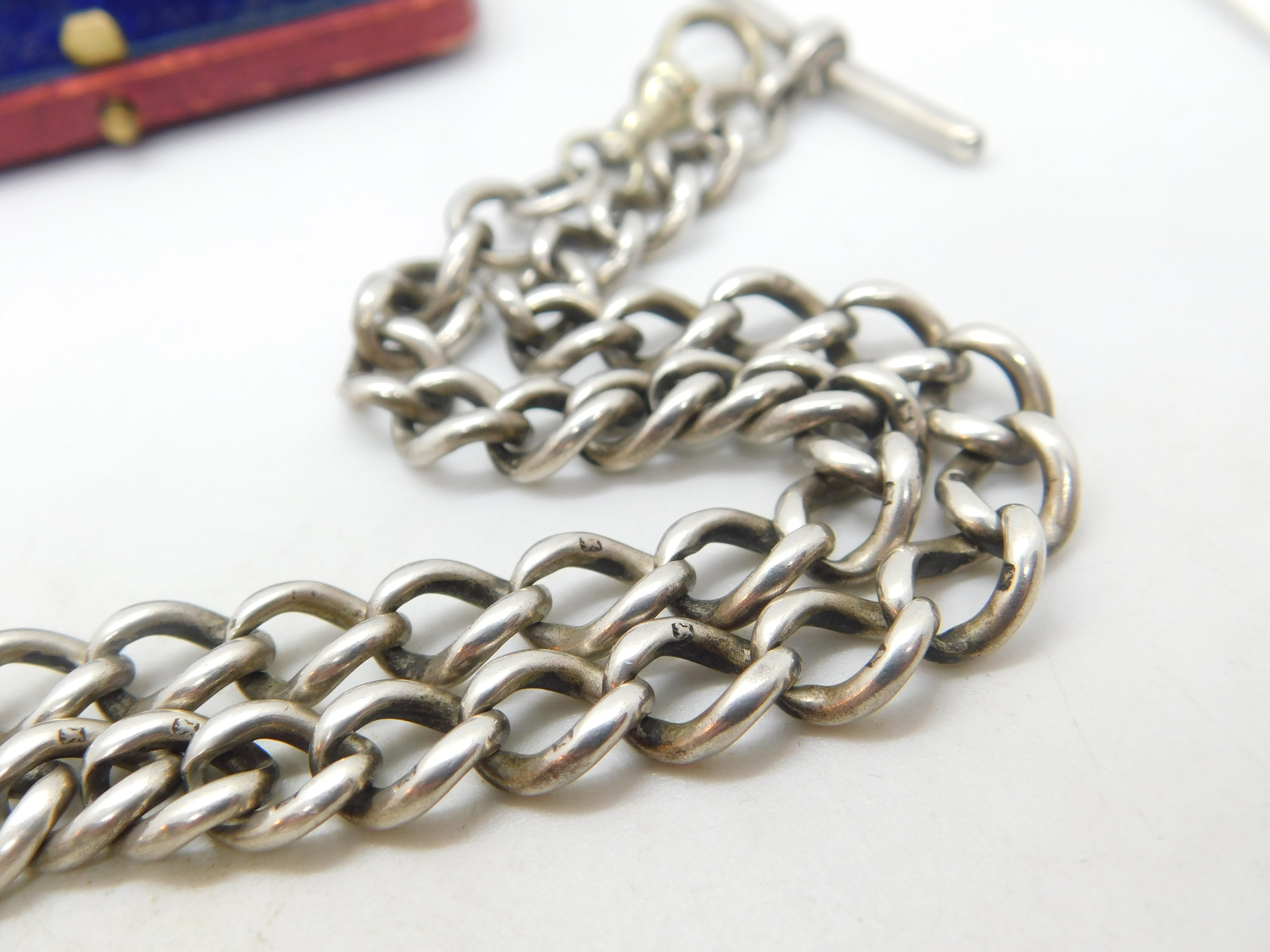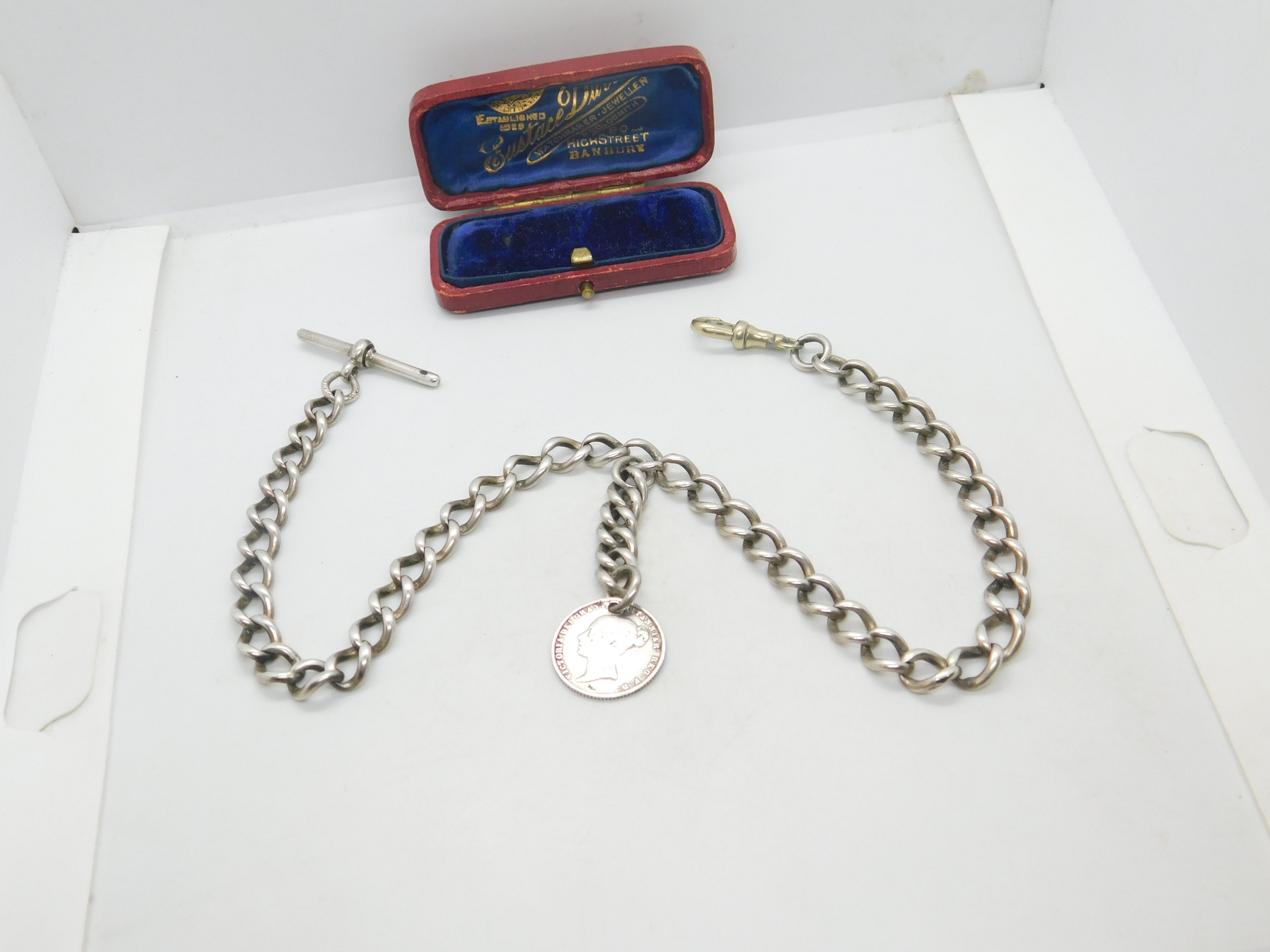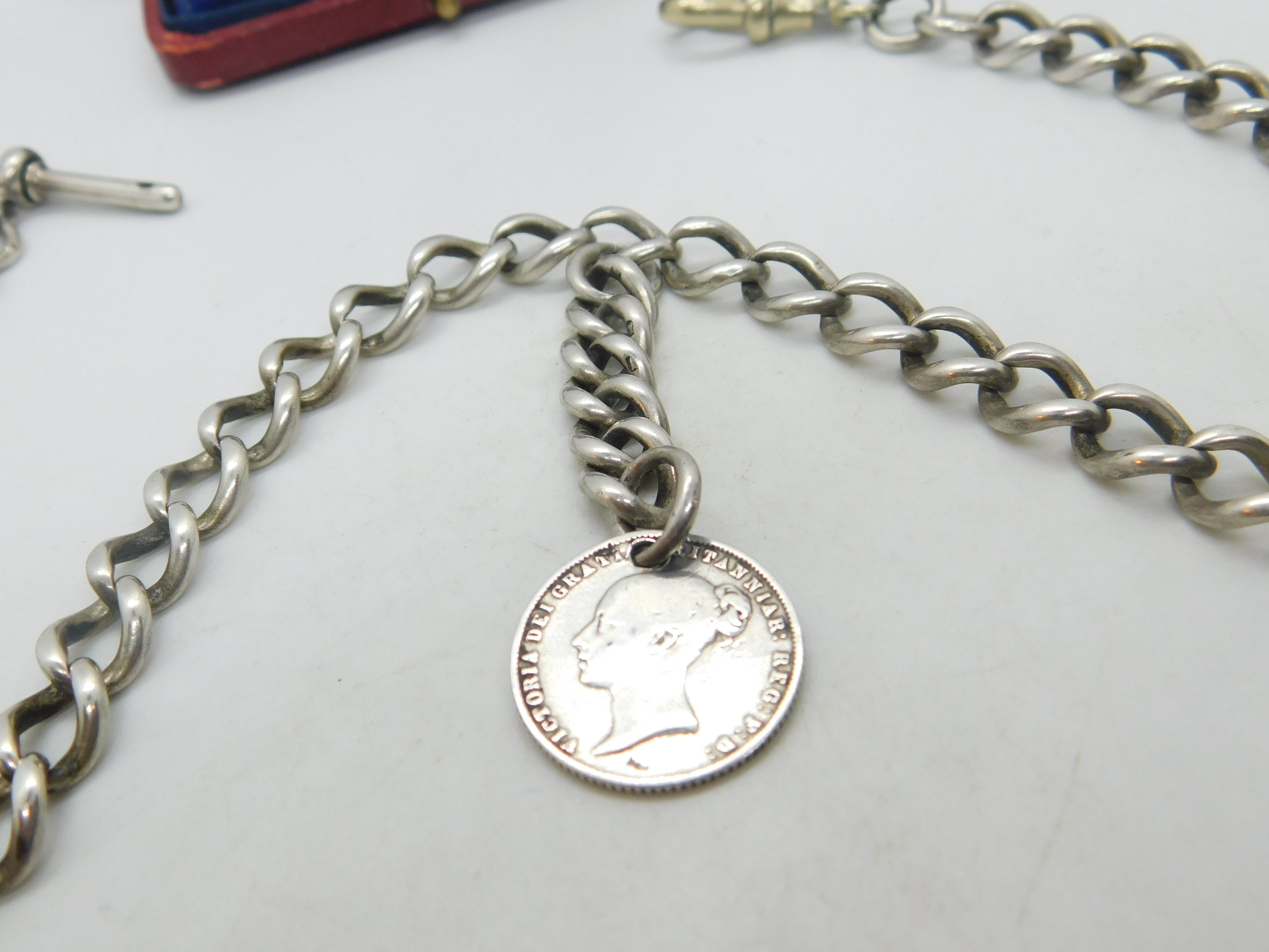 Details: A fantastic and wonderfully designed antique Victorian sterling silver double albert watch chain with Queen Victoria sixpence coin fob hallmarked Birmingham 1897 to the t-bar and equally hallmarked to every link of the watch chain. The dog clip is the only part that is not silver and is likely a later replacement. A great example. This is a wonderful item that would make a perfect gift or addition to any collection. The BOX pictured is for PRESENTATION ONLY and is NOT included in the listings but used to frame the pictures unless specifically stated otherwise.