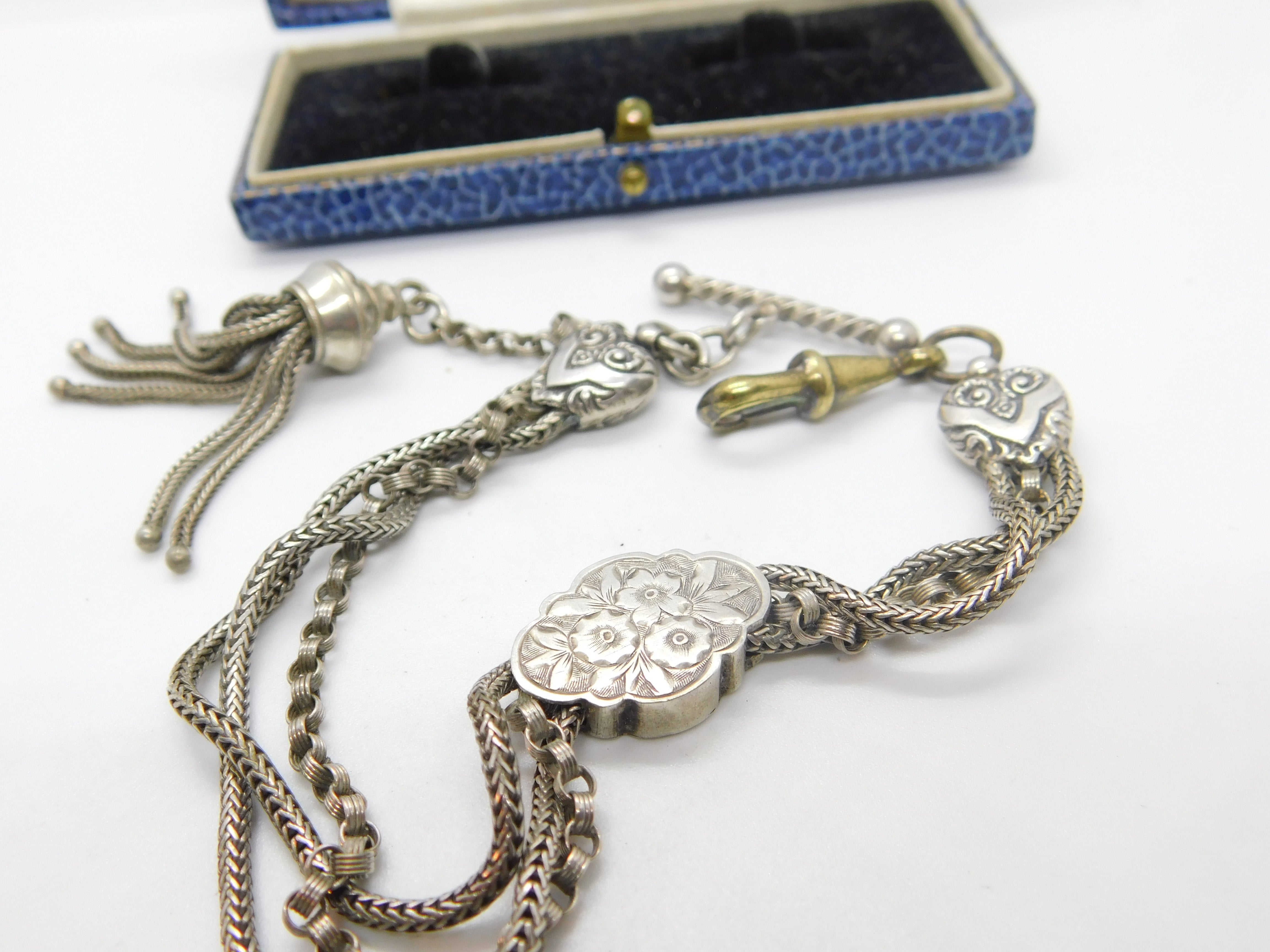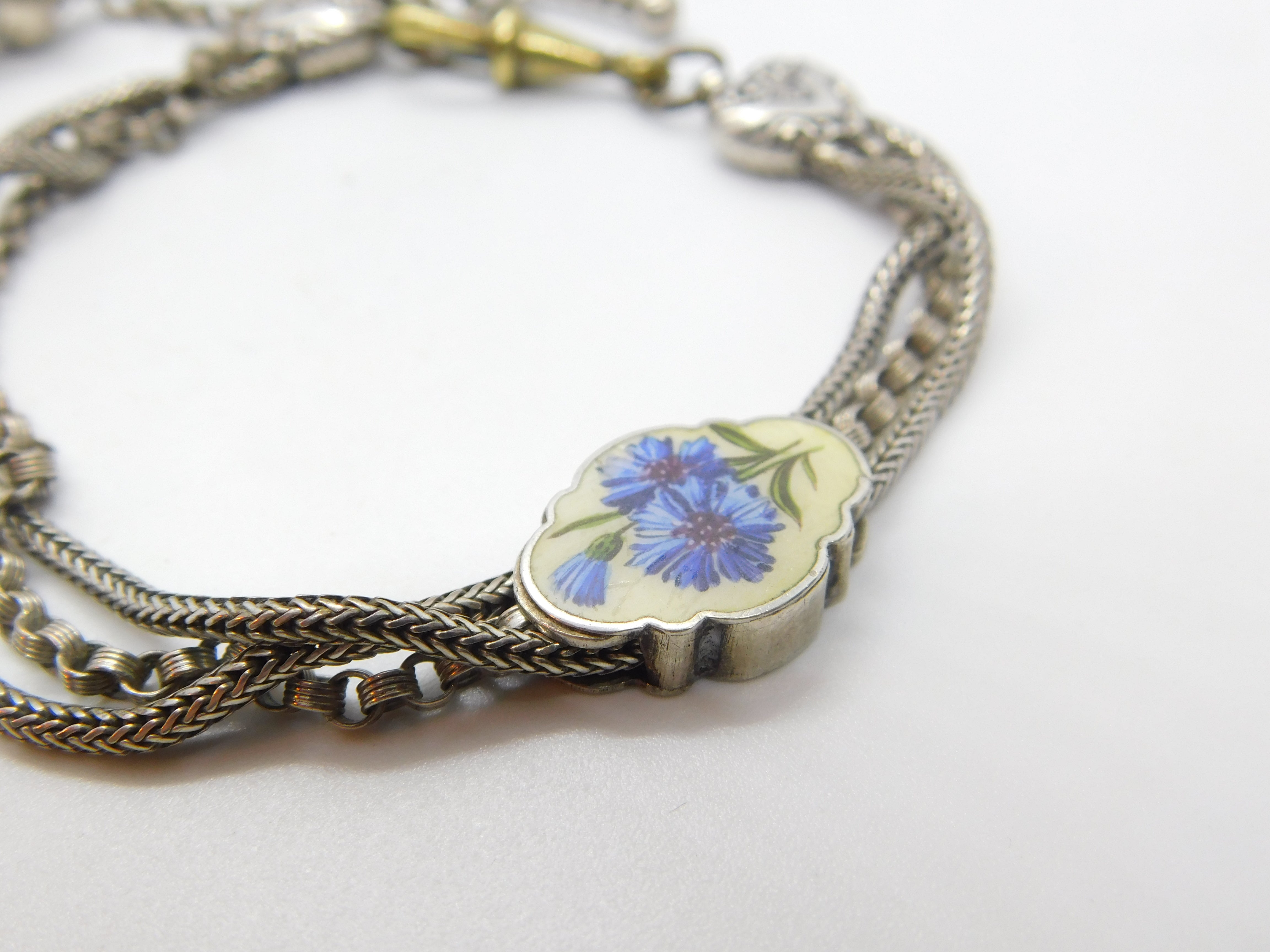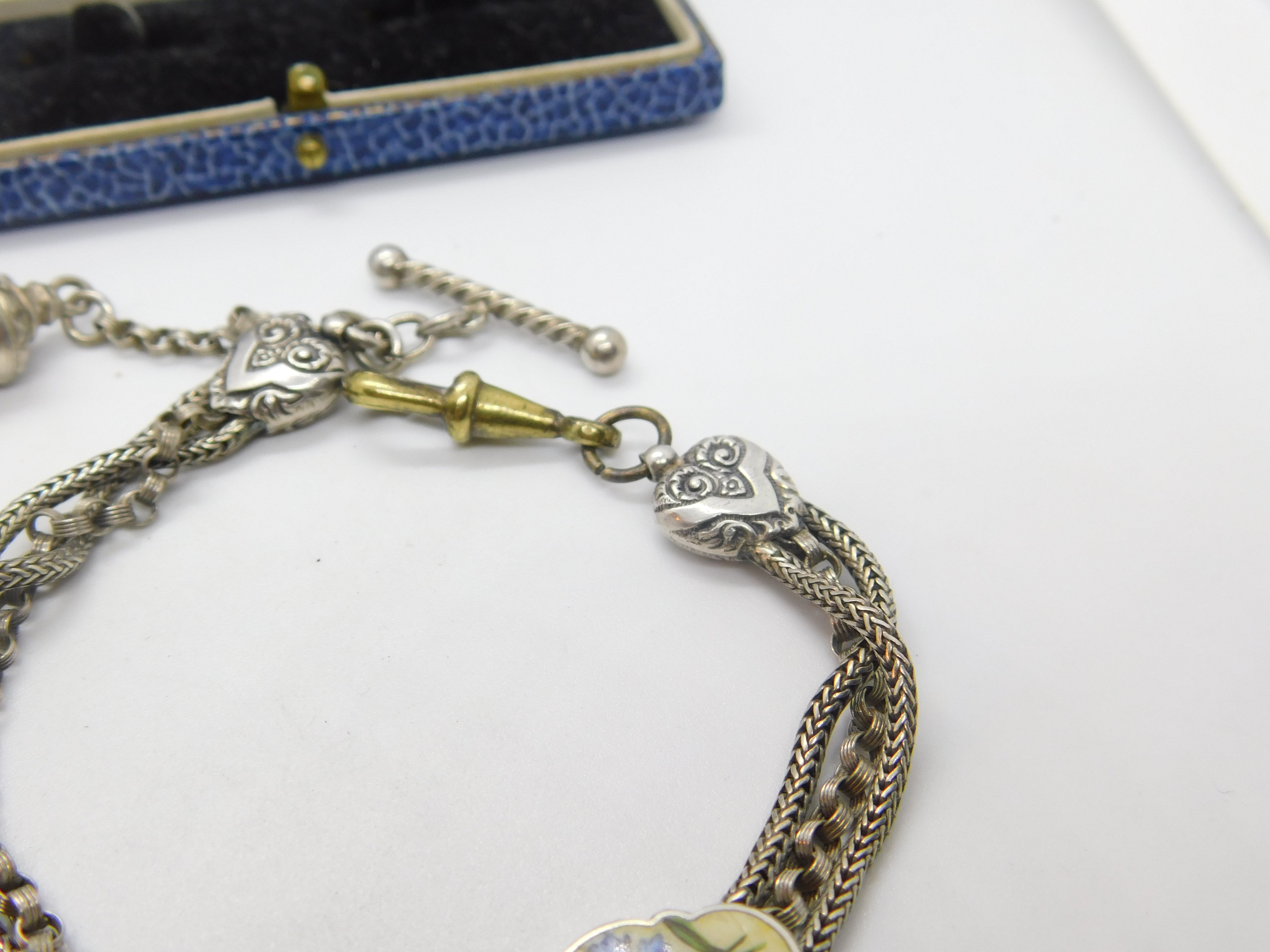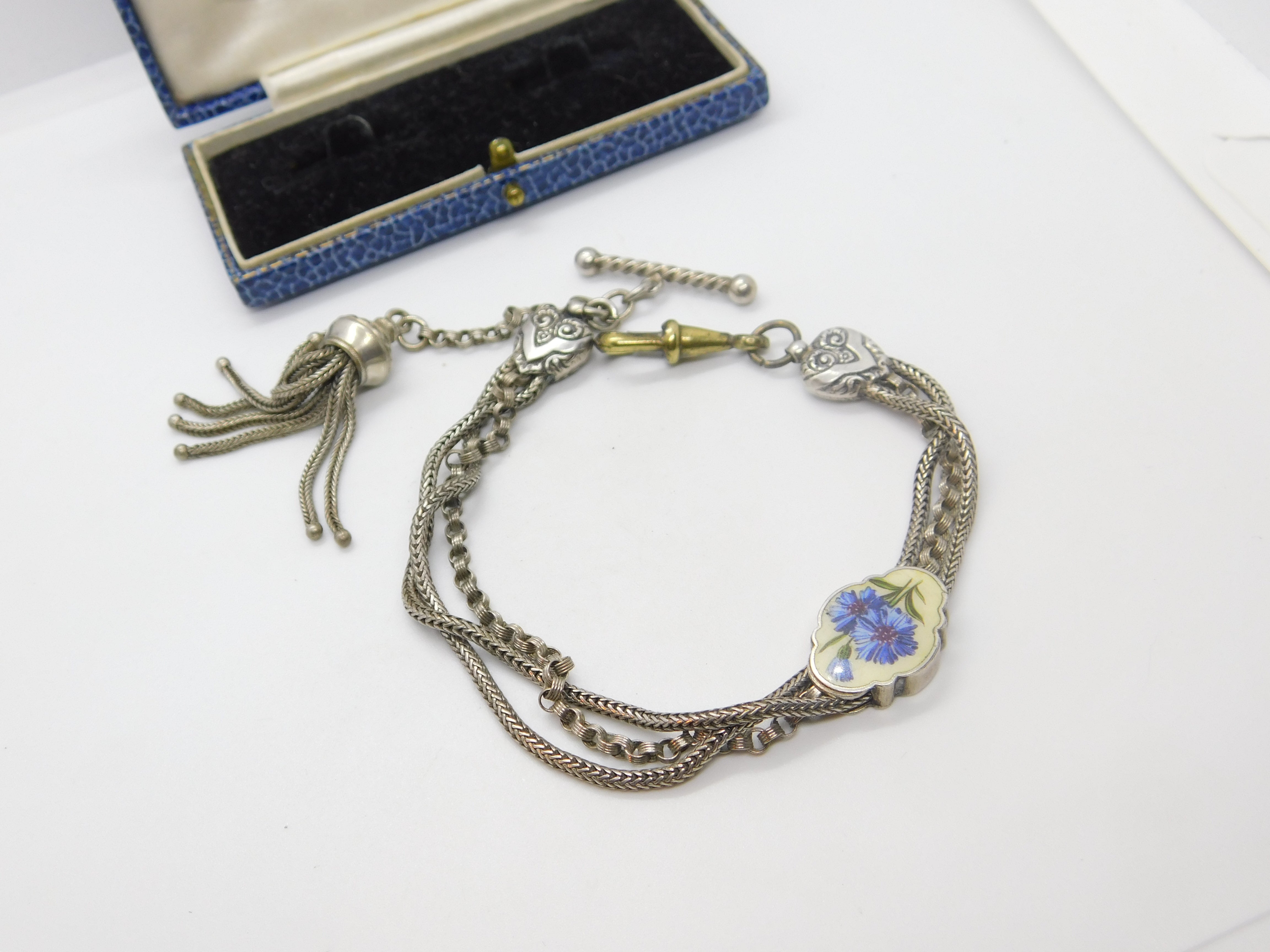 Details: A fantastic and wonderfully designed antique Victorian sterling silver albertina link bracelet with tassel and wonderful forget-me-not floral enamel detail c1860. The silver has been XRF tested and is beautifully ornate. The bracelet is slightly twisted please note - may need untwisting. The dog clip is brass. This is a wonderful item that would make a perfect gift or addition to any collection. The BOX pictured is for PRESENTATION ONLY and is NOT included in the listings but used to frame the pictures unless specifically stated otherwise.