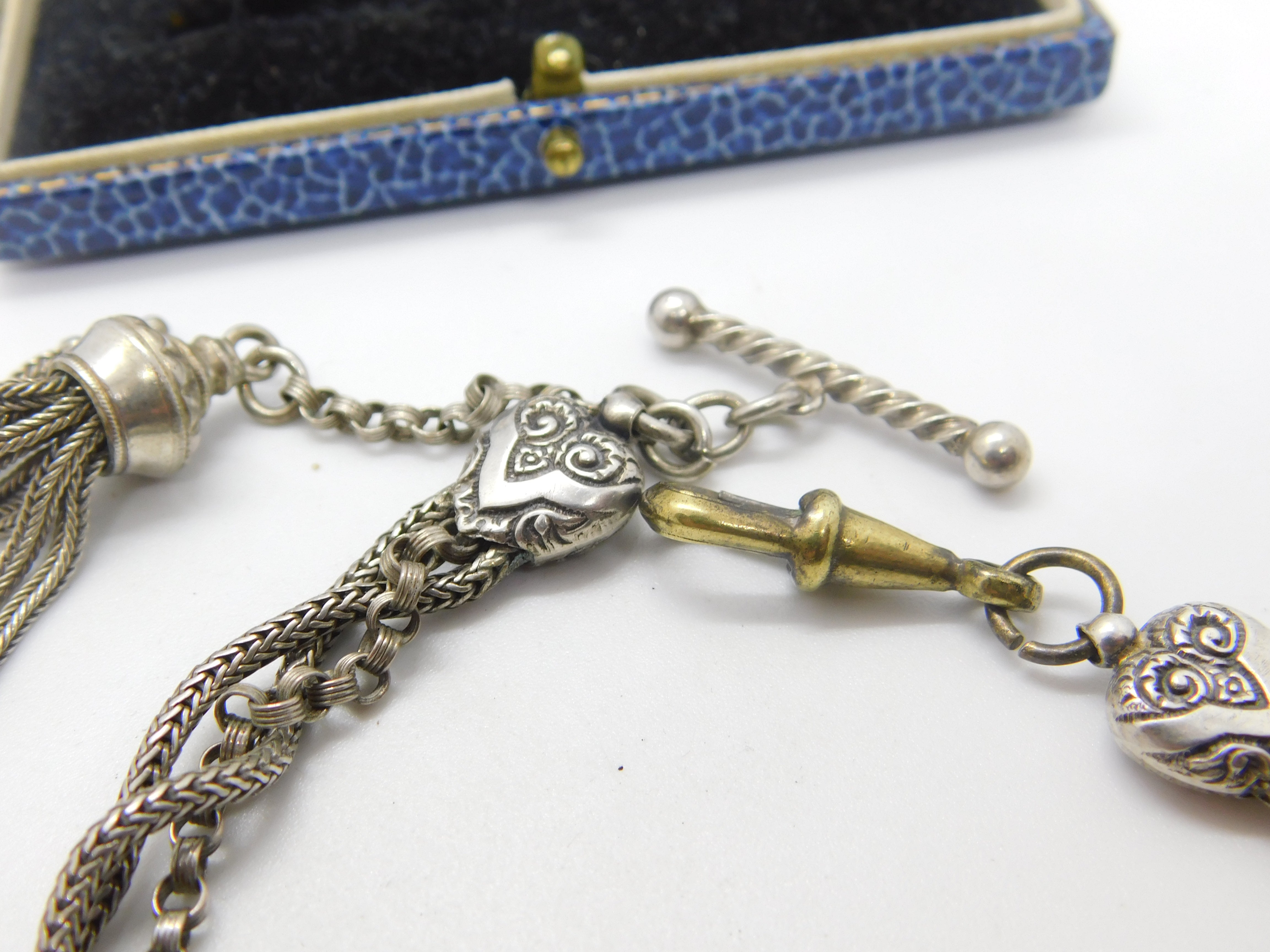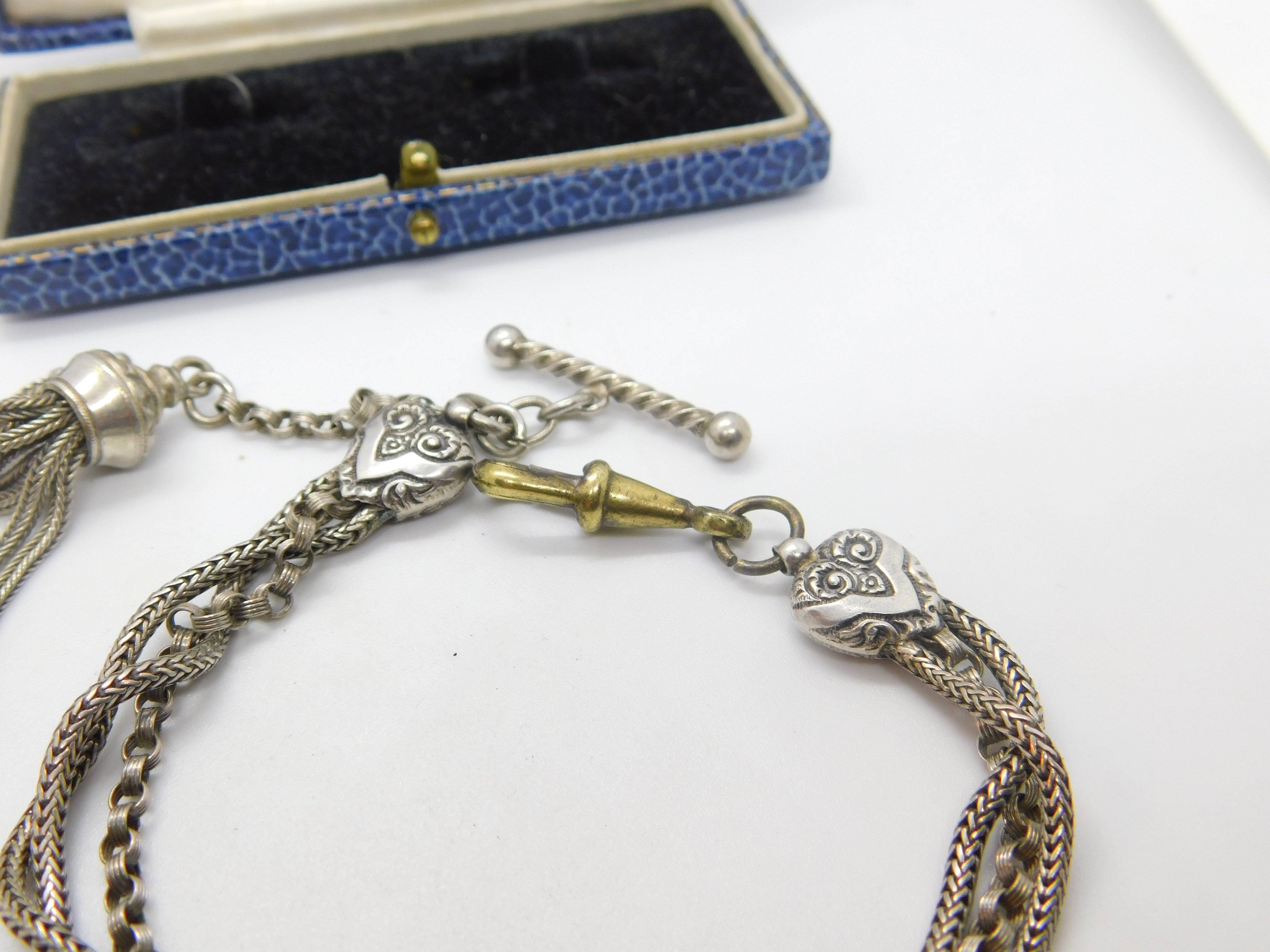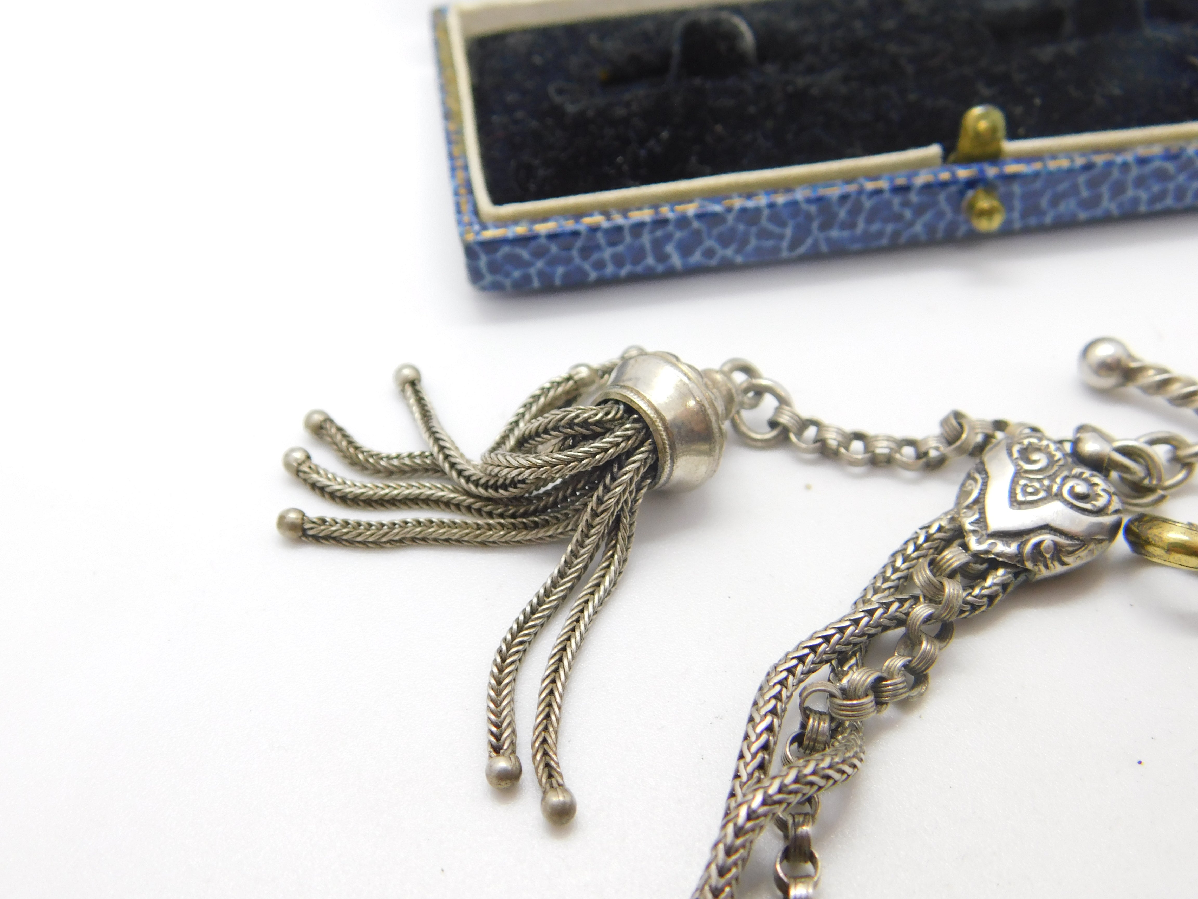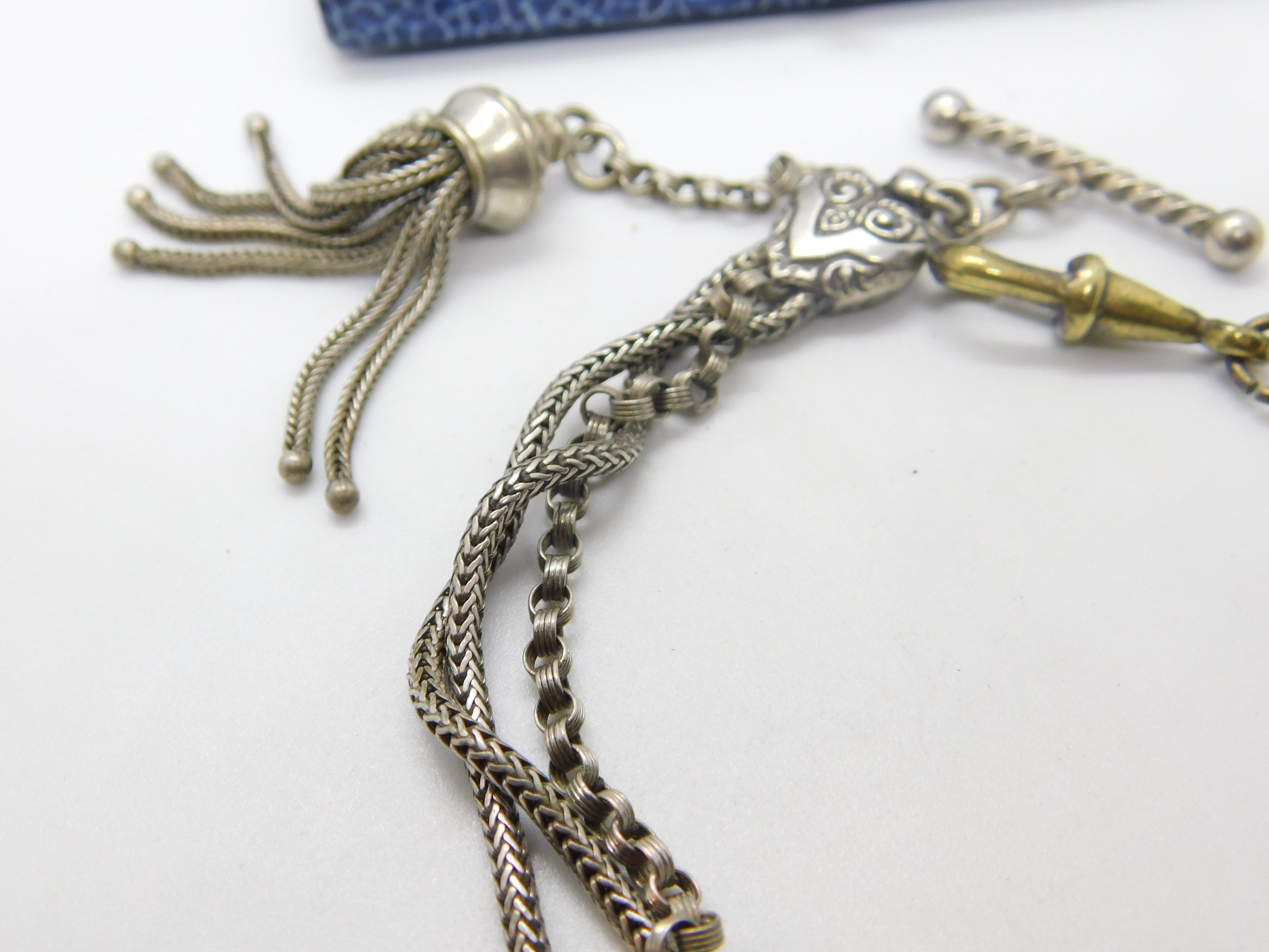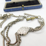 Details: A fantastic and wonderfully designed antique Victorian sterling silver albertina link bracelet with tassel and wonderful forget-me-not floral enamel detail c1860. The silver has been XRF tested and is beautifully ornate. The bracelet is slightly twisted please note - may need untwisting. The dog clip is brass. This is a wonderful item that would make a perfect gift or addition to any collection. The BOX pictured is for PRESENTATION ONLY and is NOT included in the listings but used to frame the pictures unless specifically stated otherwise.