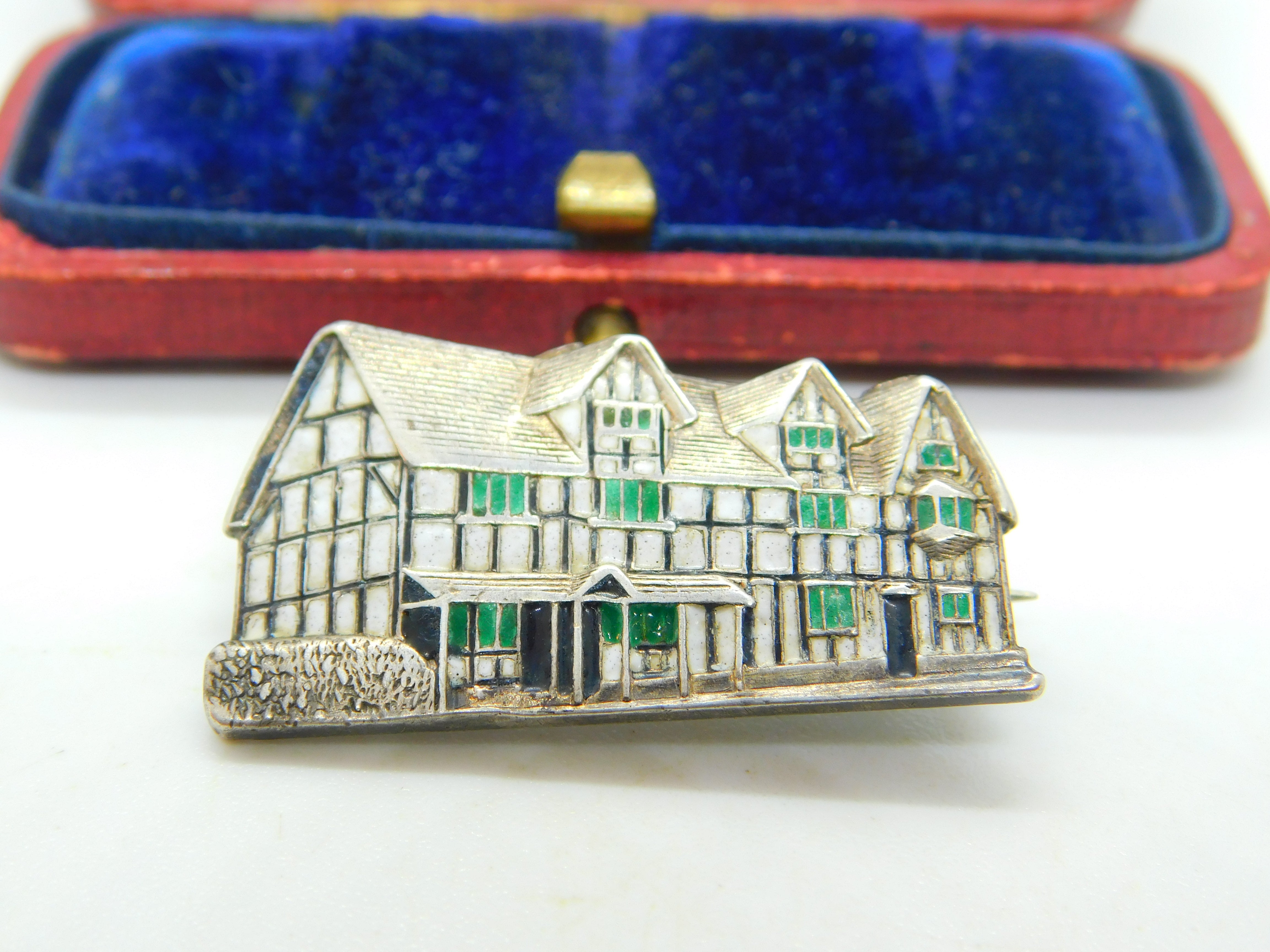 Details: A fantastic and wonderfully designed antique Victorian sterling silver & enamel brooch in the form of William Shakespeare's birthplace hallmarked to the reverse Birmingham 1876. Excellent condition to the enamel and great detail to the house. This is a wonderful item that would make a perfect gift or addition to any collection. The BOX pictured is for PRESENTATION ONLY and is NOT included in the listings but used to frame the pictures unless specifically stated otherwise.