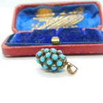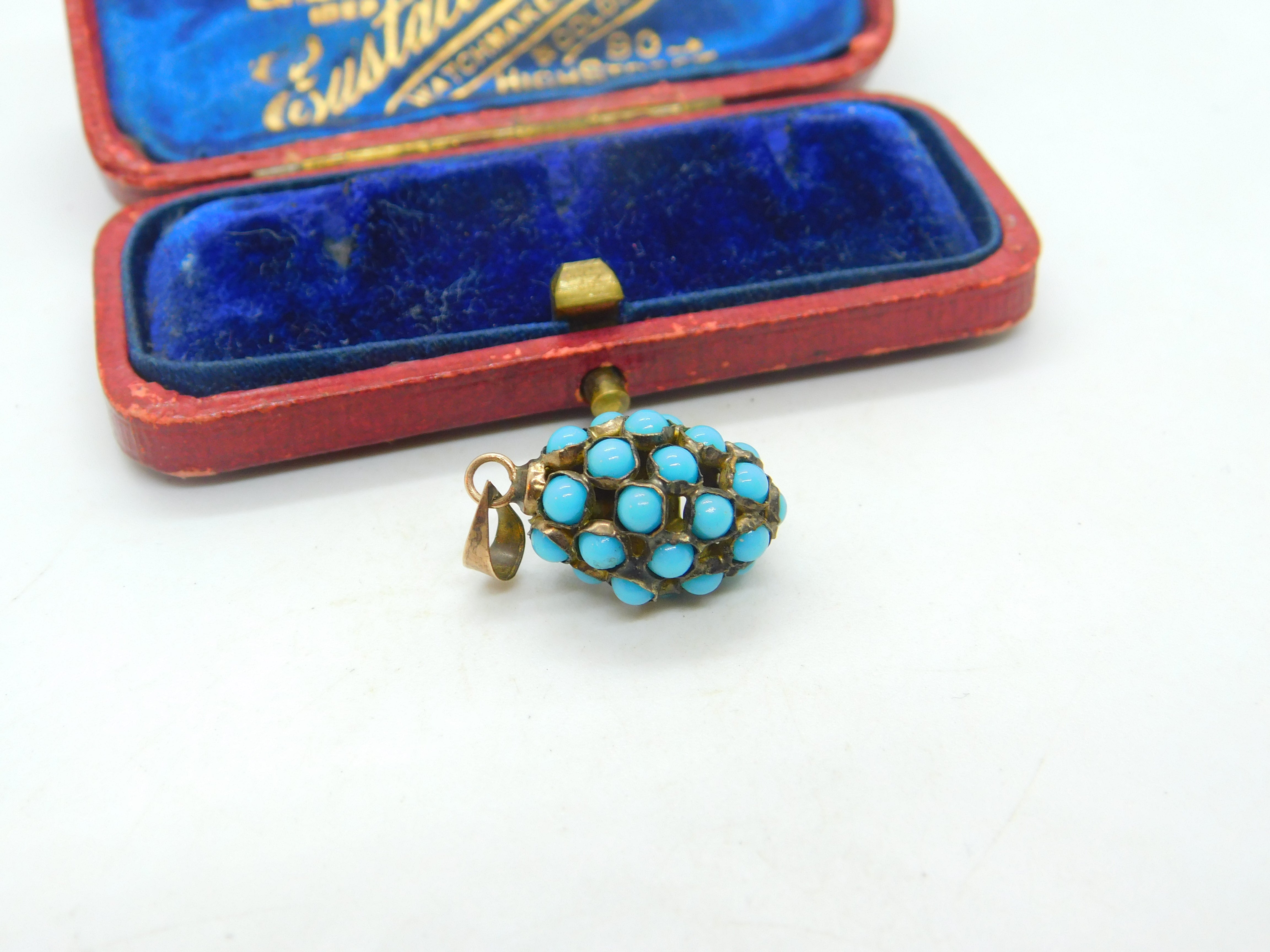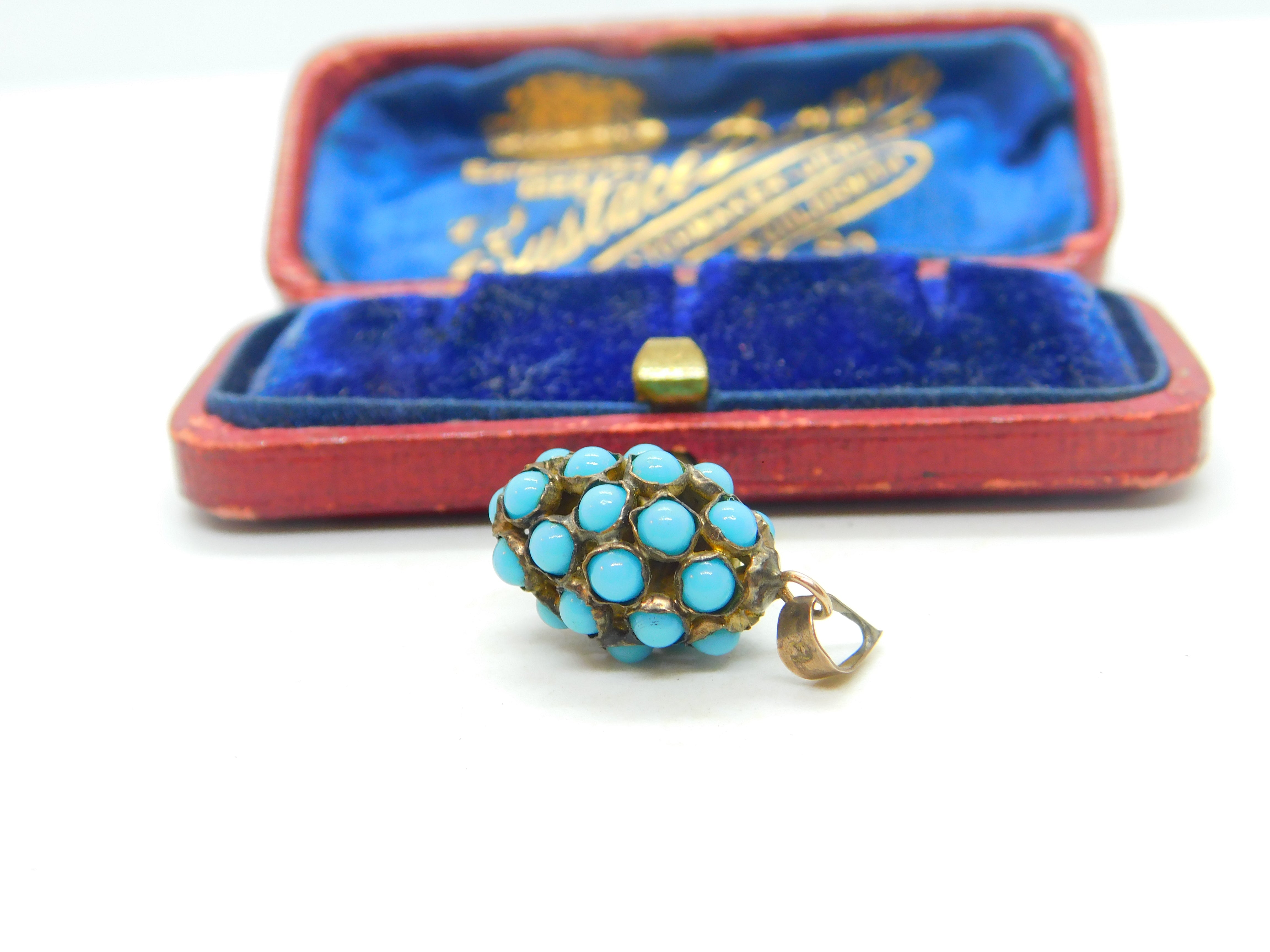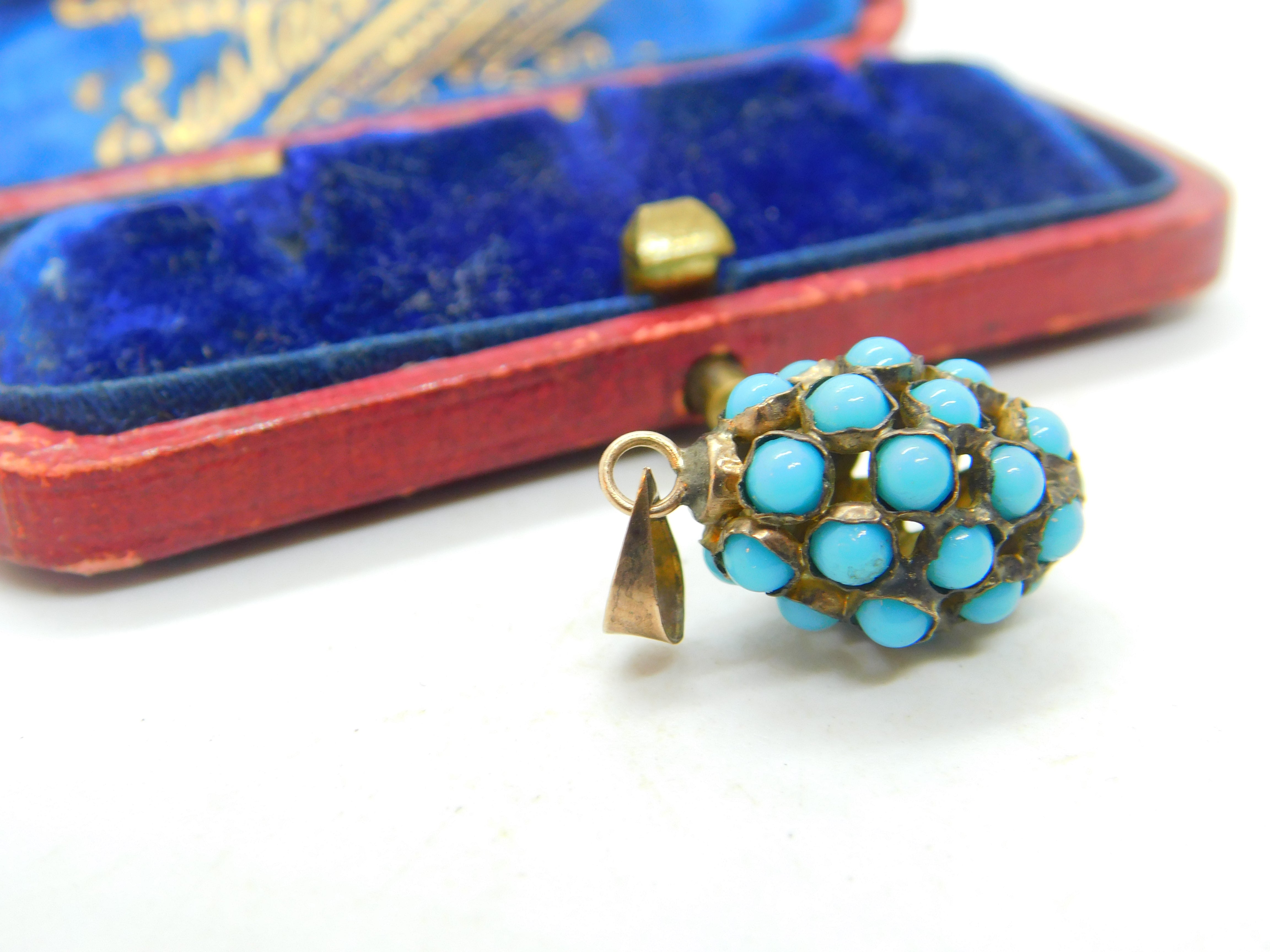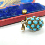 Details: A fantastic and wonderfully designed antique Victorian sterling silver gilt pineapple fruit pendant adorned with Pave set turquoise throughout c1880. The silver has been XRF tested. This is a wonderful item that would make a perfect gift or addition to any collection. The BOX pictured is for PRESENTATION ONLY and is NOT included in the listings but used to frame the pictures unless specifically stated otherwise.