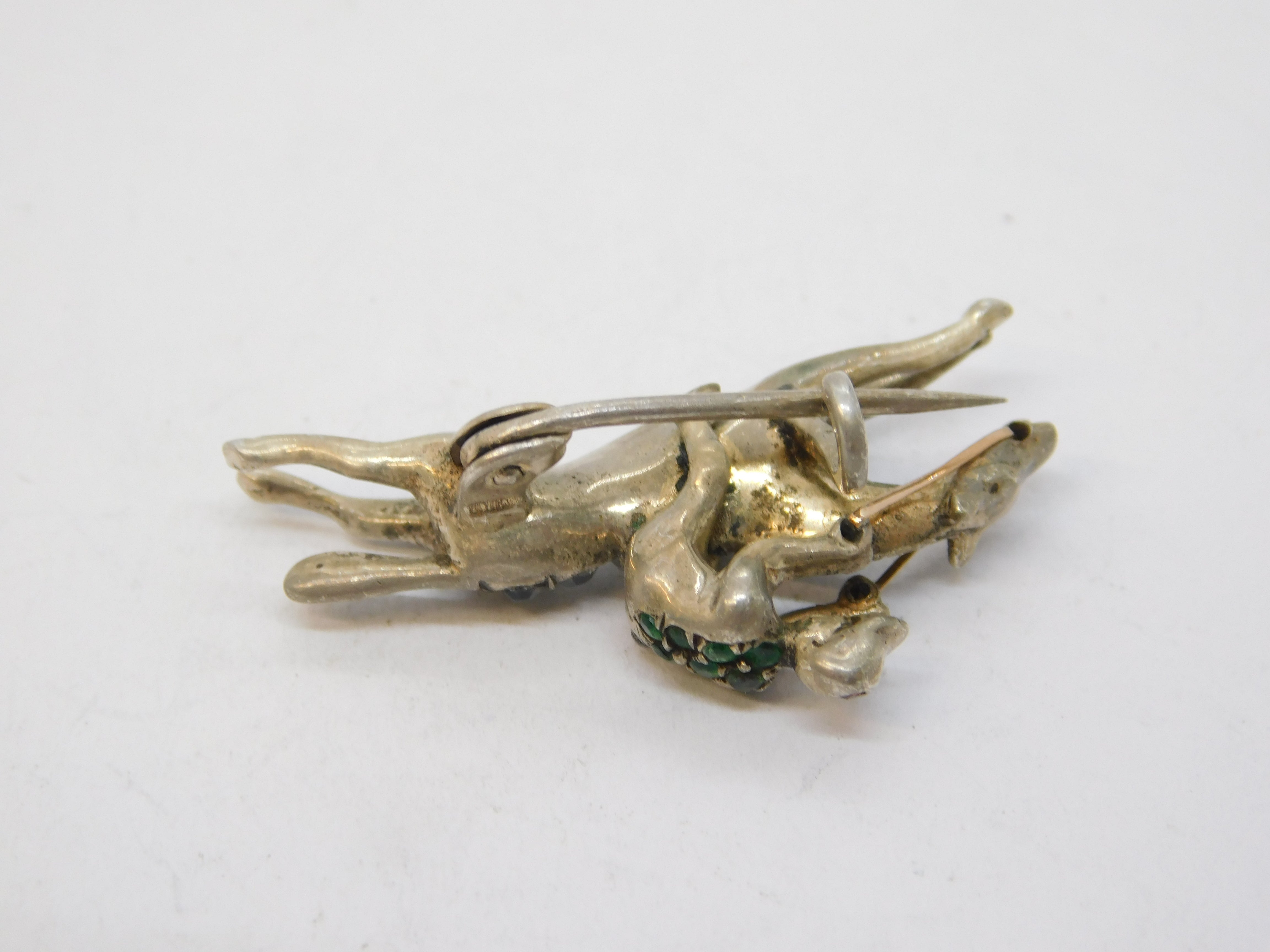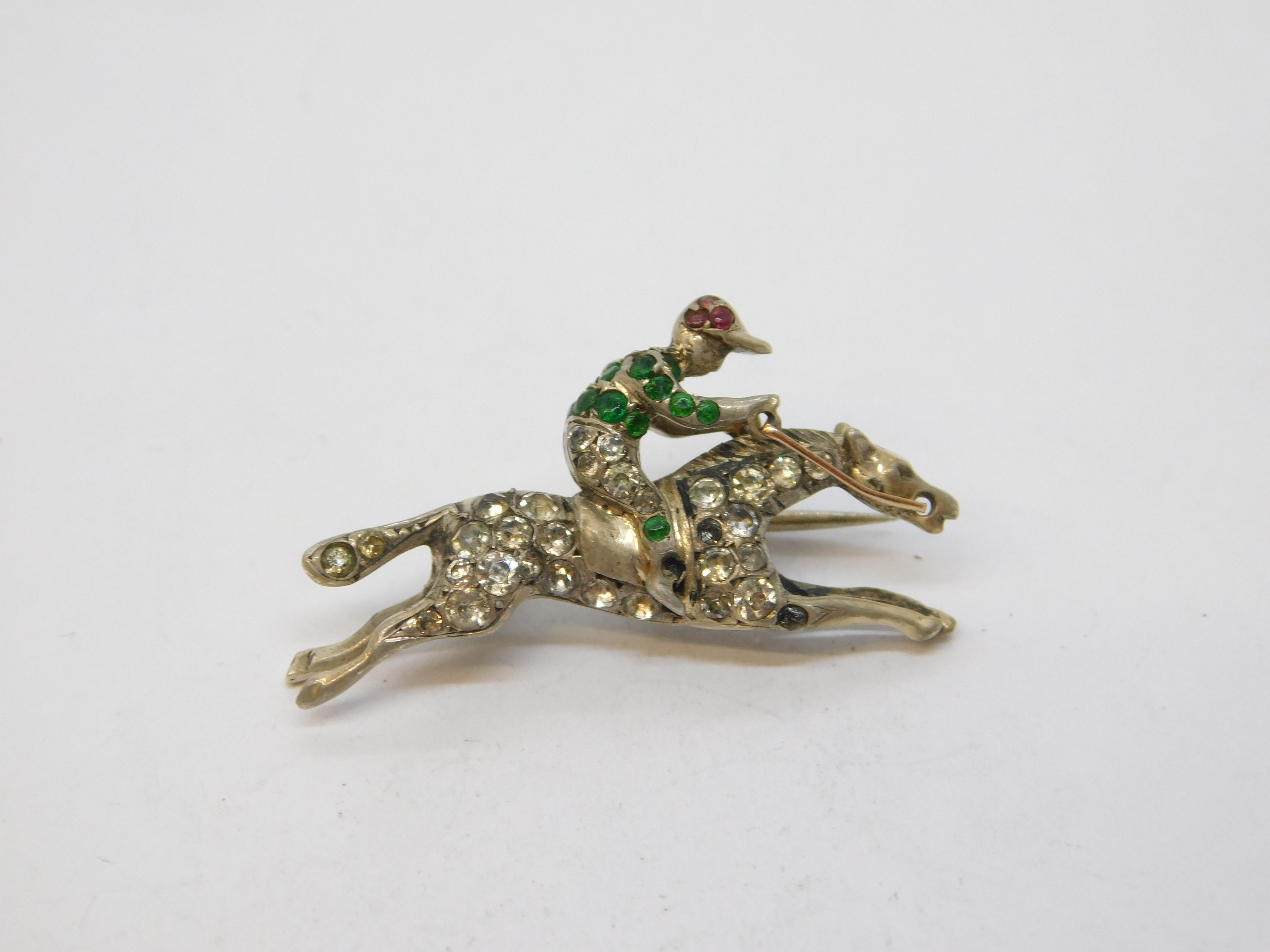 Details: A fantastic and wonderfully designed antique Victorian sterling silver horse racing jockey brooch pin set throughout with green, white & red paste stones alongside gold reigns c1890, the silver and gold have been XRF tested. This is a wonderful item that would make a perfect gift or addition to any collection. We are more than happy to provide XRF reports for items upon request.