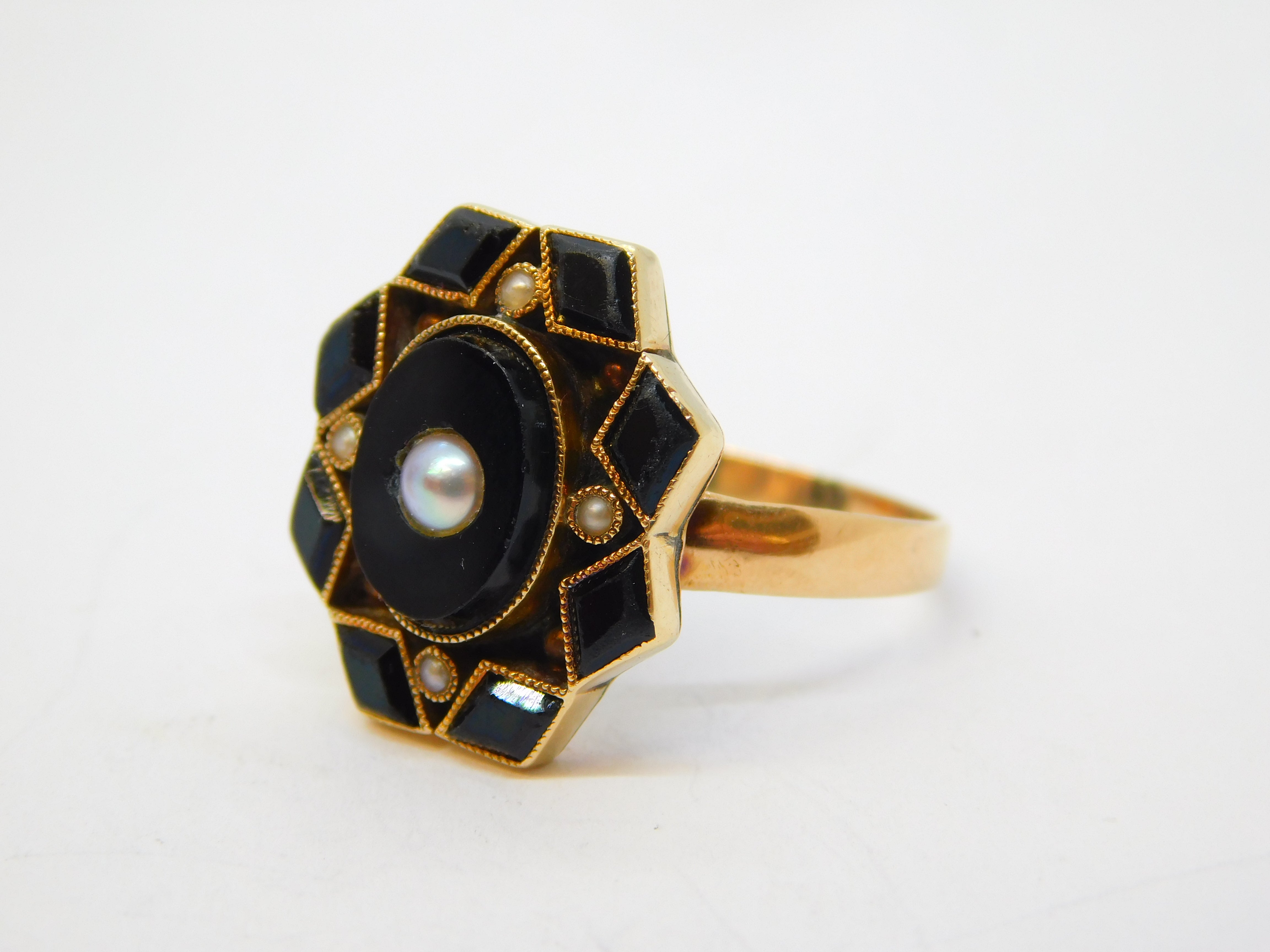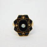 Victorian Yellow Gold, Whitby Jet & Pearl Set Mourning Ring Antique c1860