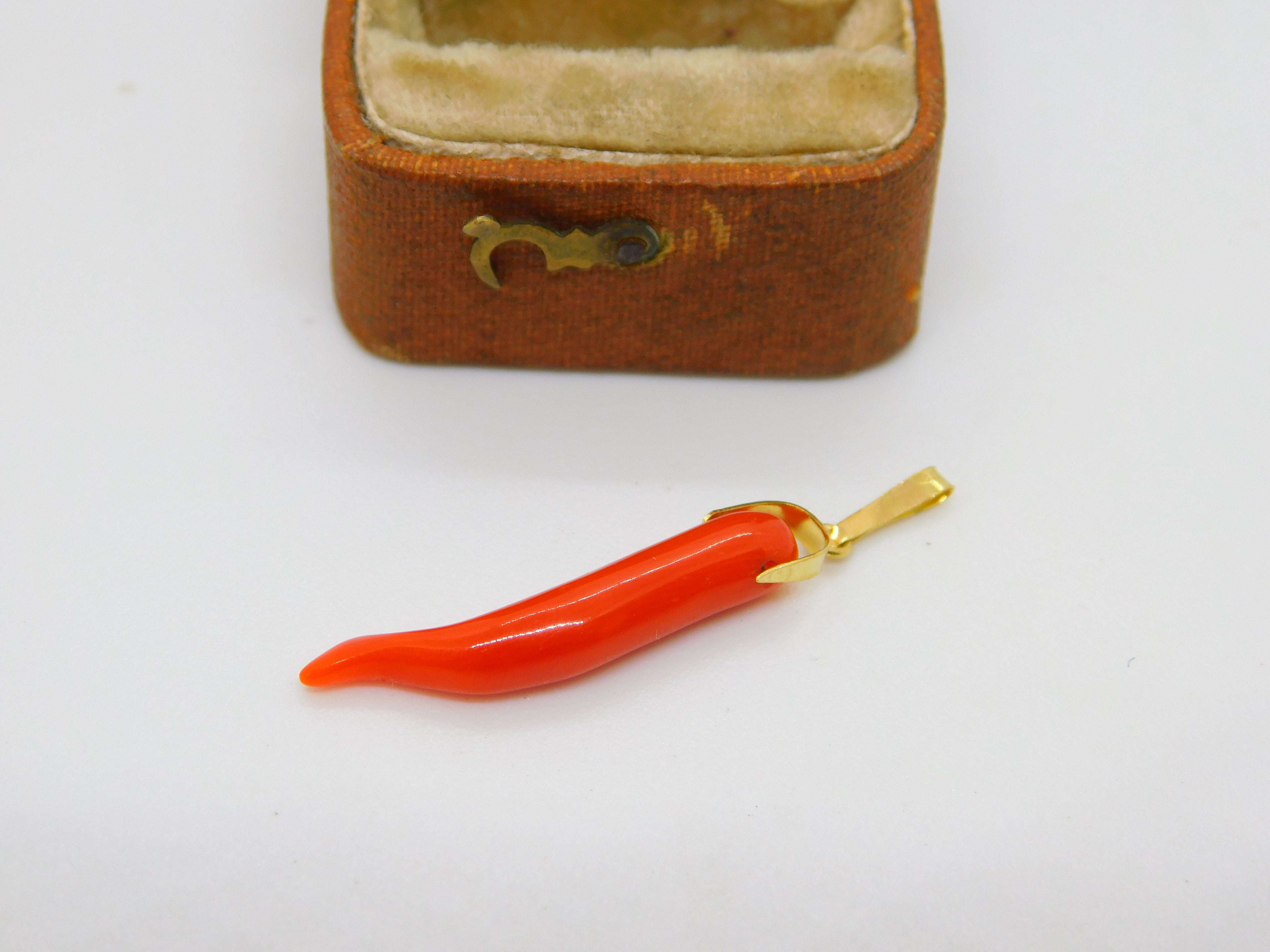 Italian 18ct Yellow Gold & Red Coral Cornicello Horn of Life Pendant Vintage