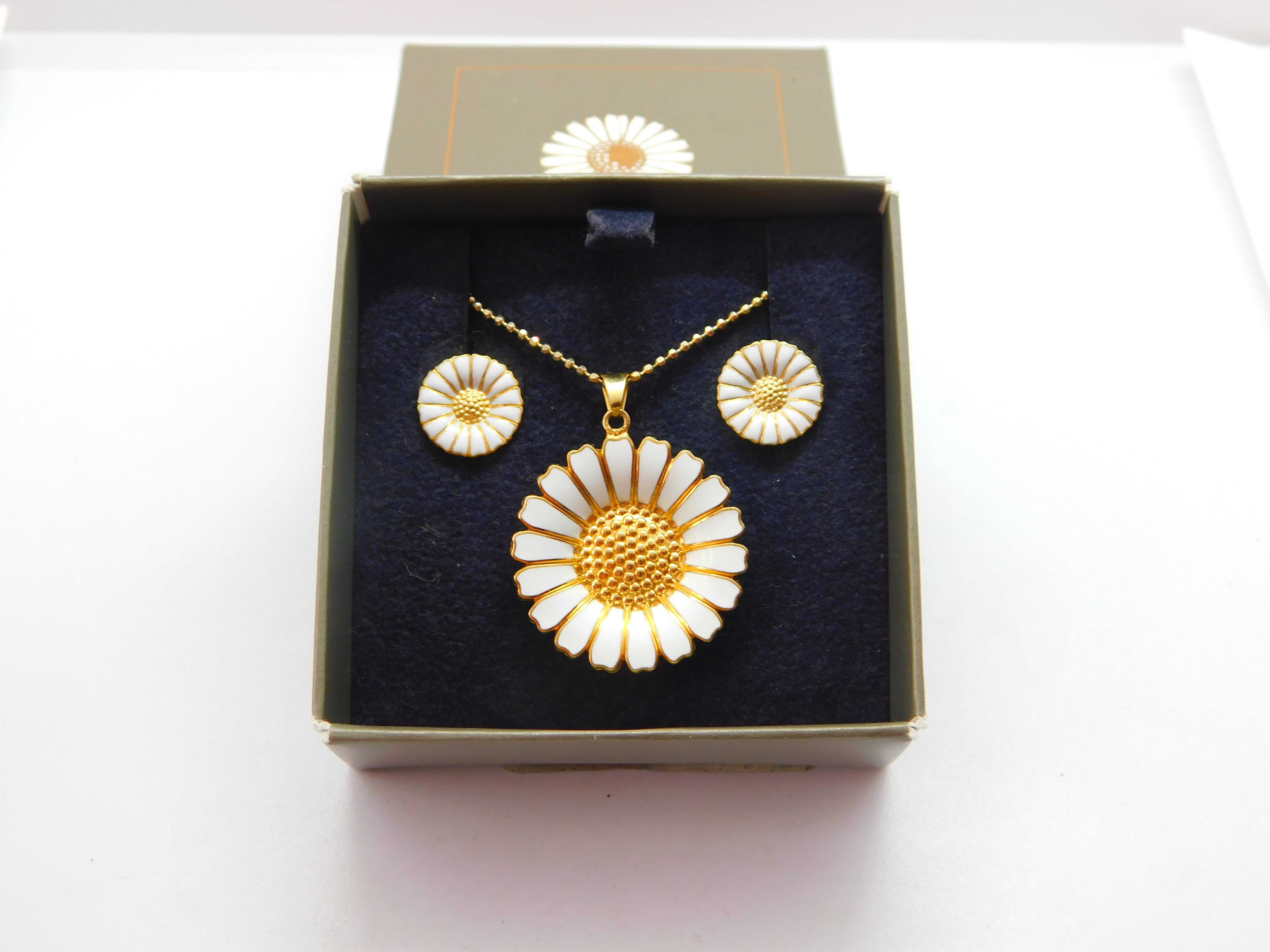 Georg Jensen Sterling Silver Enamel Daisy Necklace Earrings Suite Boxed Vintage