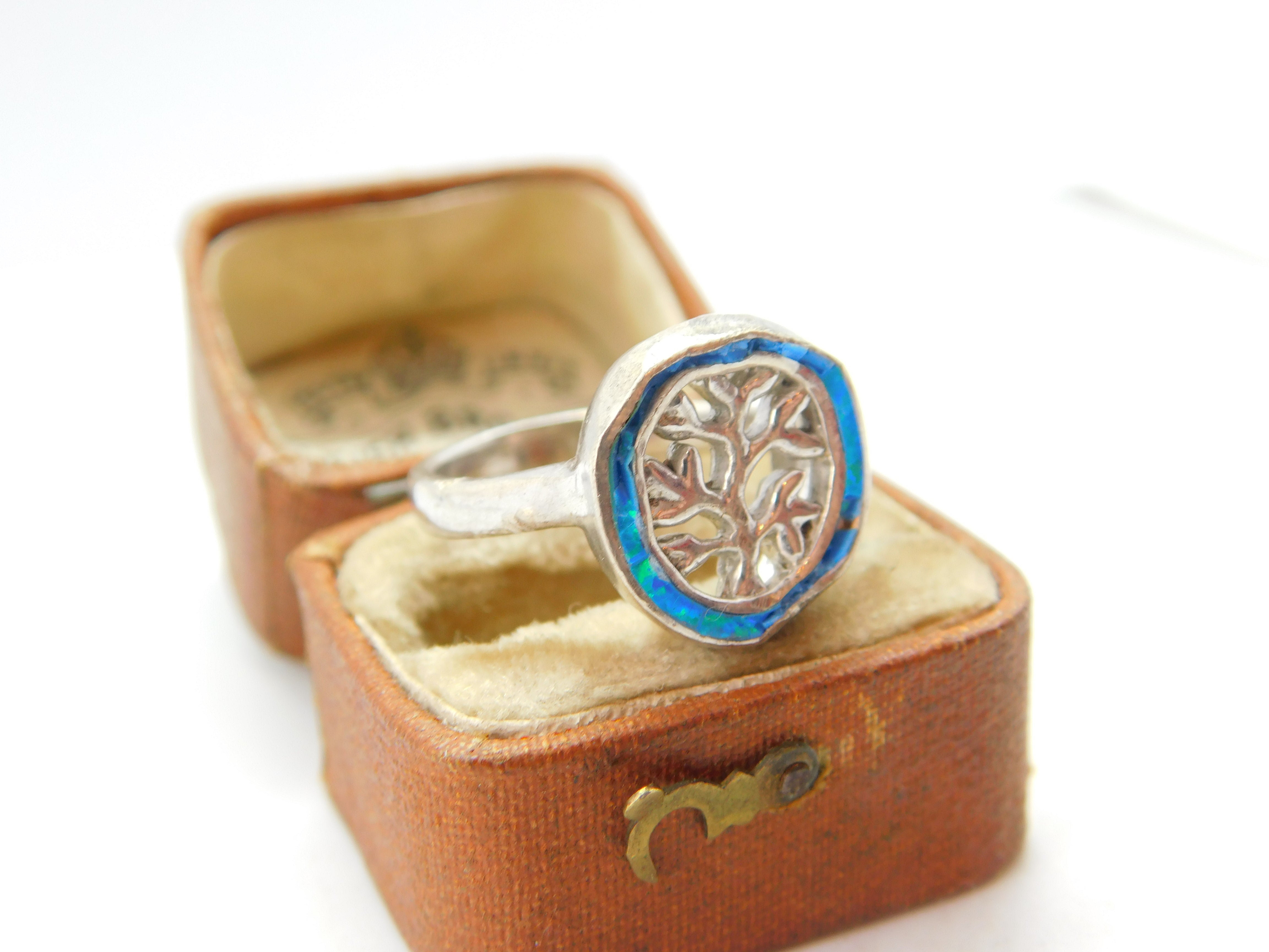Planished Sterling Silver & Greek Opal Tree of Life Ring Vintage c1990