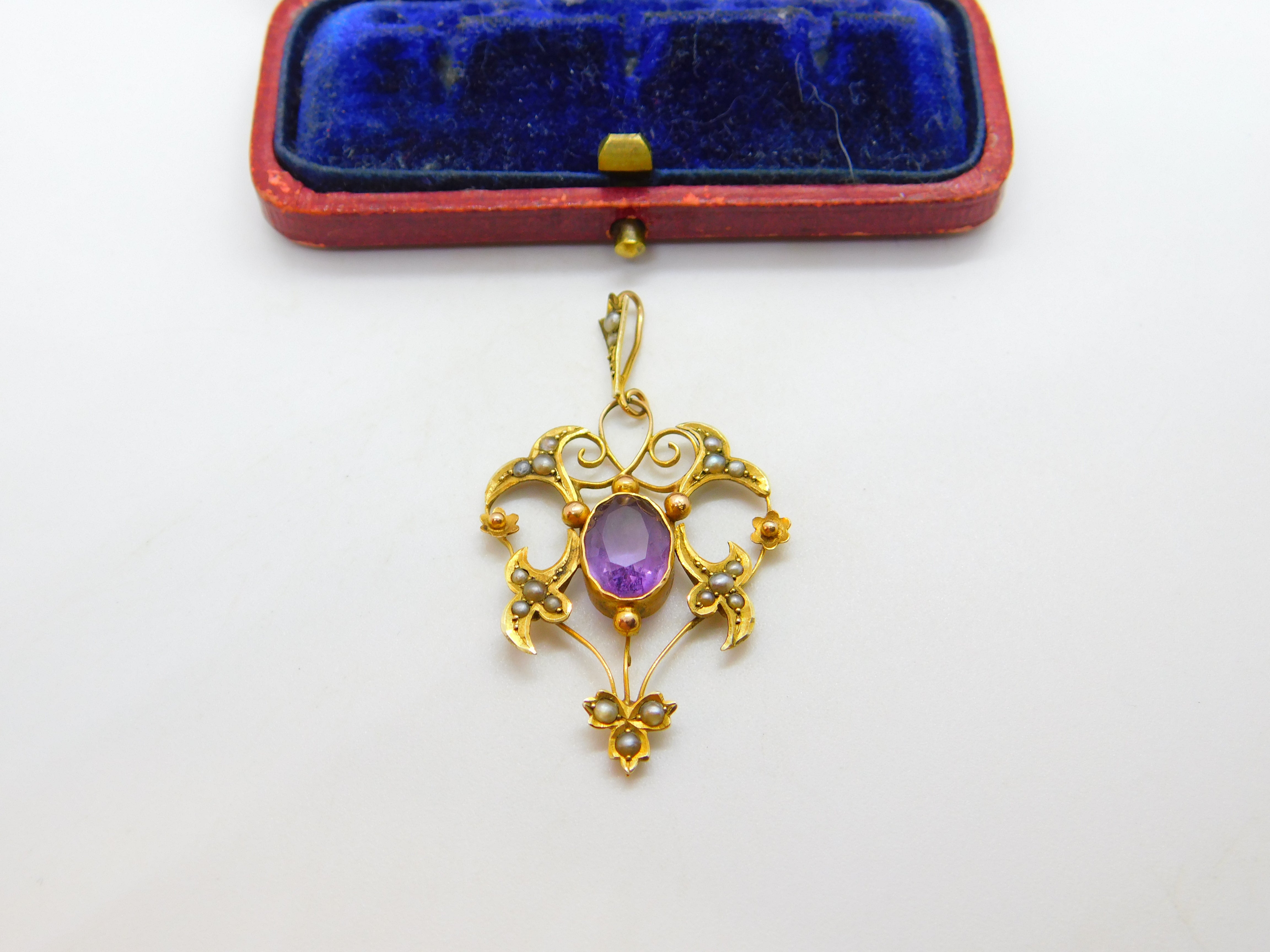 Amethyst, Seed Pearl 9ct Yellow Gold Dangling Pendant Lavalier Antique Victorian