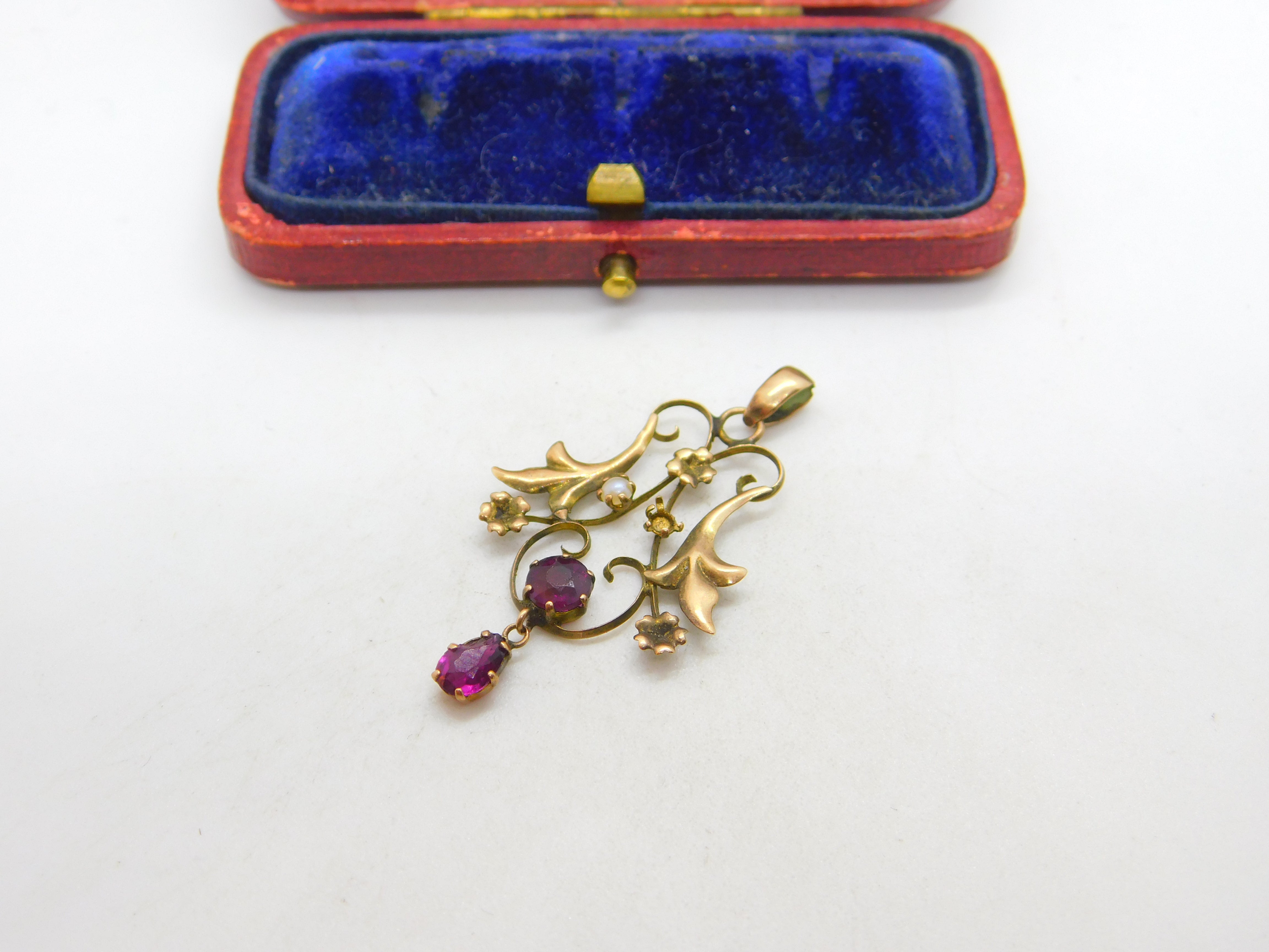 Edwardian 9ct Yellow Gold, Seed Pearl & Amethyst Lavalier Drop Pendant c1910