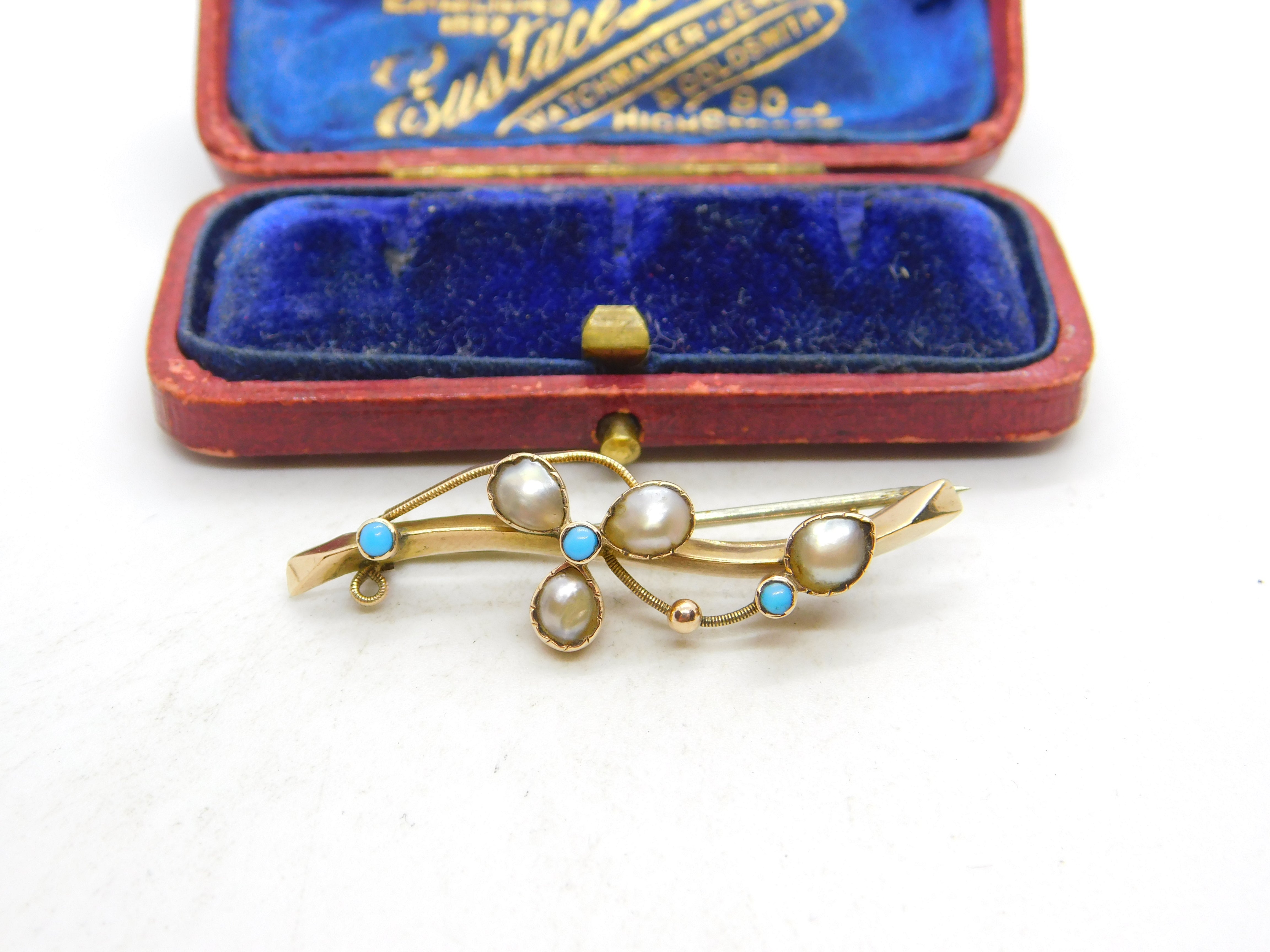 Edwardian 9ct Gold, Turquoise & Natural Pearl Shamrock Brooch 1902 Birmingham