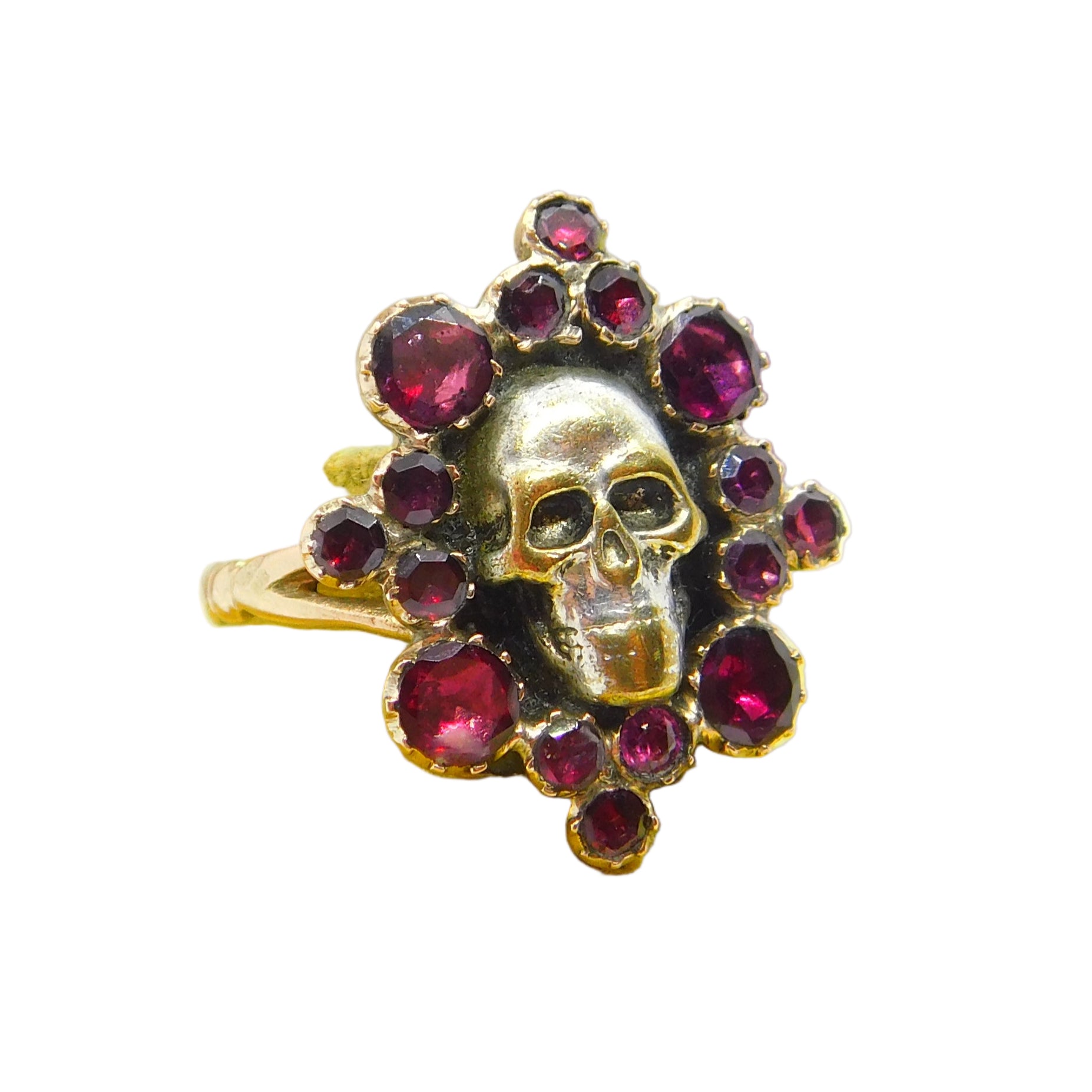 Early Georgian 9ct Gold, Almandine Garnet Set Memento Mori Mourning Skull Ring c1780