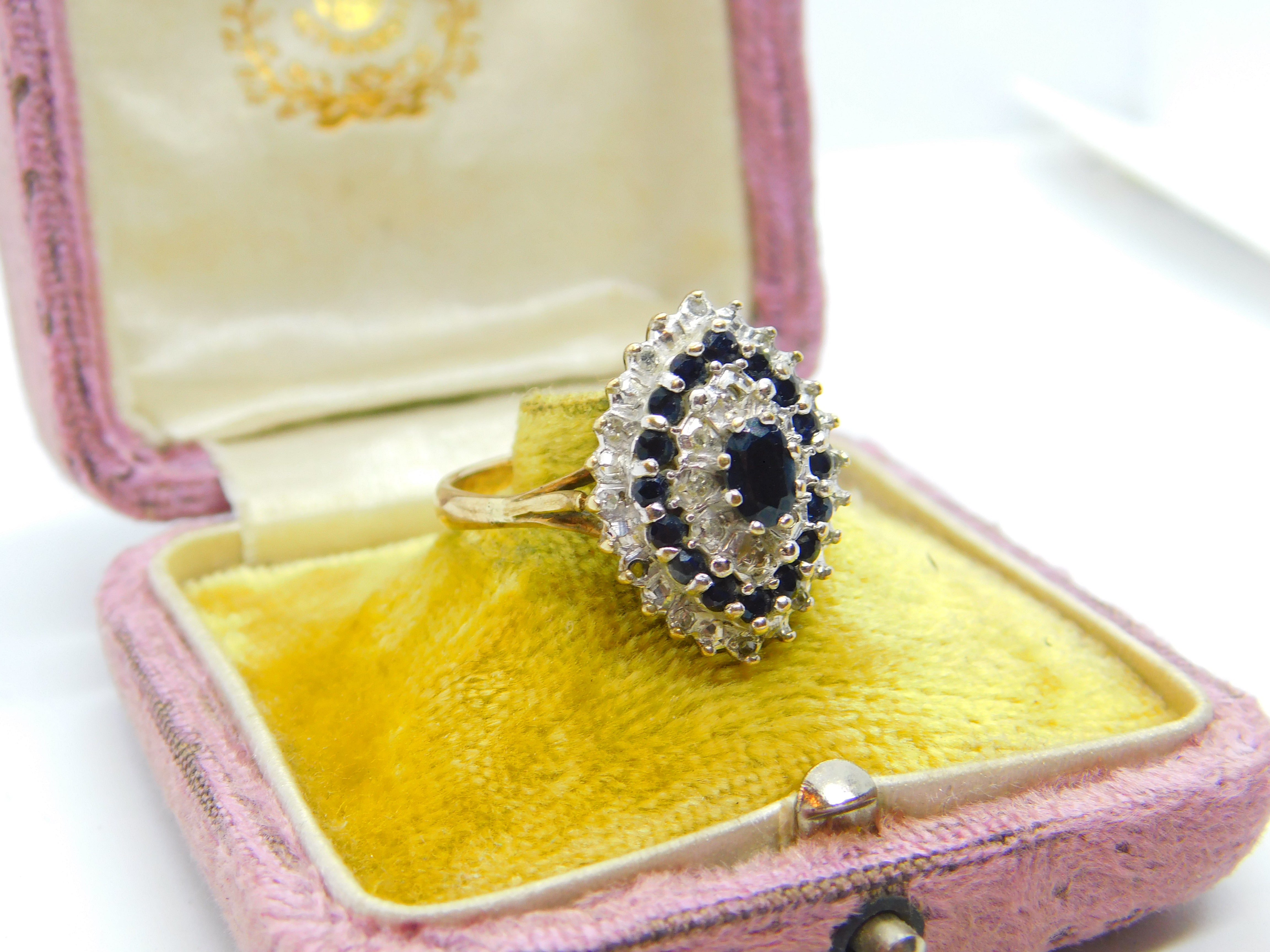 Large 9ct Yellow Gold Marquise Sapphire & Diamond Statement Ring c1930 Deco