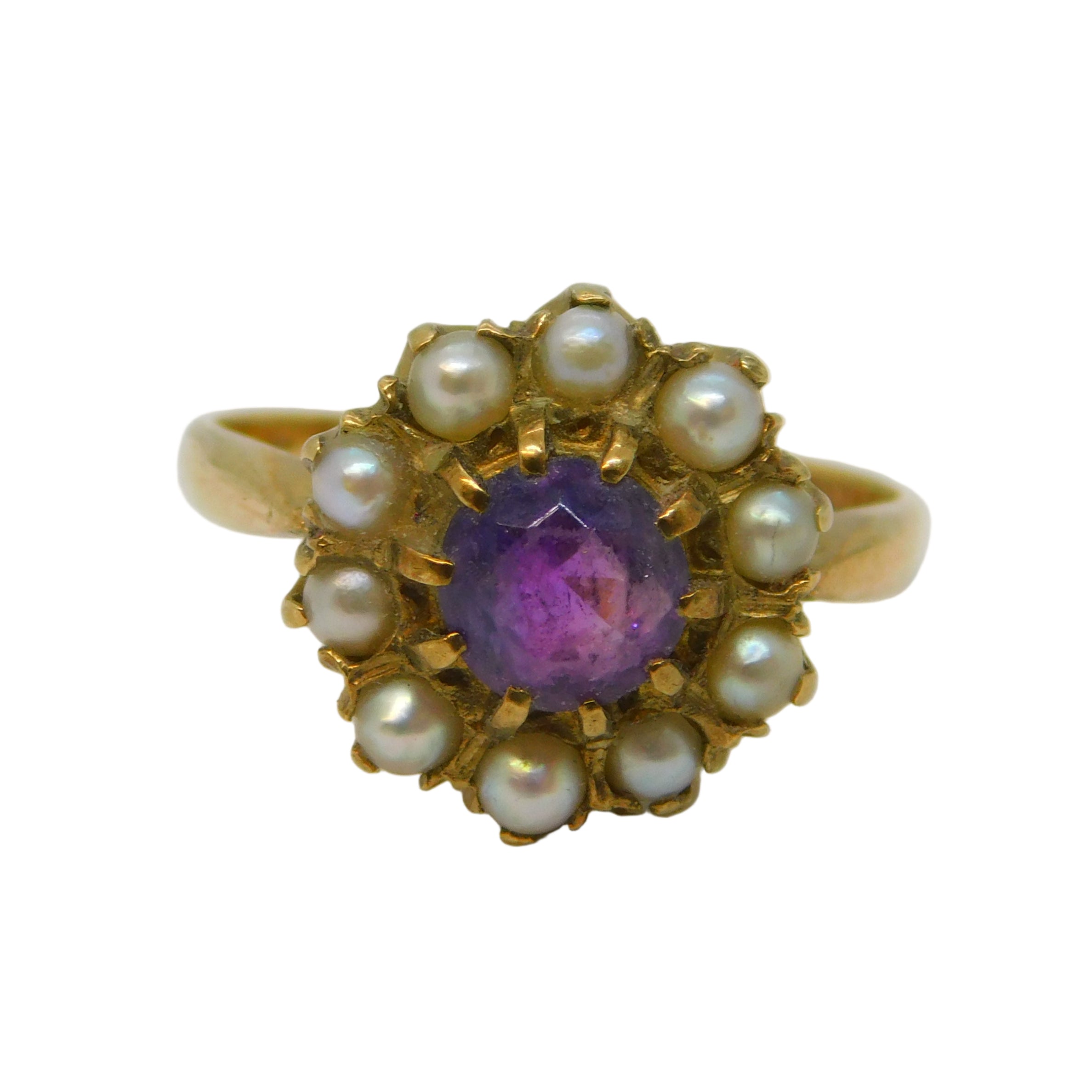 9ct Yellow Gold, Amethyst, Seed Pearl Floral Cluster Ring Vintage 1966 London