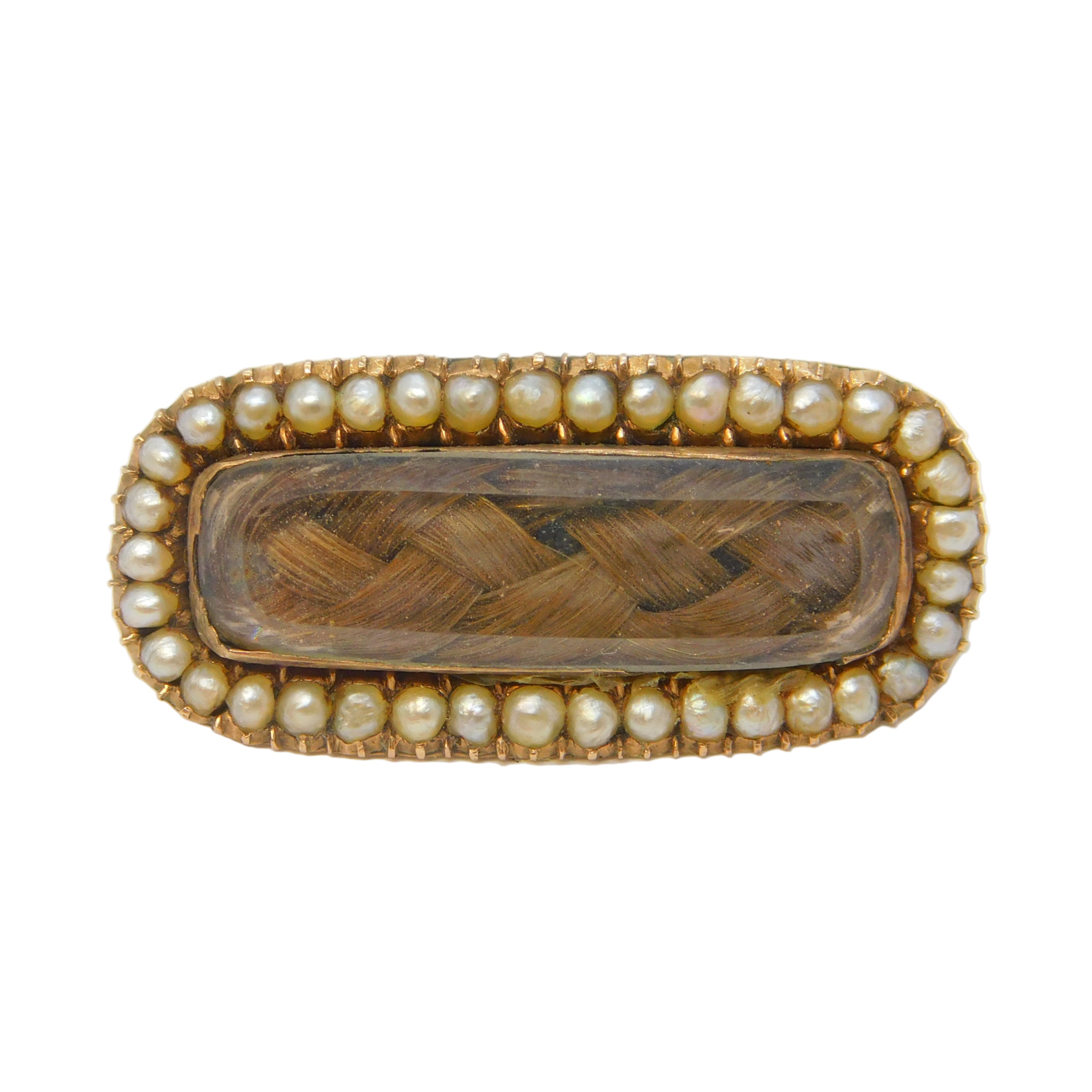George III 10ct Rose Gold, Seed Pearl, Hairwork Mourning Brooch Antique c1820