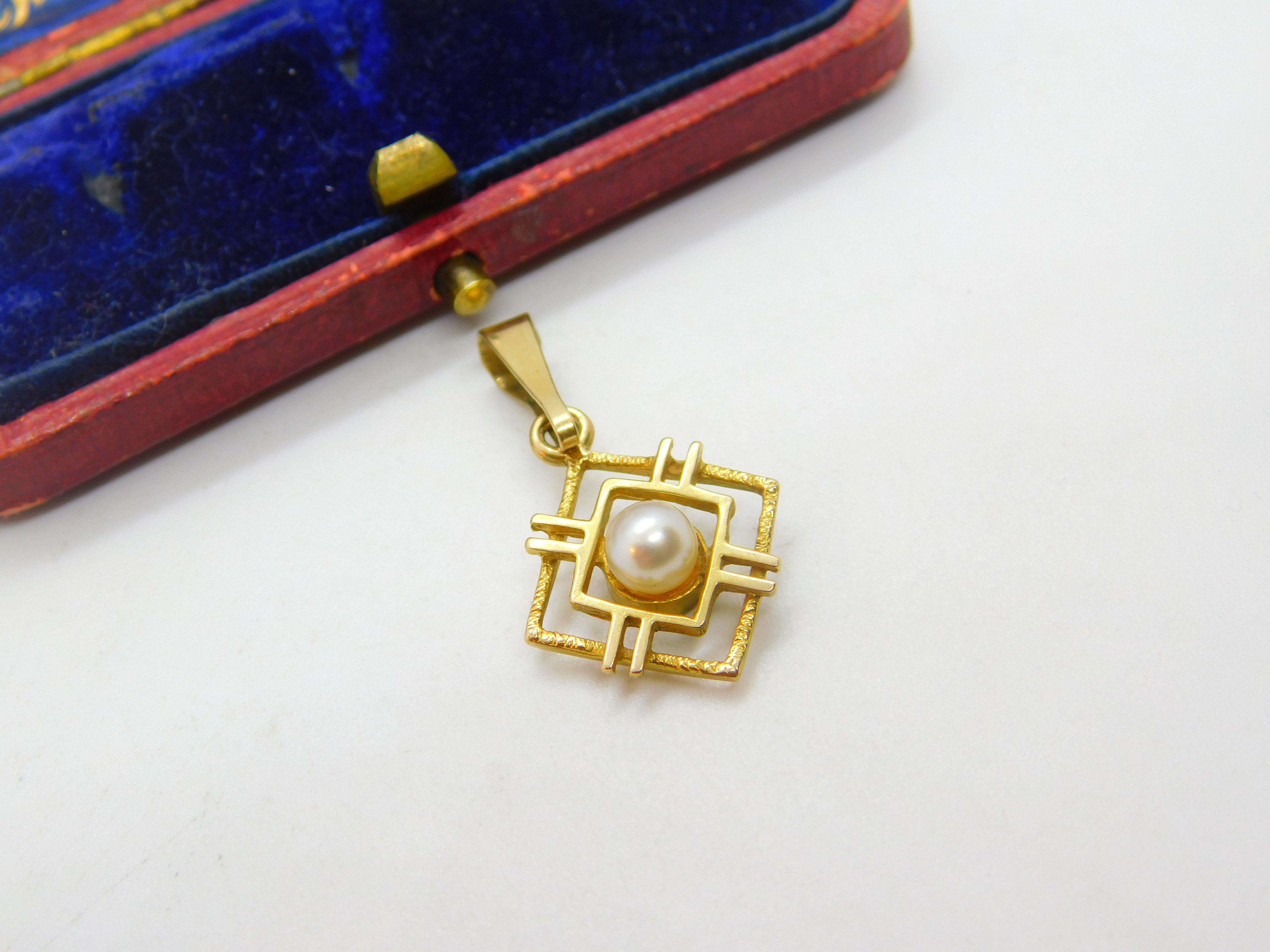 9ct Yellow Gold Modernist Pearl Set Deco Style Drop Pendant 1994 Birmingham