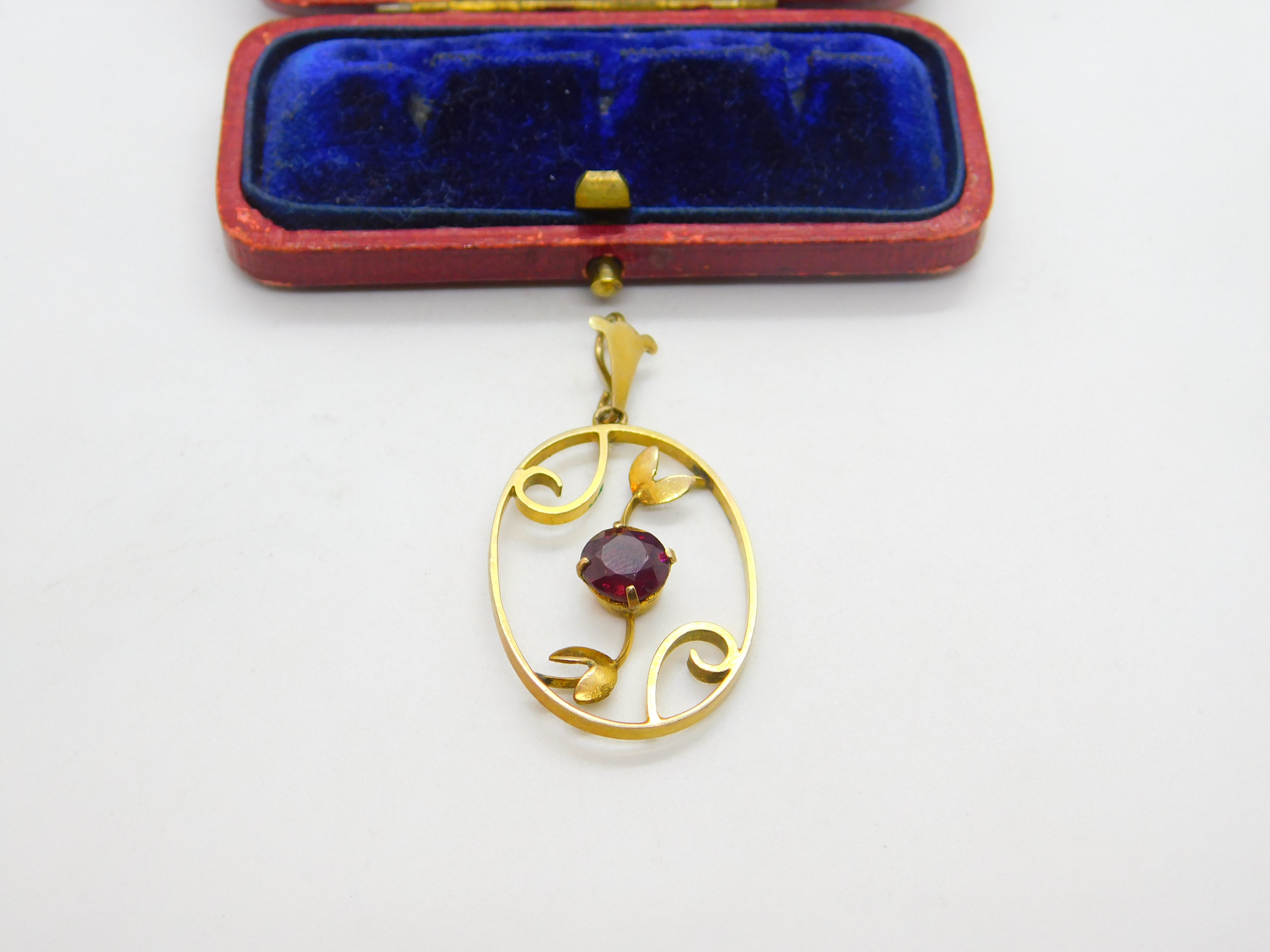 Edwardian 9ct Gold & Garnet Set Floral Pattern Lavalier Drop Pendant c1910