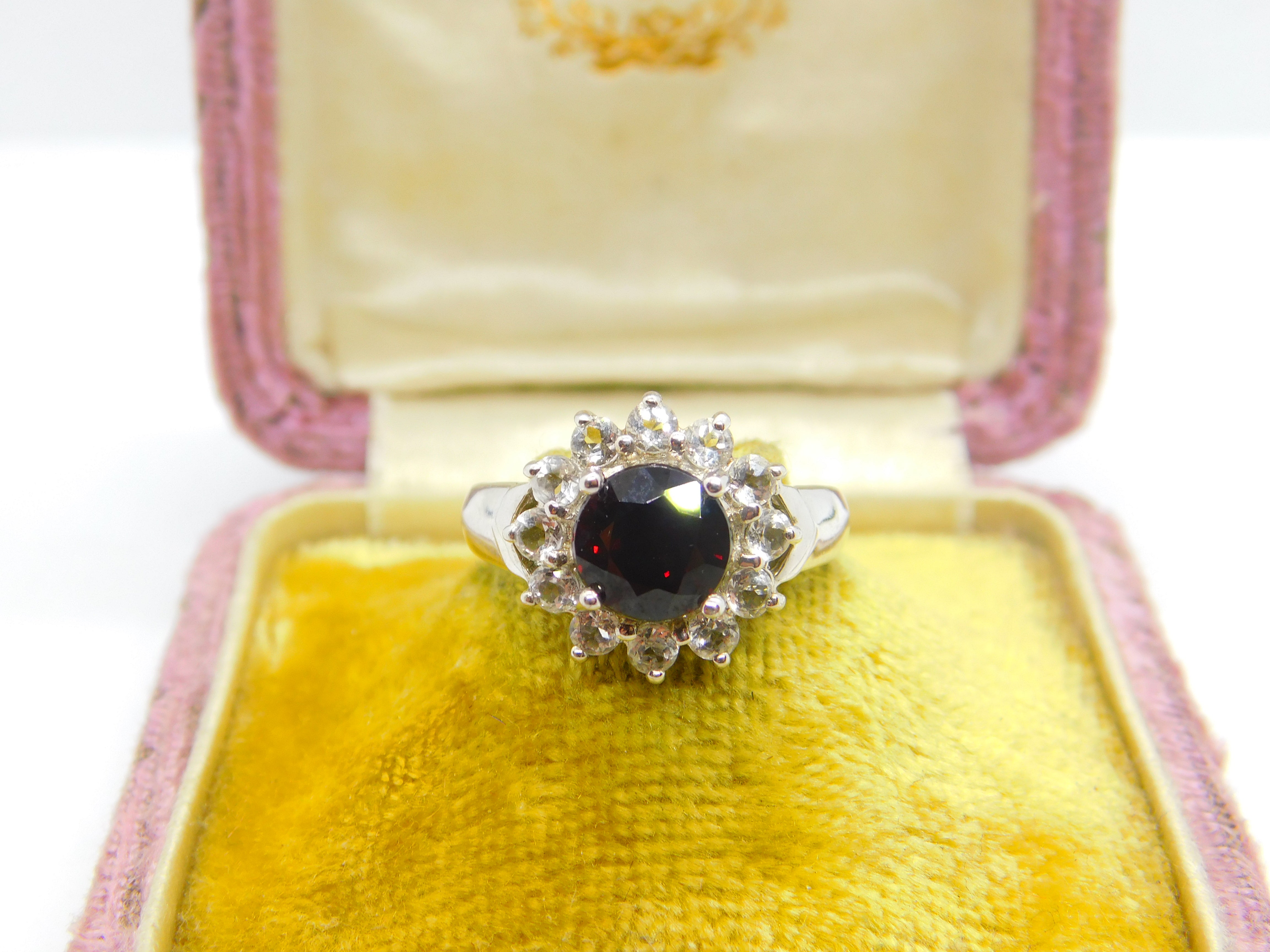 9ct White Gold, Garnet & White Sapphire Floral Cluster Ring Vintage 2006